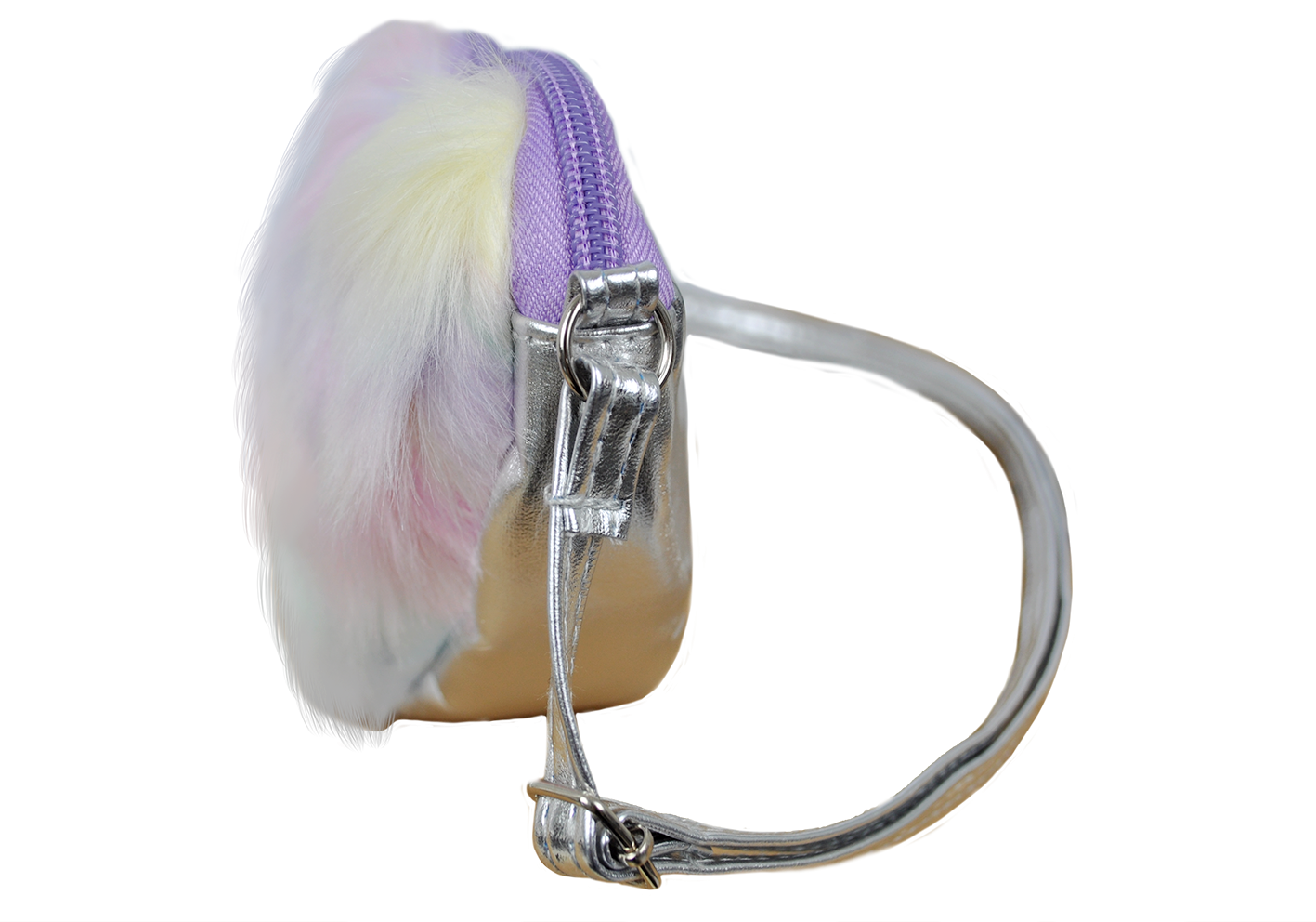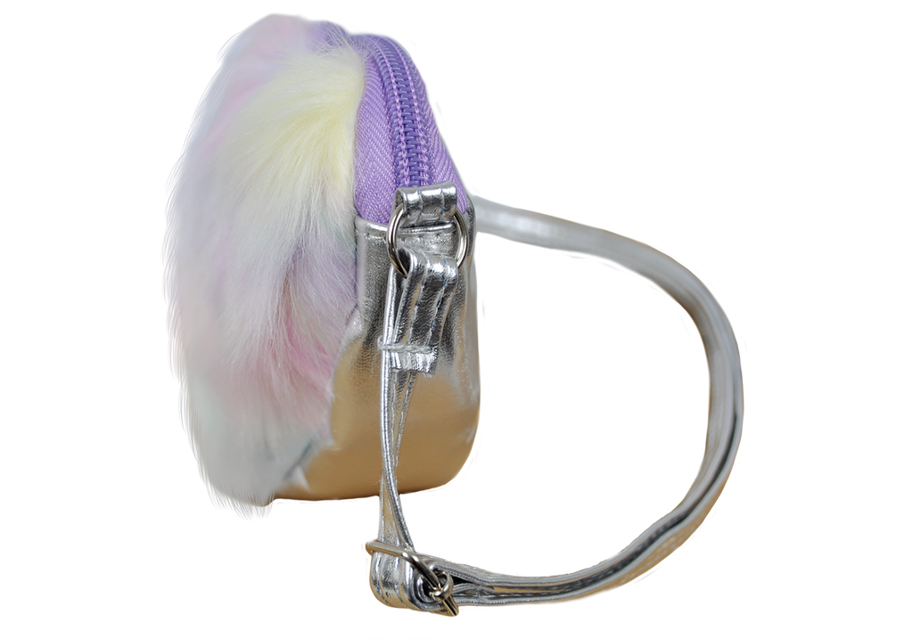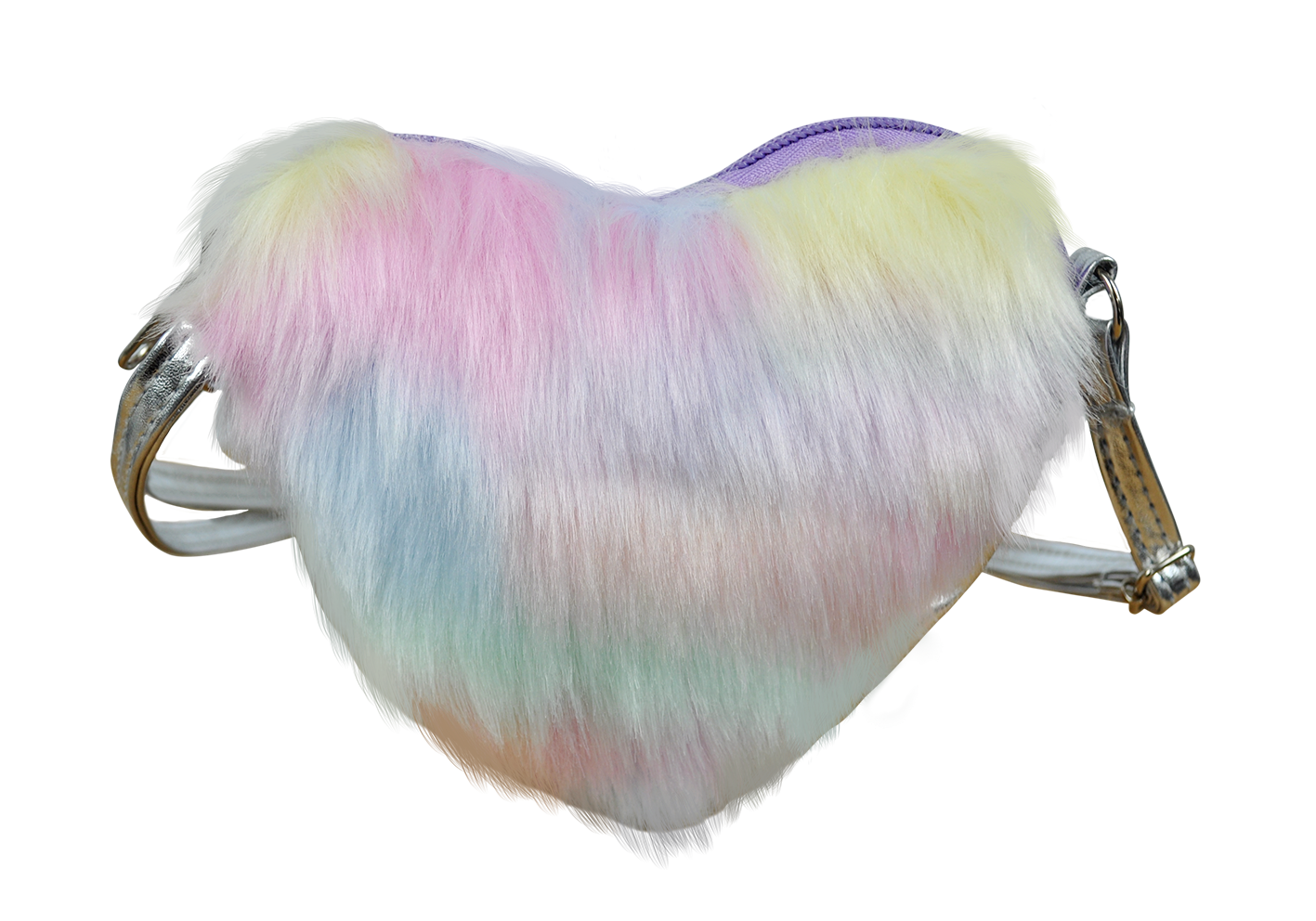 This heart-shaped shoulder bag stands out with its soft pastel fur that blends all the colours of the rainbow. The look is dreamy and cloud-like, giving it a magical feel. A delightfully playful little bag for kids who love soft textures, bright colours, and a touch of fantasy.
