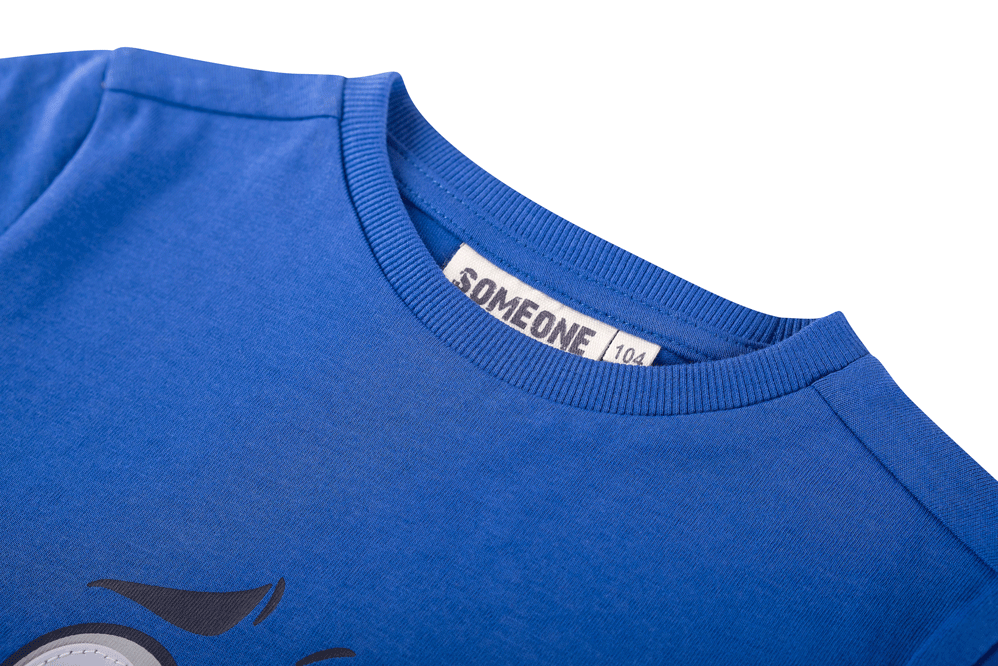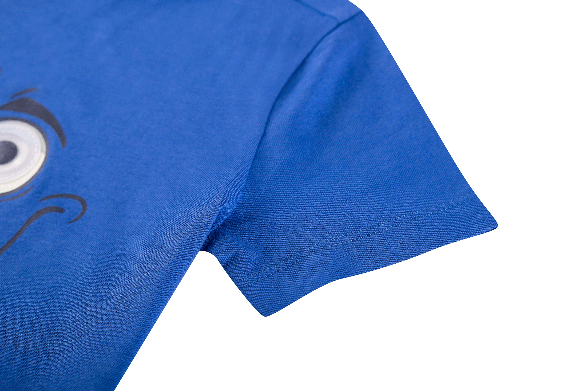 This blue T-shirt features a funny monster face on the chest, complete with googly eyes for an extra playful touch. The mix of color and expressive design makes it a real eye-catcher for kids who enjoy fun and unique clothing. Ideal for everyday wear with a humorous twist.