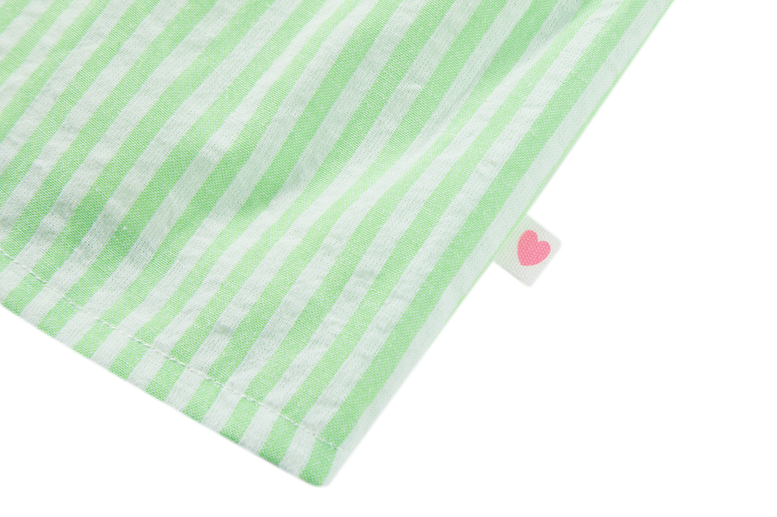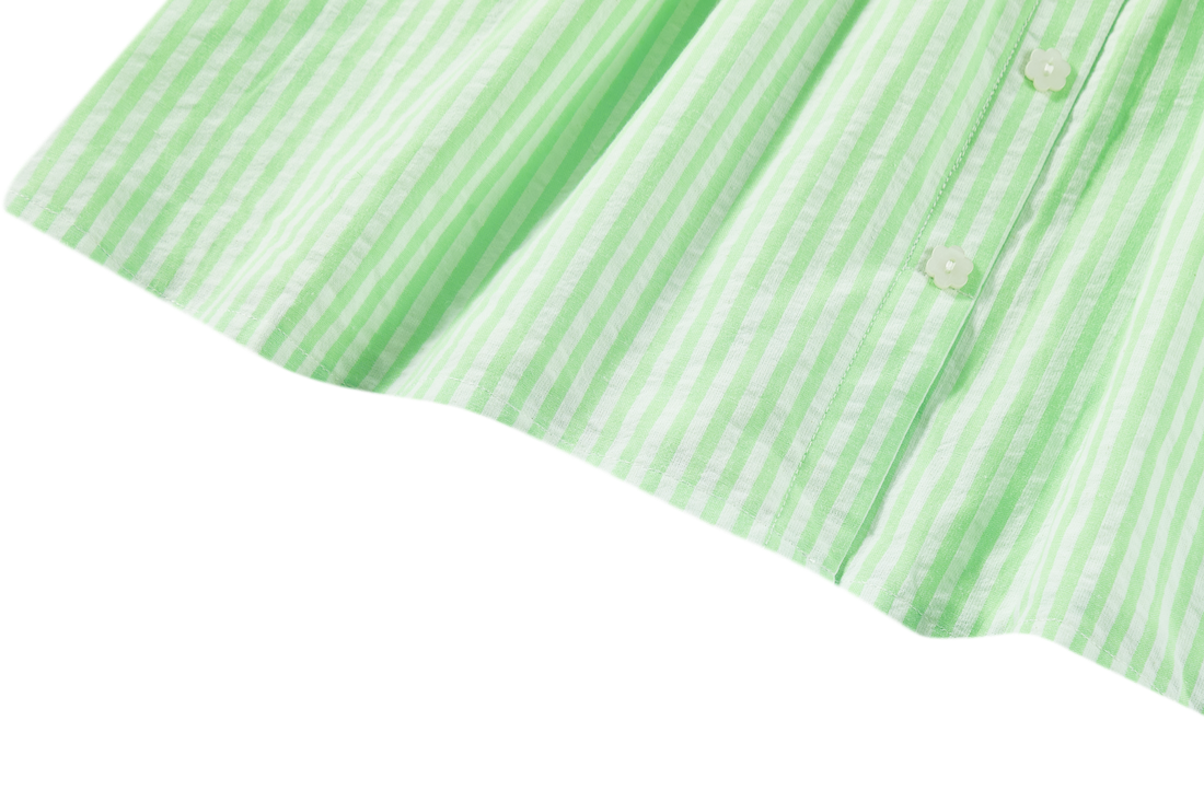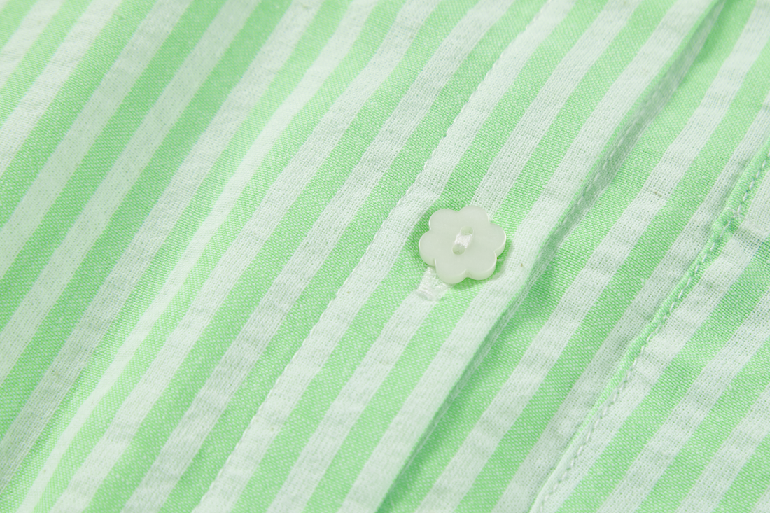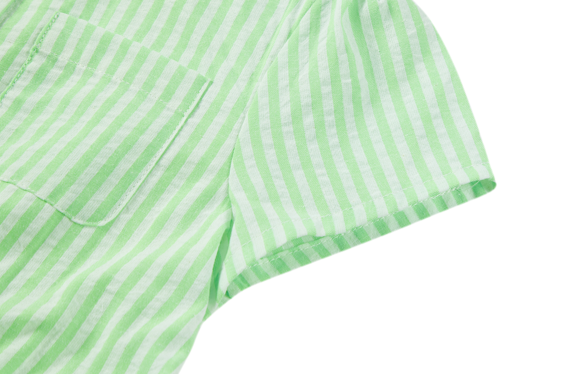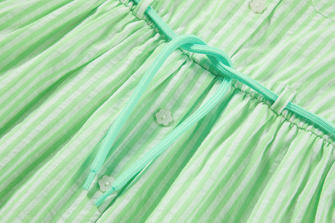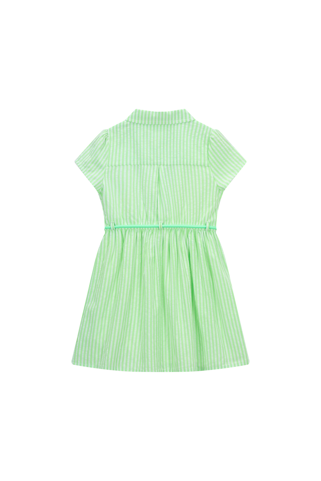 This fresh dress stands out with its mint-green stripes and classic collar, giving it a neat yet playful look. The waist tie pulls the shape together nicely, while the front buttons add a timeless touch. A perfect summer dress for kids who like something light and cheerful to wear.