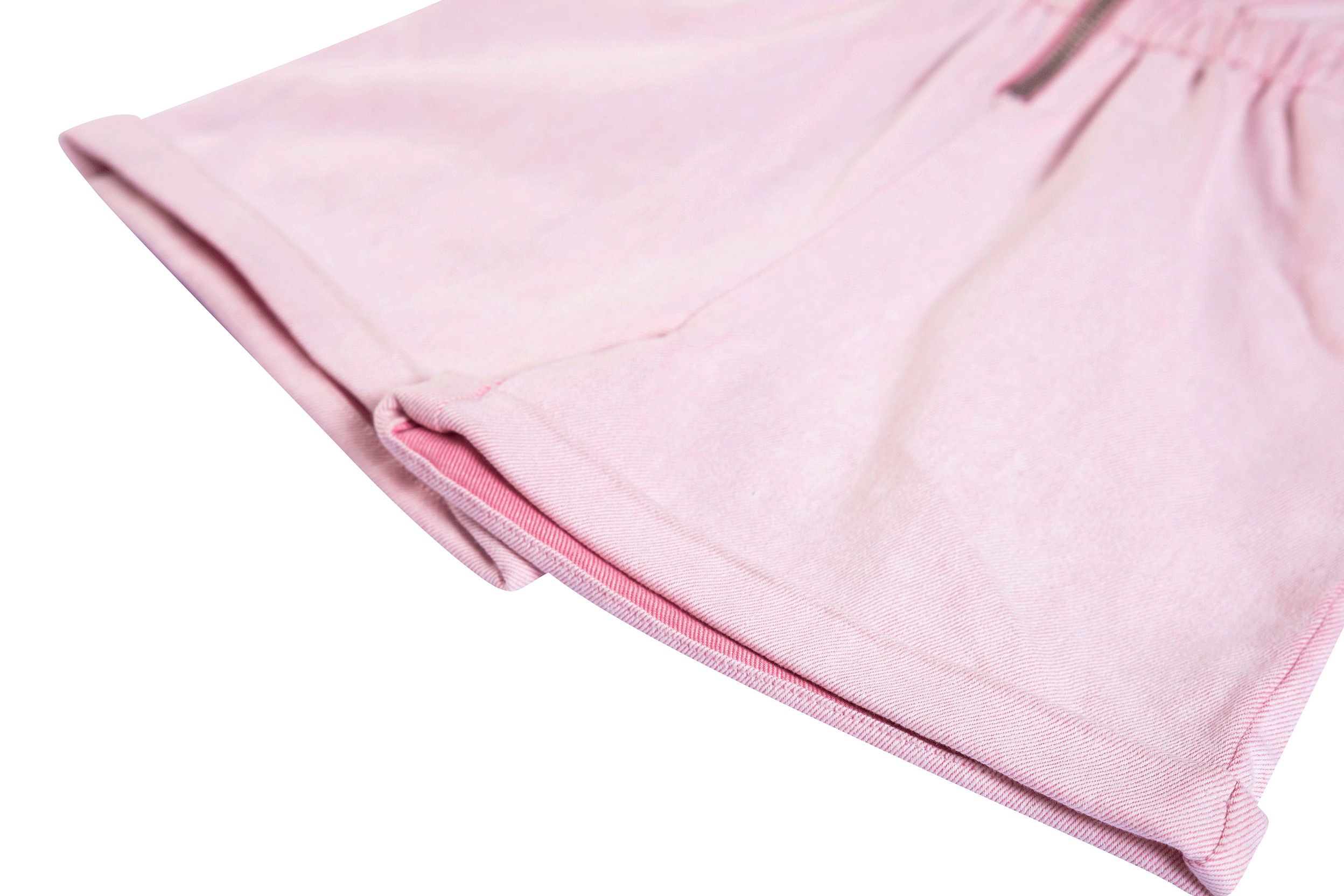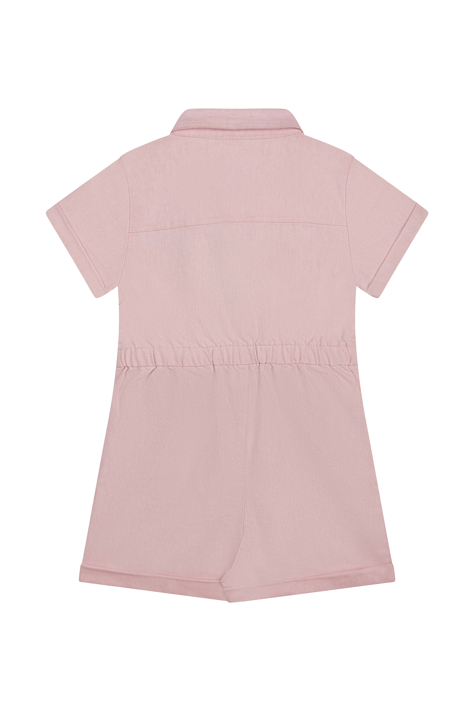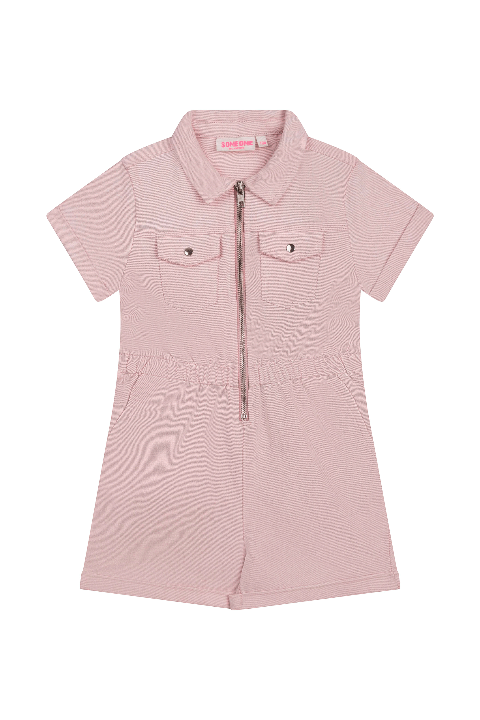 A soft pink short-sleeved jumpsuit with a neat collar and a practical front zipper. The buttoned chest pockets add a touch of attitude, and the elastic waistband keeps the fit comfortable and flattering. Perfect for days when your child wants an easy, stylish outfit.