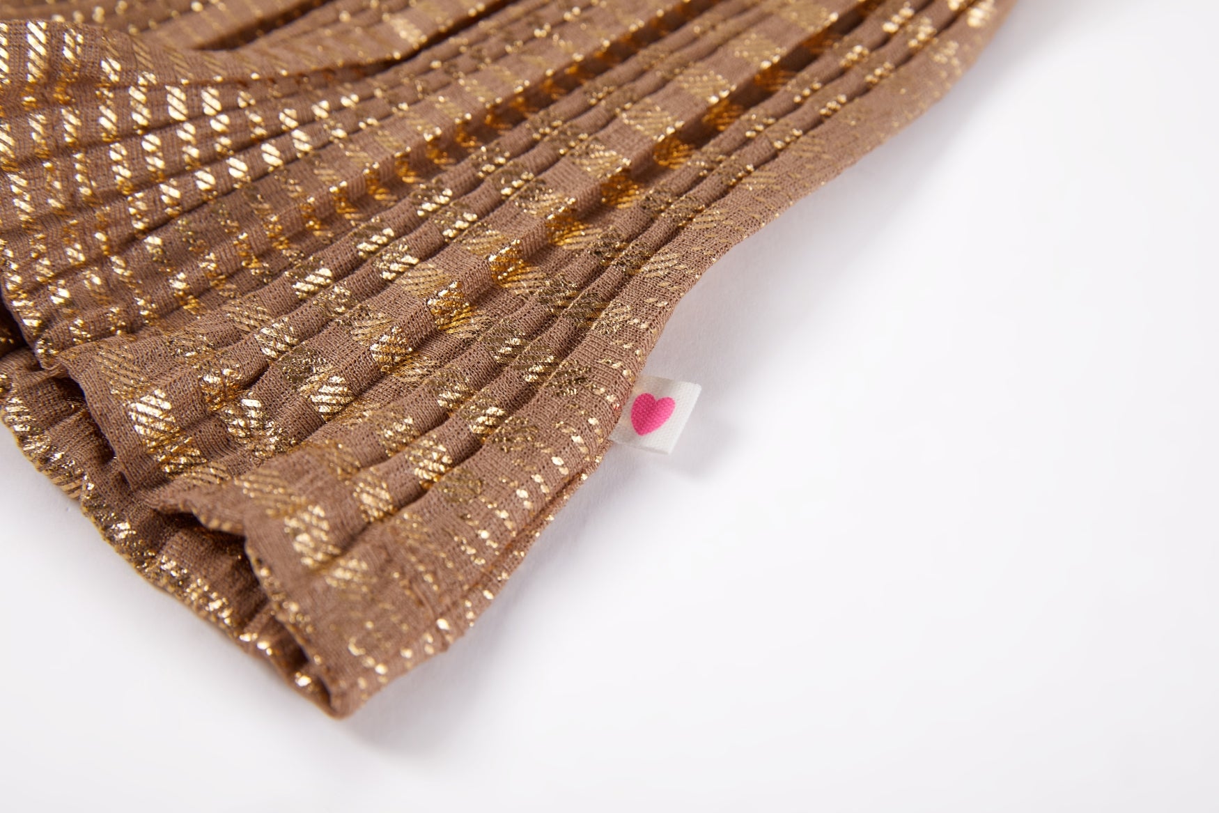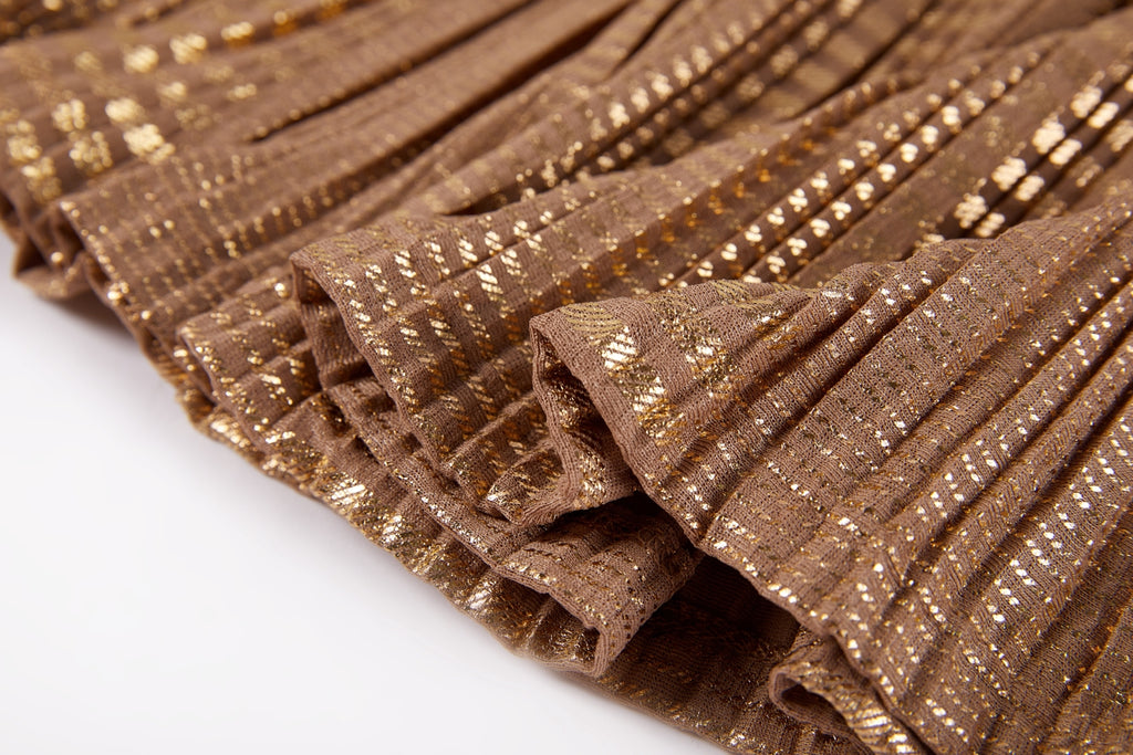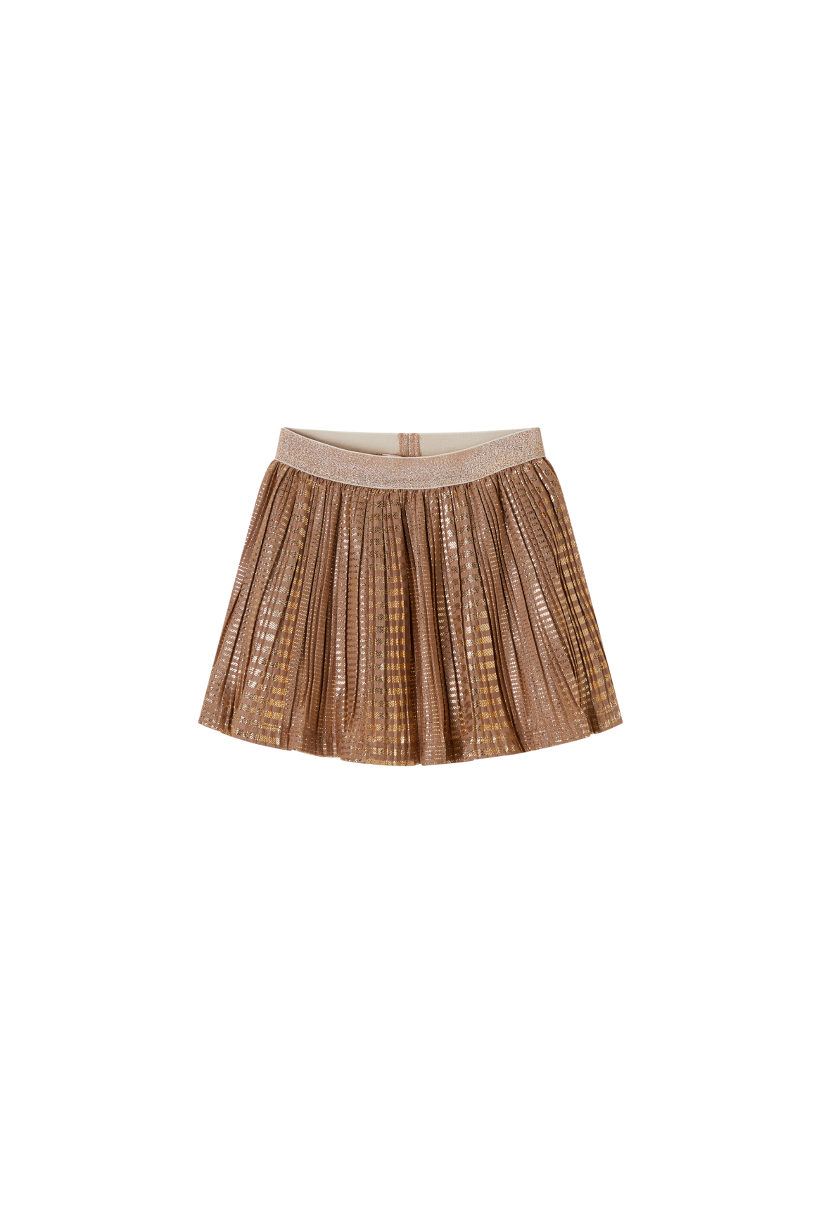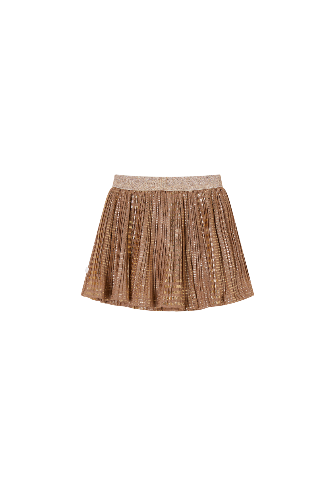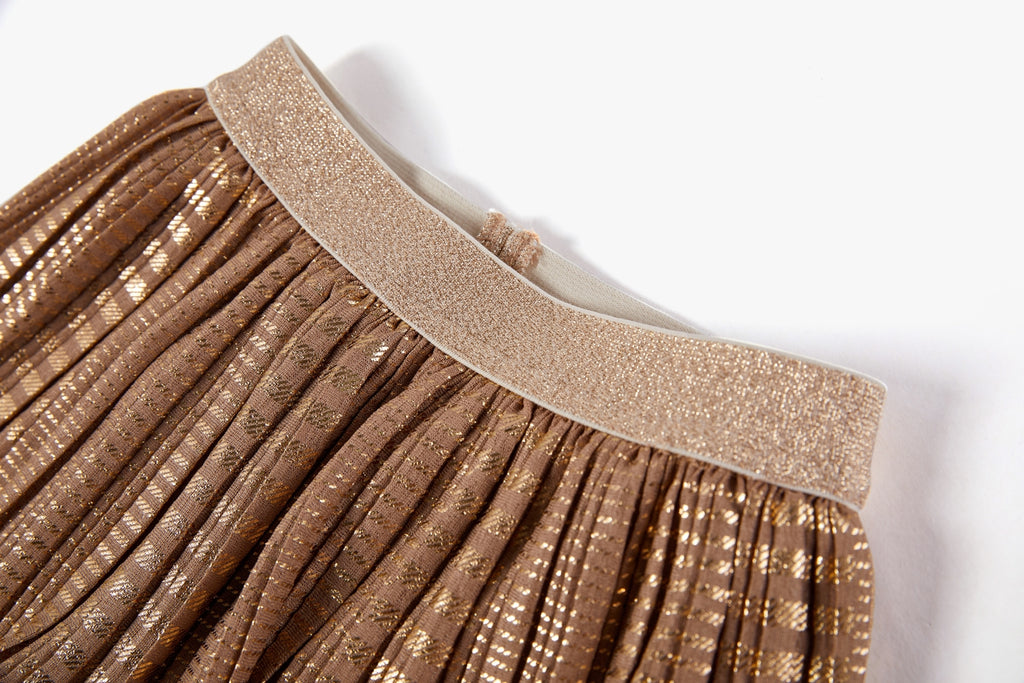 This skirt combines elegance and playfulness with its shimmering pleated layer that catches the light beautifully. The warm bronze shade adds a refined touch, while the glitter waistband brings a hint of festive sparkle. A perfect choice for kids who love wearing pieces with just a little extra flair.