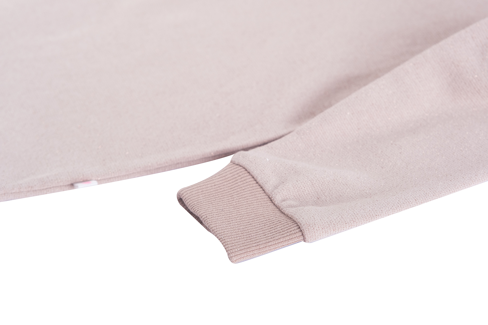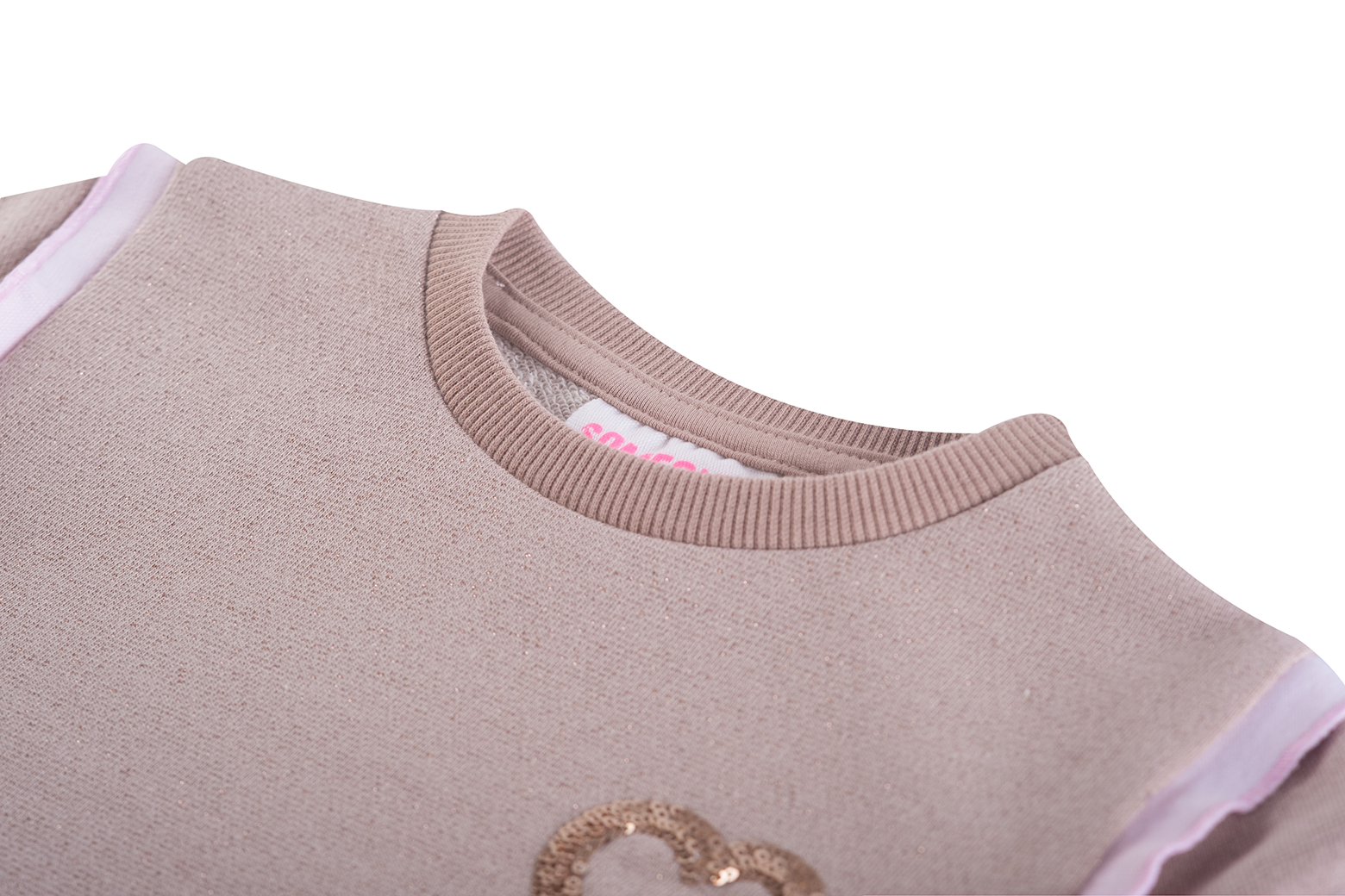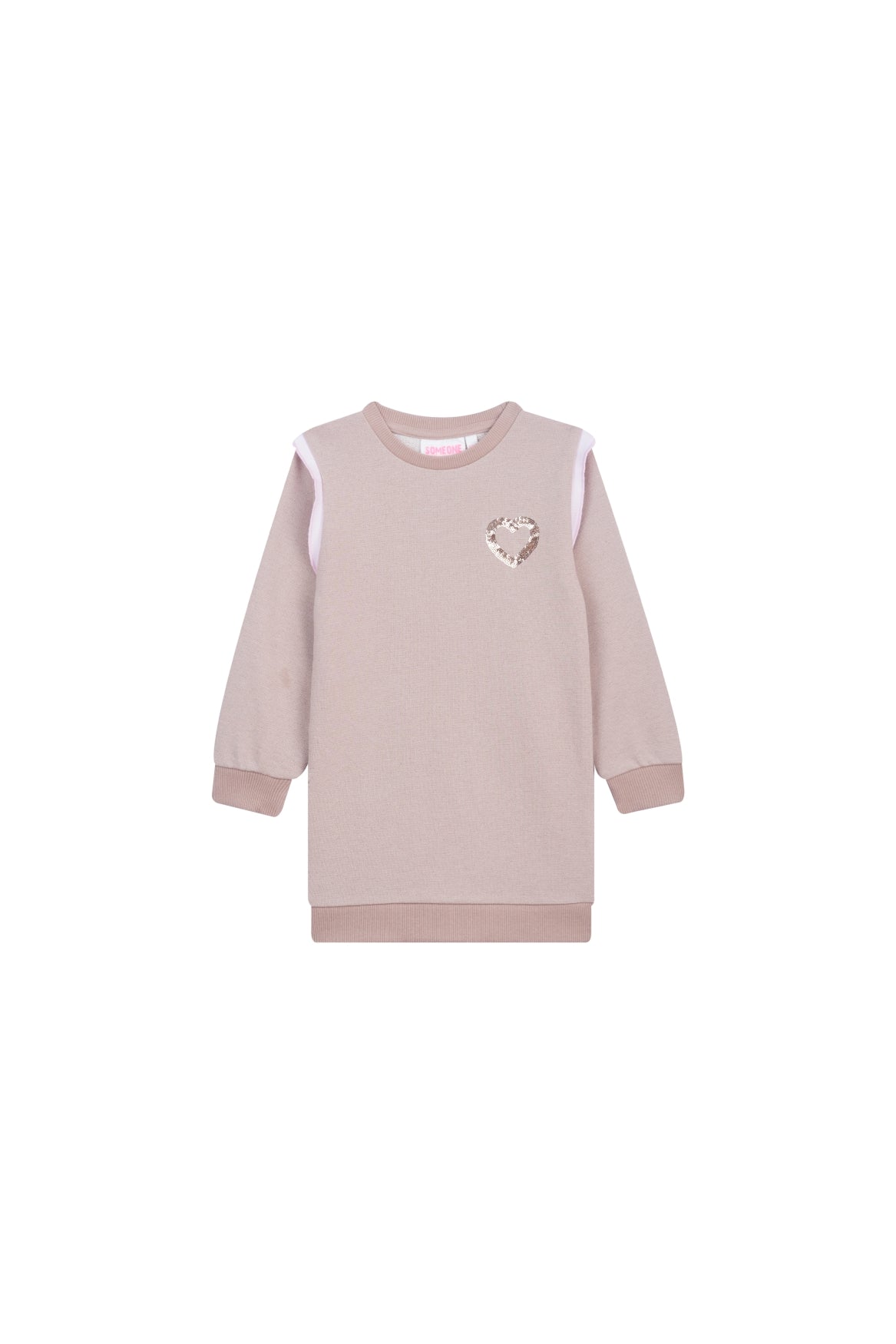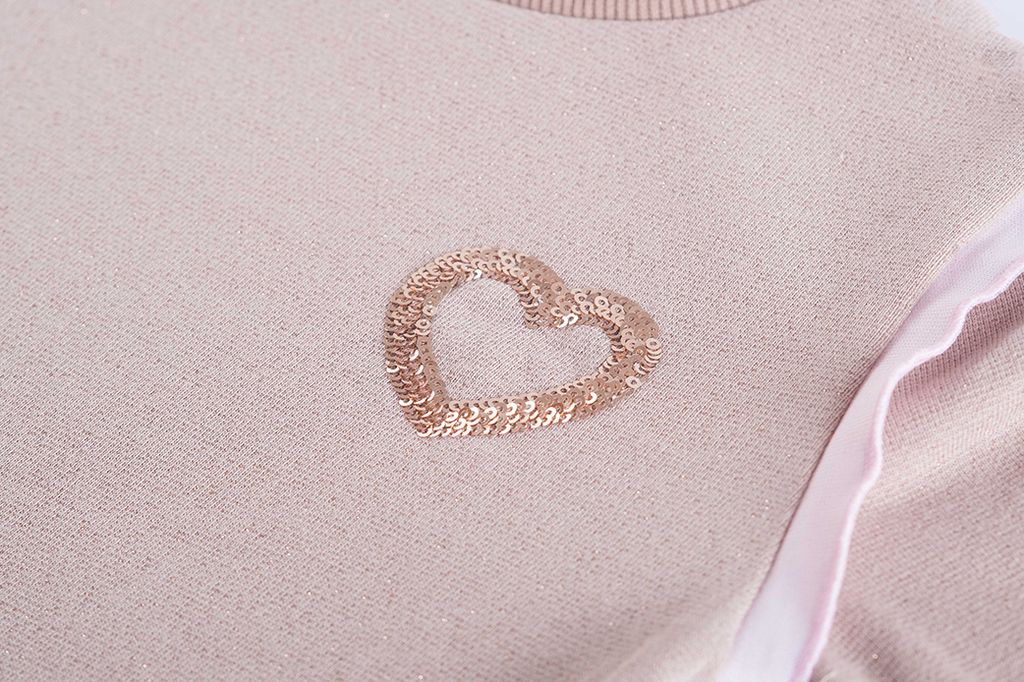 This soft light-pink sweater dress has a calm and stylish look. The small sequin heart on the chest adds a sparkling detail that gives the design a sweet, playful touch. The contrasting white shoulder inserts create a modern accent that makes the piece stand out. With its long sleeves and comfortable fit, this is a perfect everyday item — both cozy and charming.