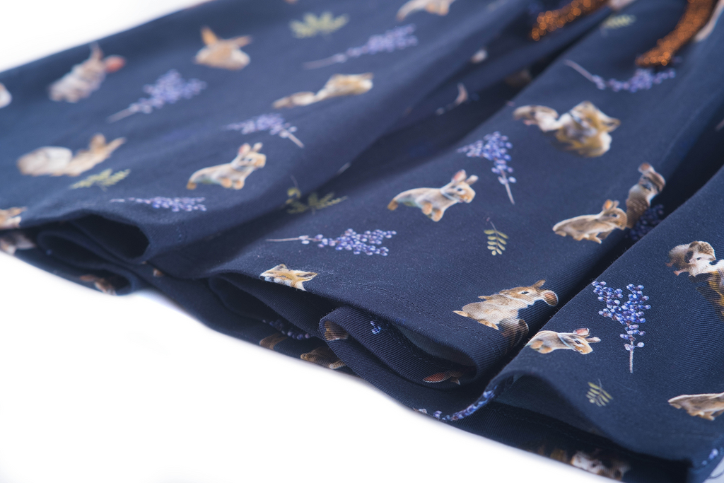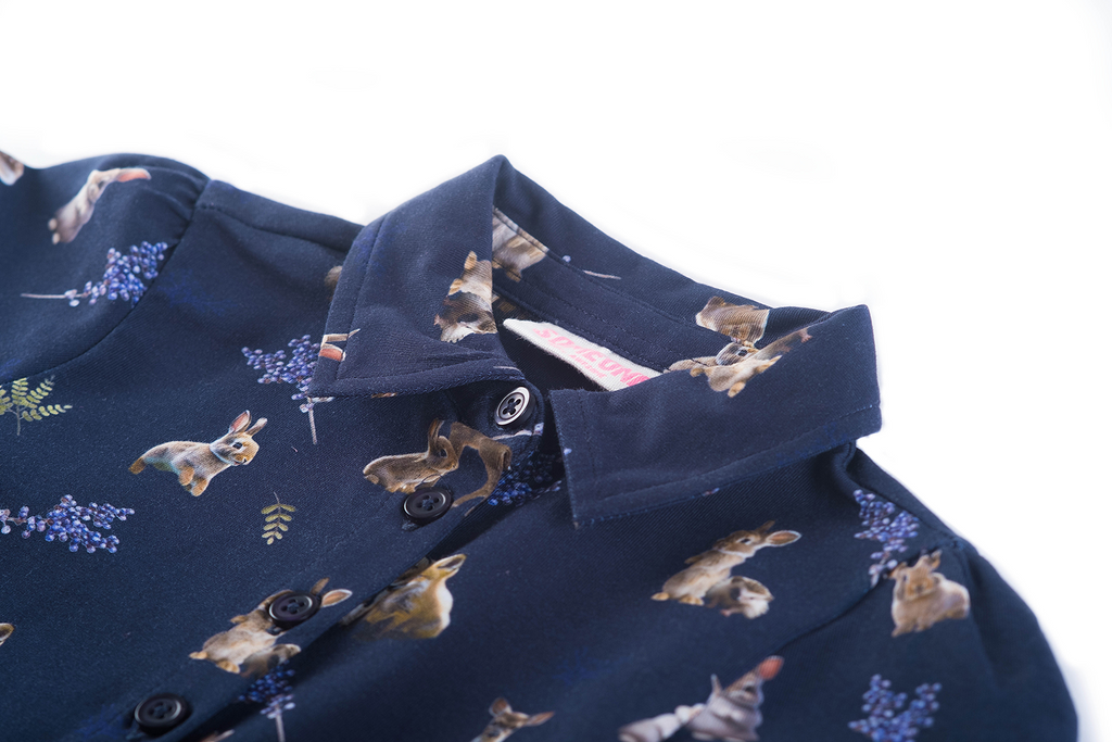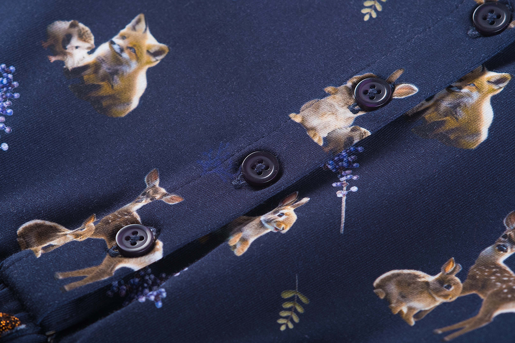 This dark blue dress features an adorable all-over print of woodland animals, including deer, rabbits, and hedgehogs, giving it a warm and playful look. The collar and front buttons lend a neat, classic touch, while the tie detail at the waist creates a flattering silhouette with a hint of charm. With its long sleeves, this dress is perfect for any season. A lovely choice for young nature and animal lovers.
