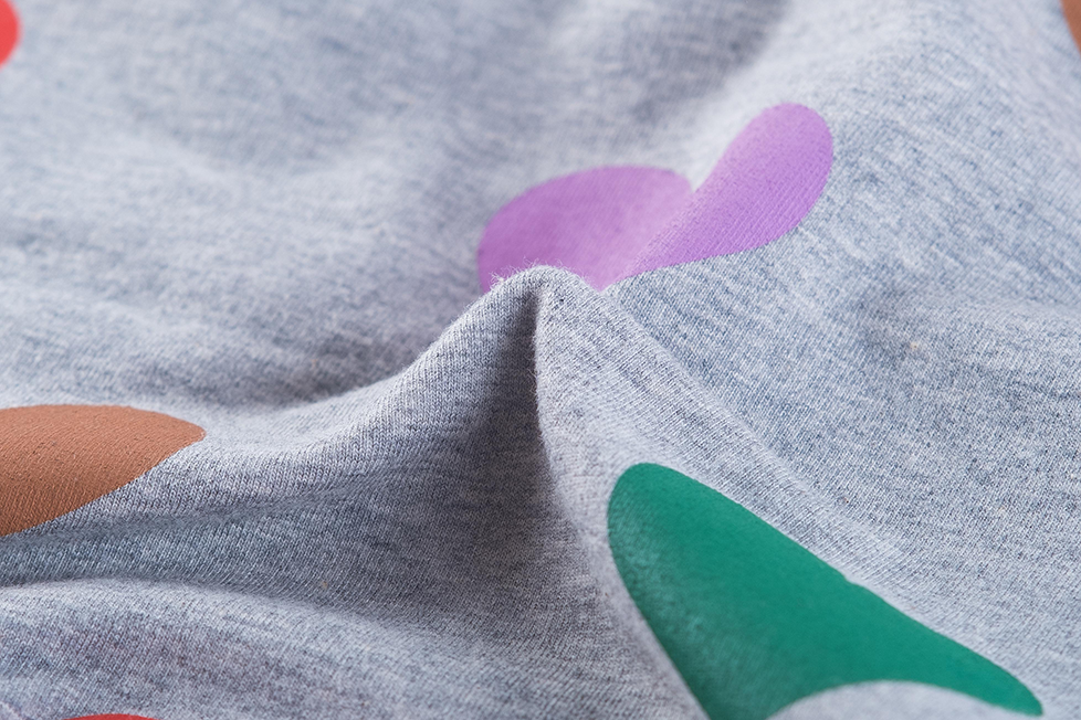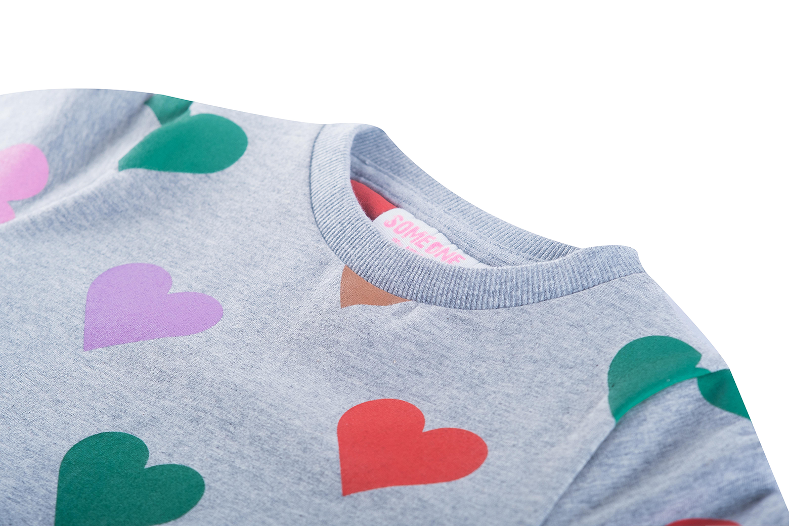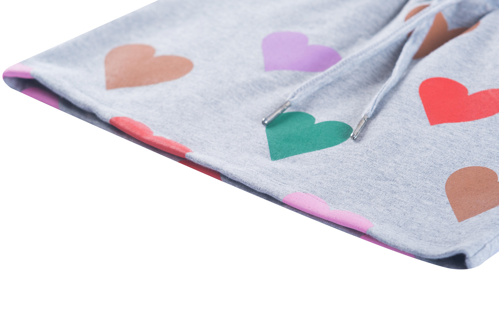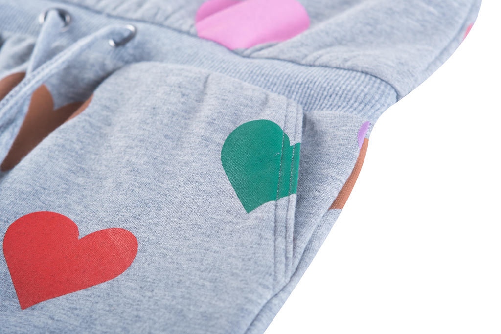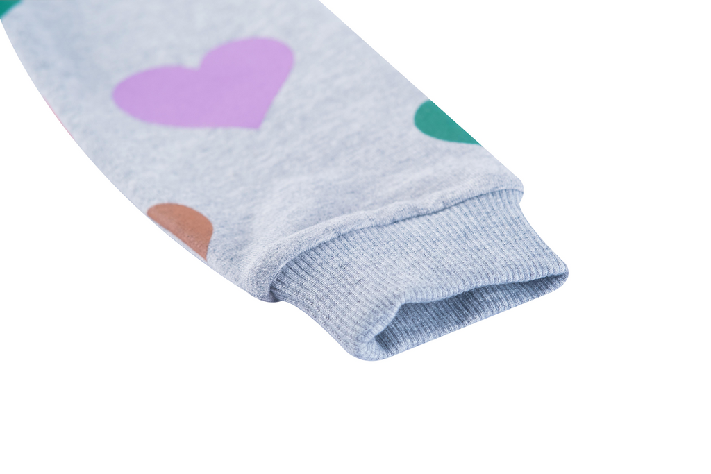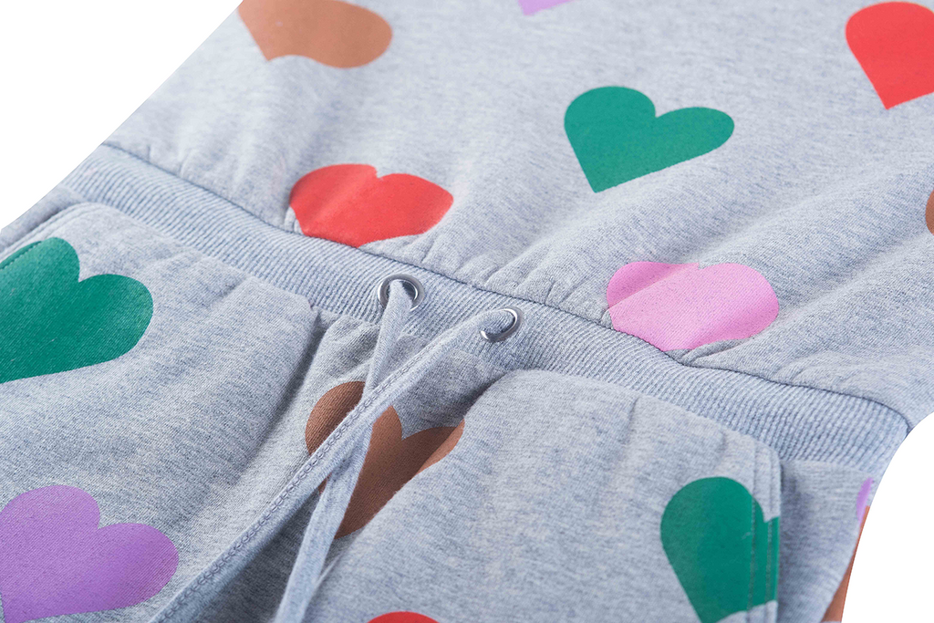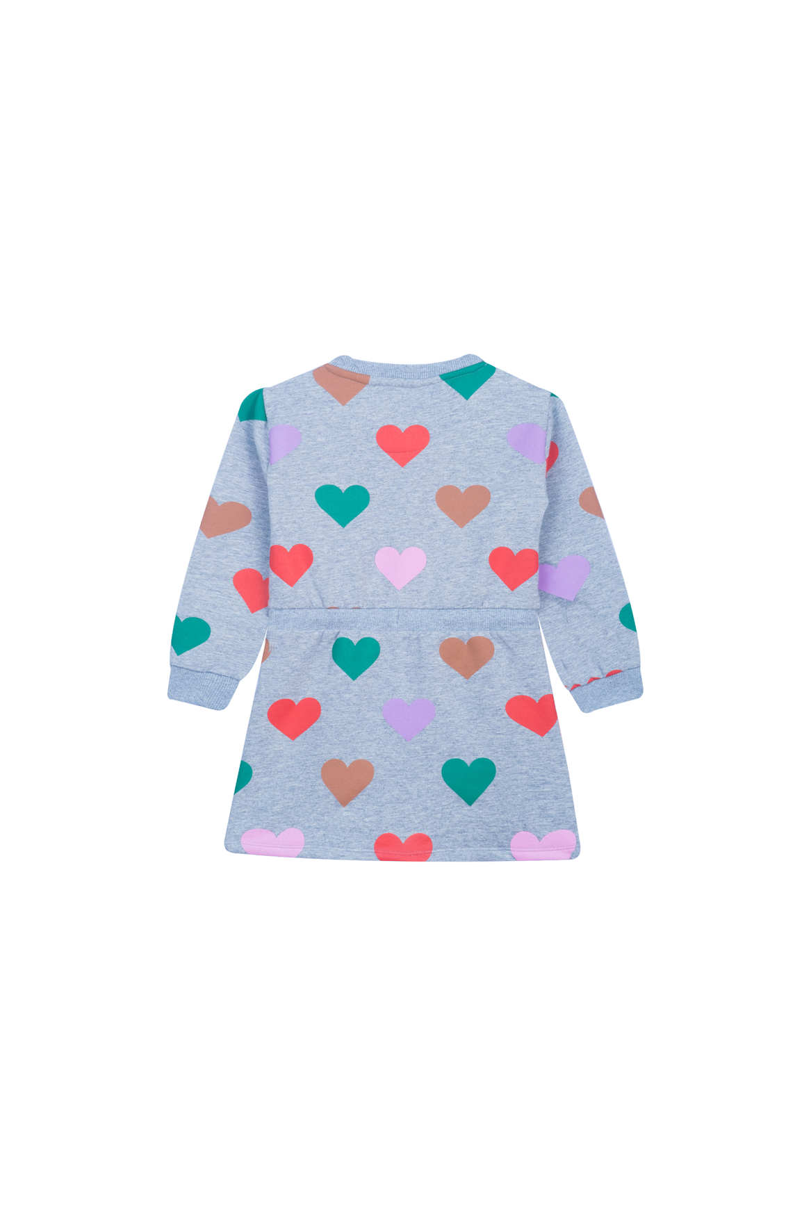 This light grey dress stands out with its colorful all-over heart print in green, red, pink, purple, and beige. The drawstring at the waist adds a playful touch and creates a nicely shaped silhouette. With its long sleeves, it’s a comfortable piece for everyday wear—perfect for kids who love bright colors and cheerful patterns. A fun and lively dress that brings instant joy.
