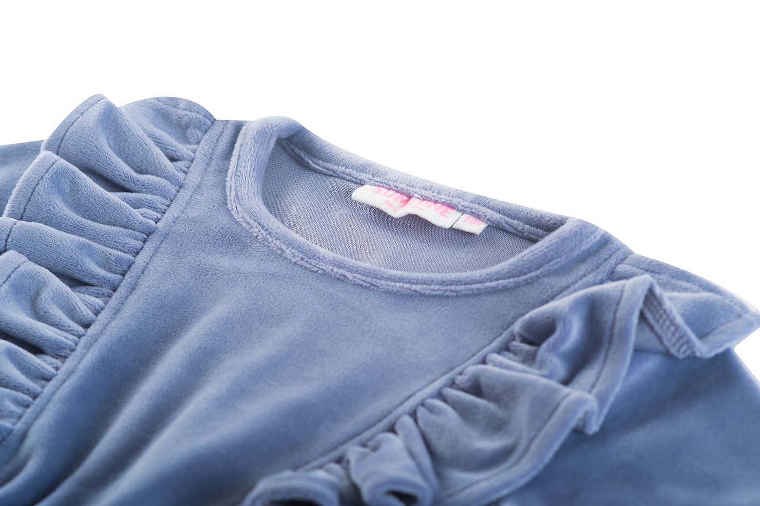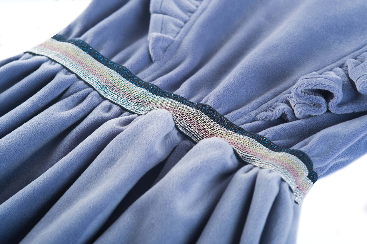 This lovely blue dress features a soft, luxurious look that instantly adds elegance. The playful ruffles along the front create a charming, graceful detail, while the shimmering waistband adds a subtle pop of color that beautifully highlights the waist. With its long sleeves, this dress is perfect for festive occasions as well as everyday outfits with a touch of sparkle.