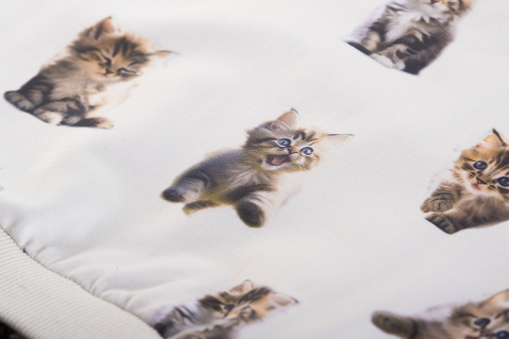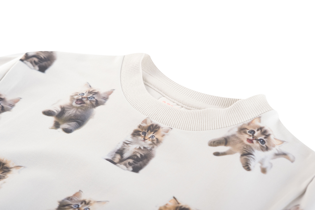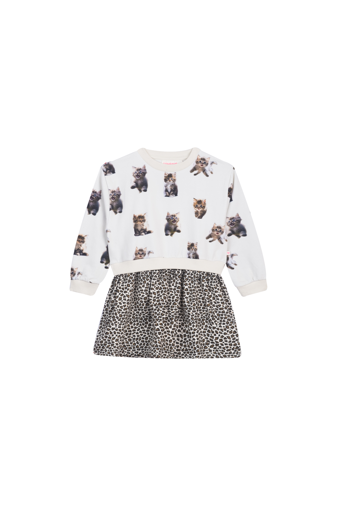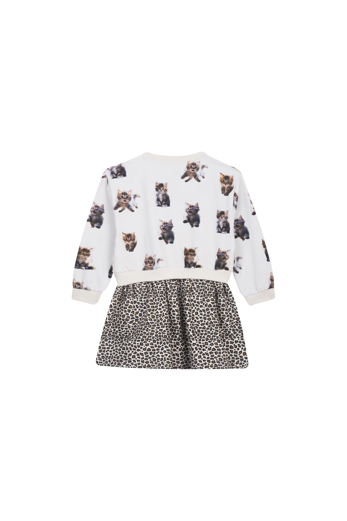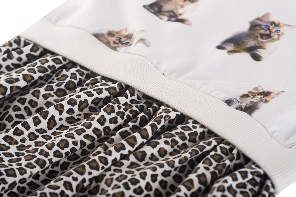 This cheerful dress combines a playful top with a skirt full of character. The upper part features realistic kitten prints, creating a cute and mischievous look. The leopard-print skirt adds a bold twist, giving the outfit a fun and confident style. With long sleeves and a comfortable fit, it’s the perfect dress for everyday adventures — ideal for young animal lovers who like to stand out.