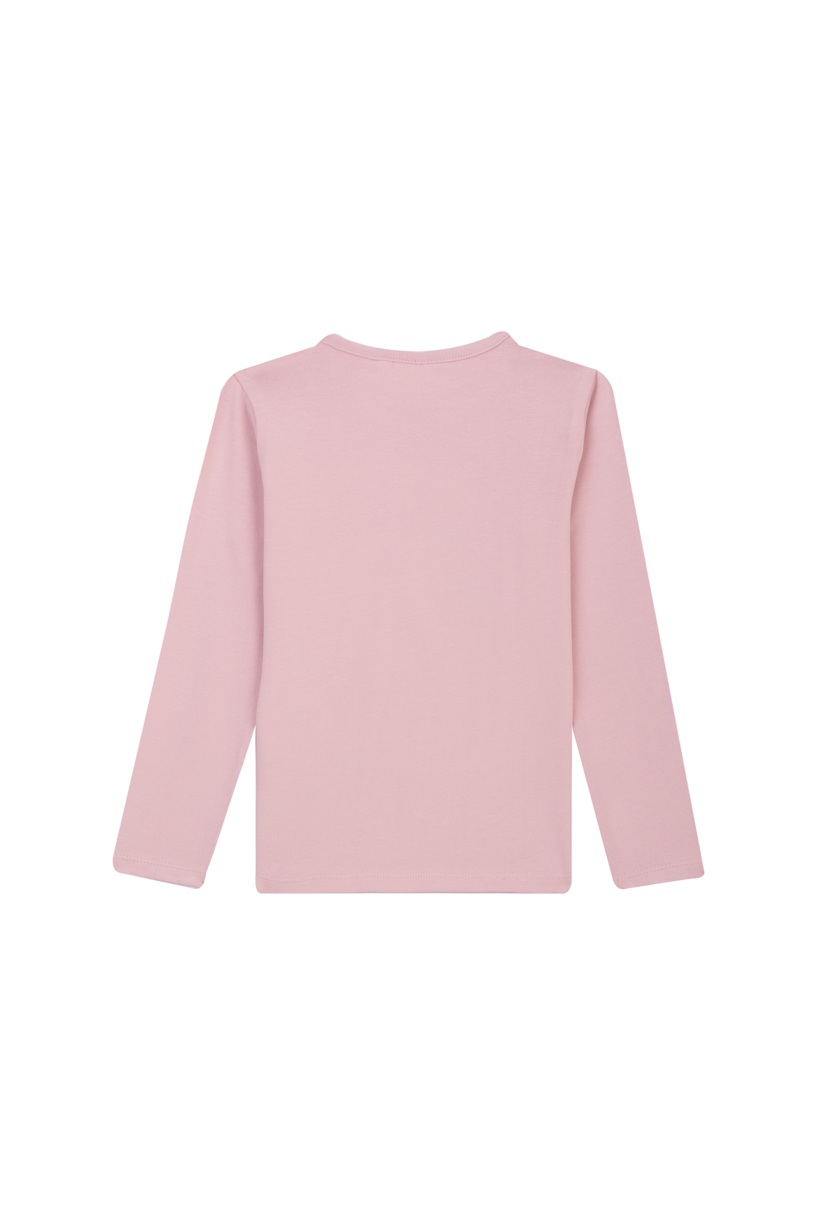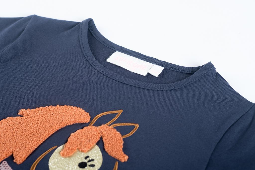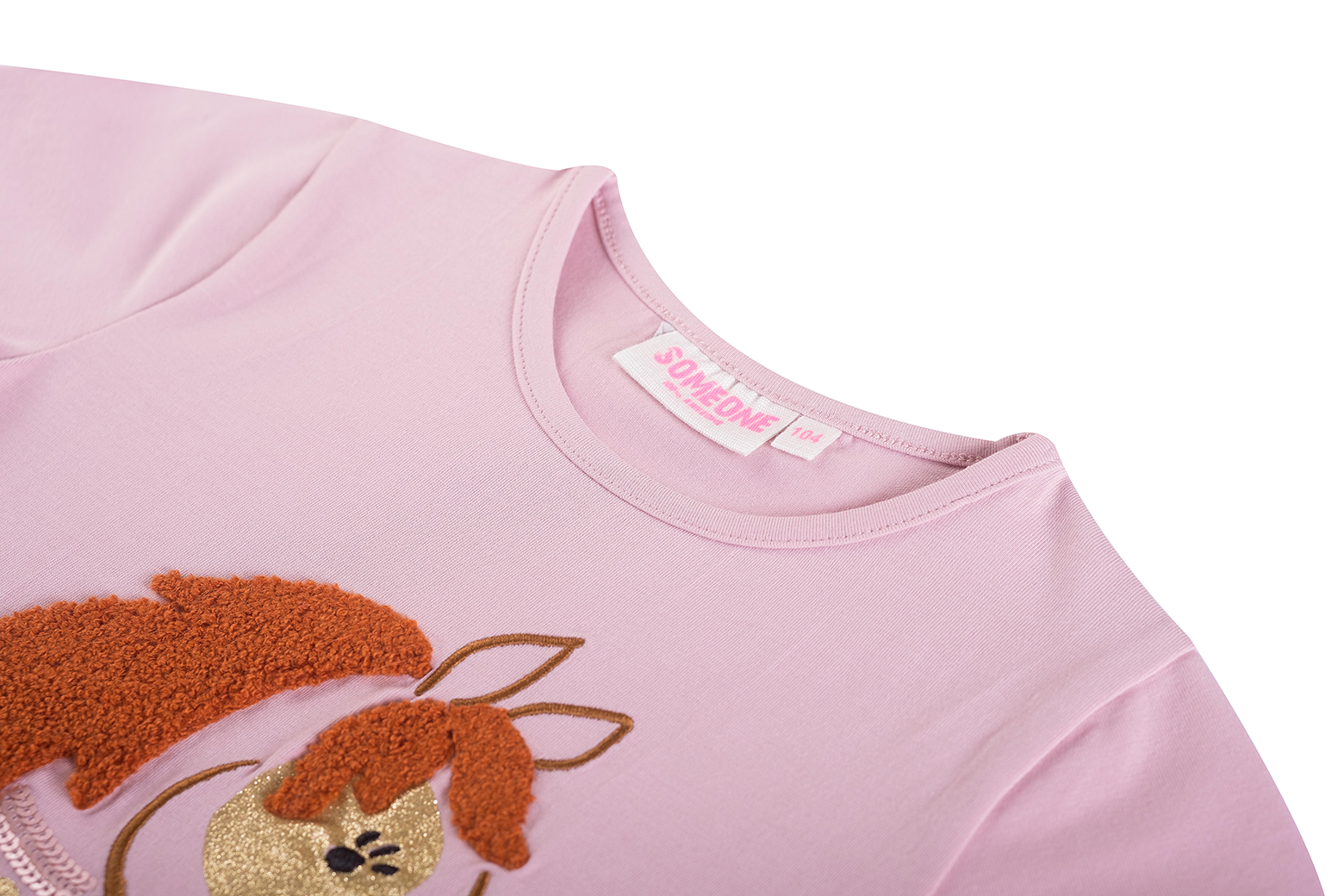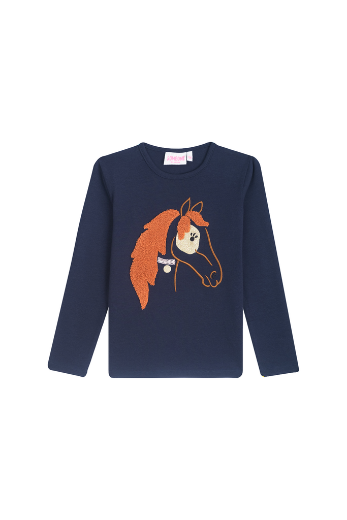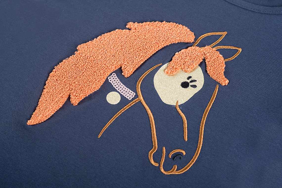 This light pink long-sleeved top is a graceful garment with a striking and detailed design. On the chest, a horse’s head is illustrated with a golden face, long black lashes, and a reddish-brown mane. The horse wears a pink and gold collar, giving the design a whimsical and elegant look. The mix of embroidery and shimmering accents makes this shirt a true eye-catcher. A top that’s perfect for girls who love horses.