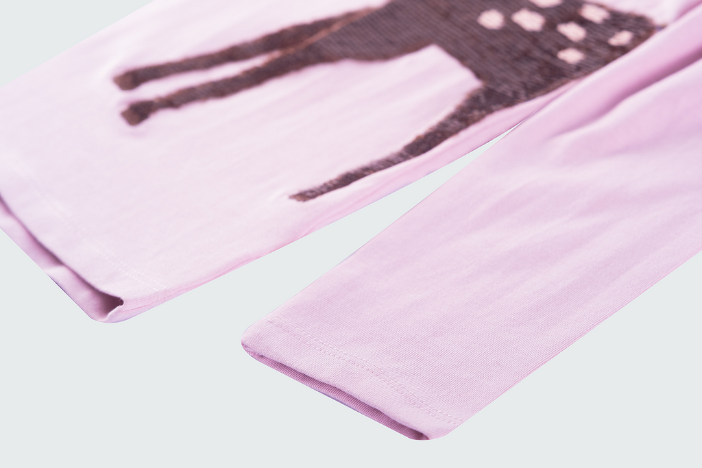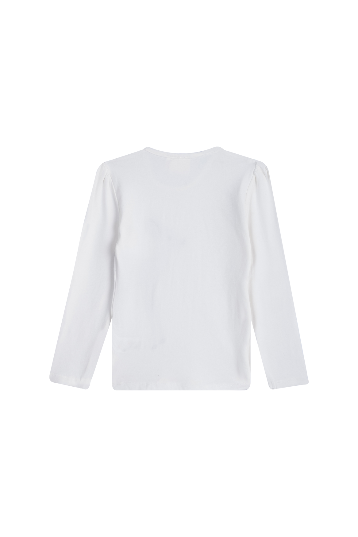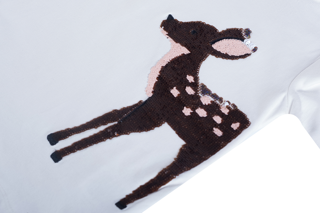 This white long-sleeved top is a cute and stylish choice for girls who love animal prints with a touch of glamour. The graceful fawn on the front, crafted in shimmering sequins, adds a playful and warm vibe that instantly catches the eye. Soft colors and delicate details make this shirt a true favorite for both school days and special occasions. Pair it with a skirt or jeans for a charming look that always works. An enchanting piece that blends imagination and fashion in the sweetest way.