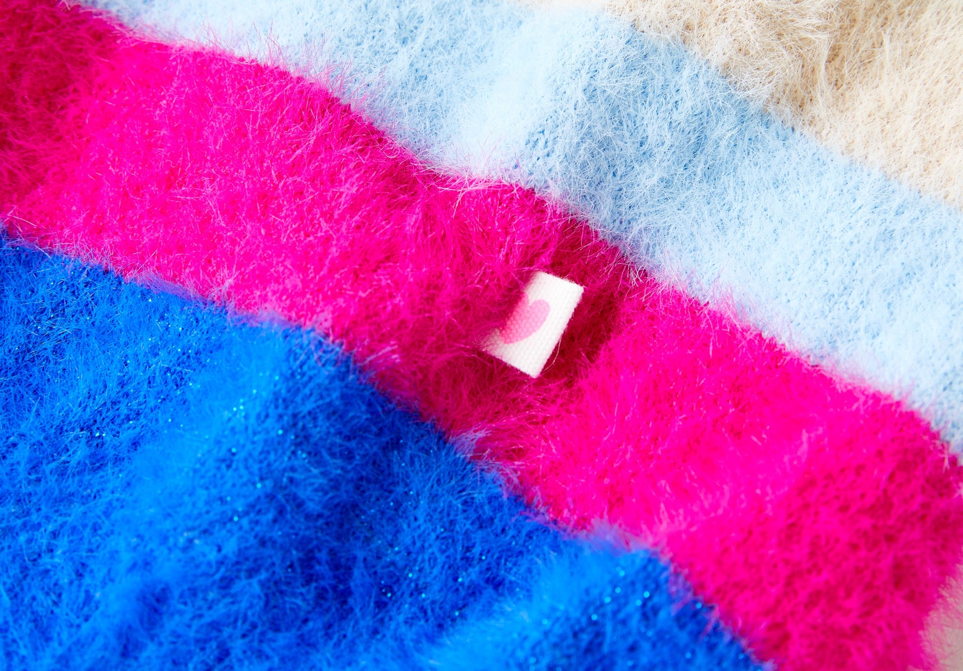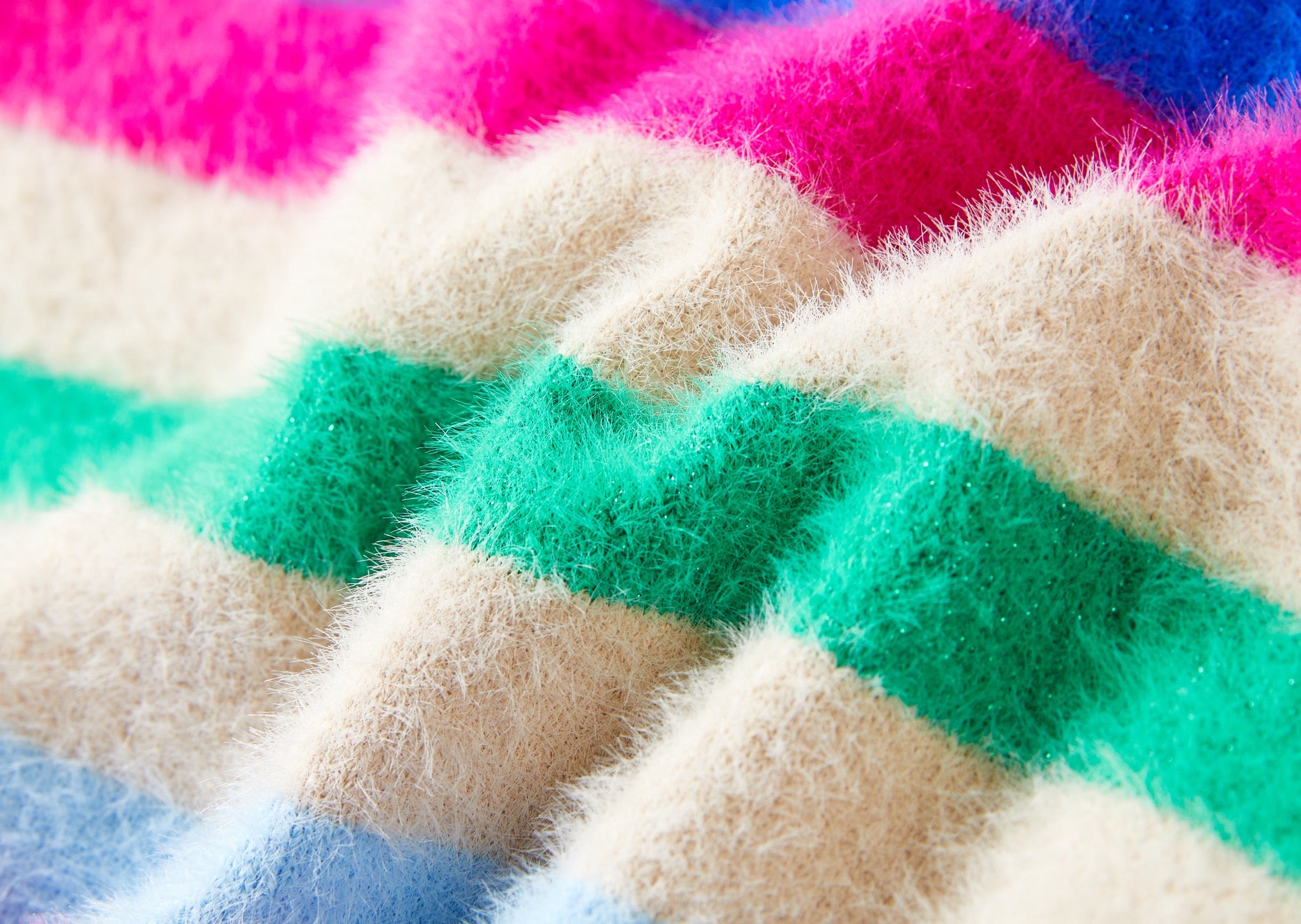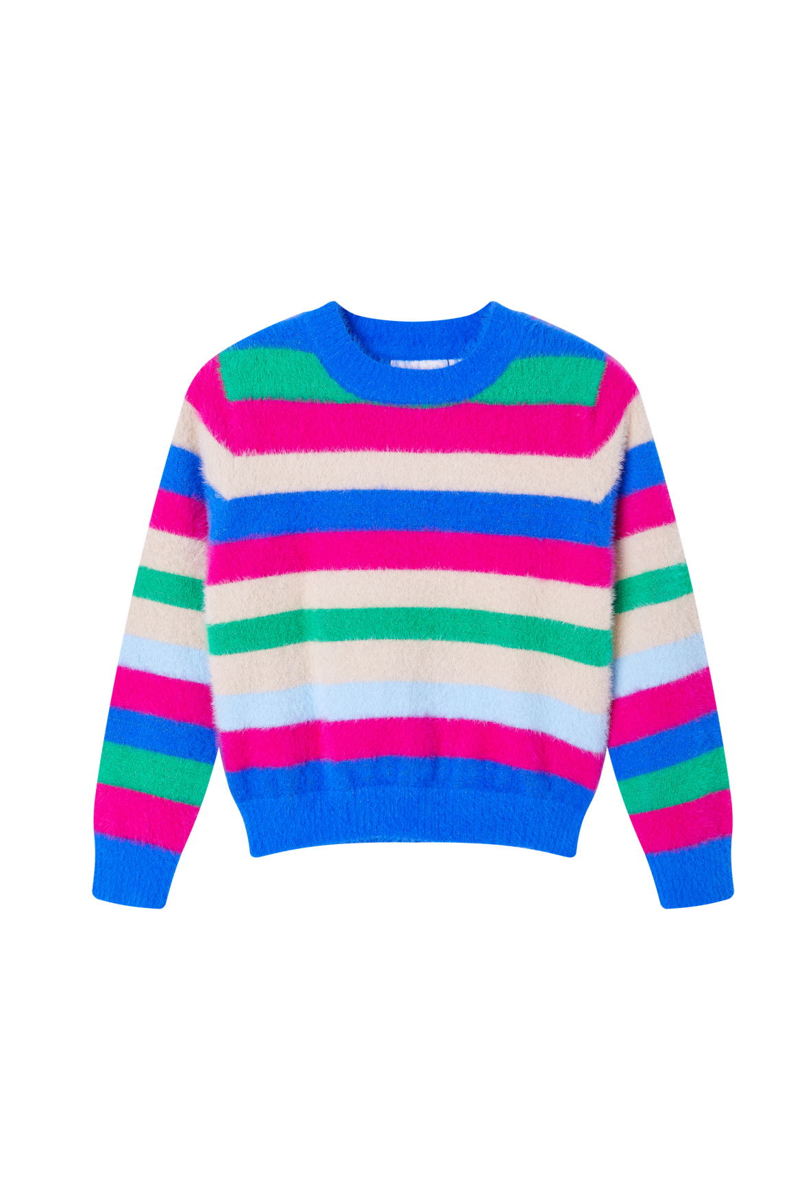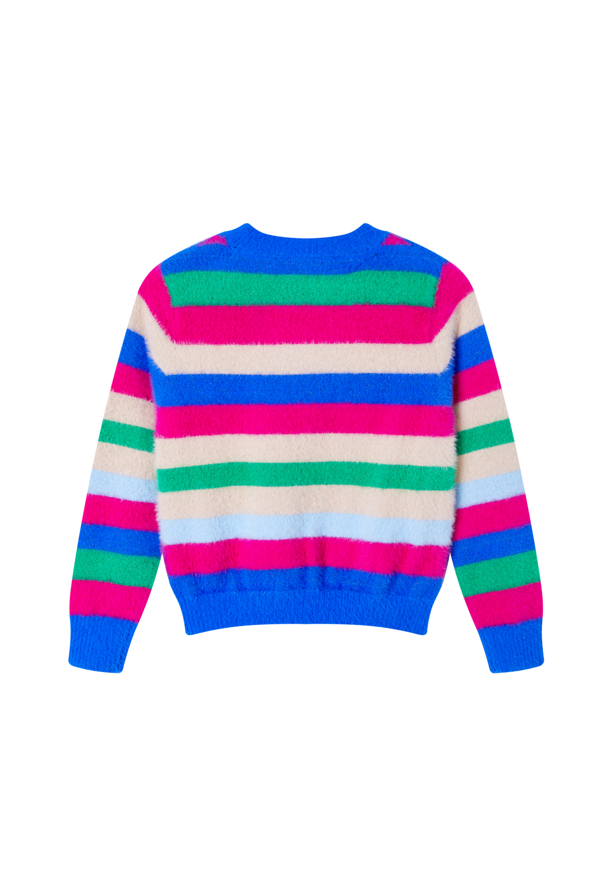 This cheerful sweater immediately stands out thanks to its vibrant stripes in a mix of fresh, bright shades. The combination of fuchsia, blue, green, and soft pastel tones creates a playful and lively look. The design features a classic round neckline and a comfortable fit, making it perfect for everyday wear. This sweater adds a burst of color to any outfit and is sure to bring a joyful touch to your child’s wardrobe.