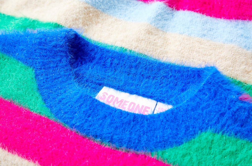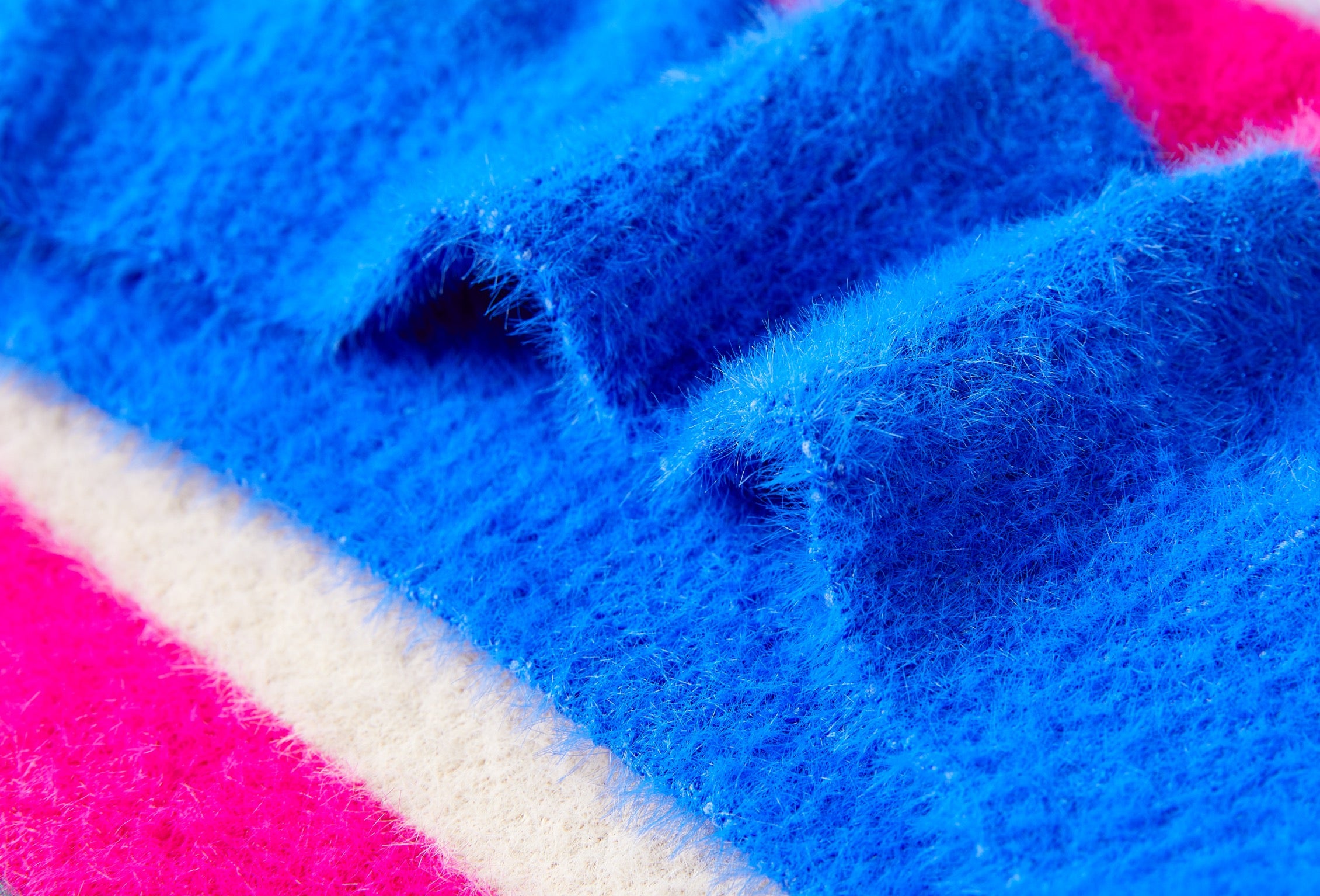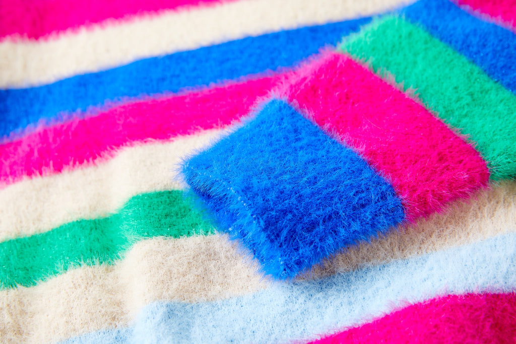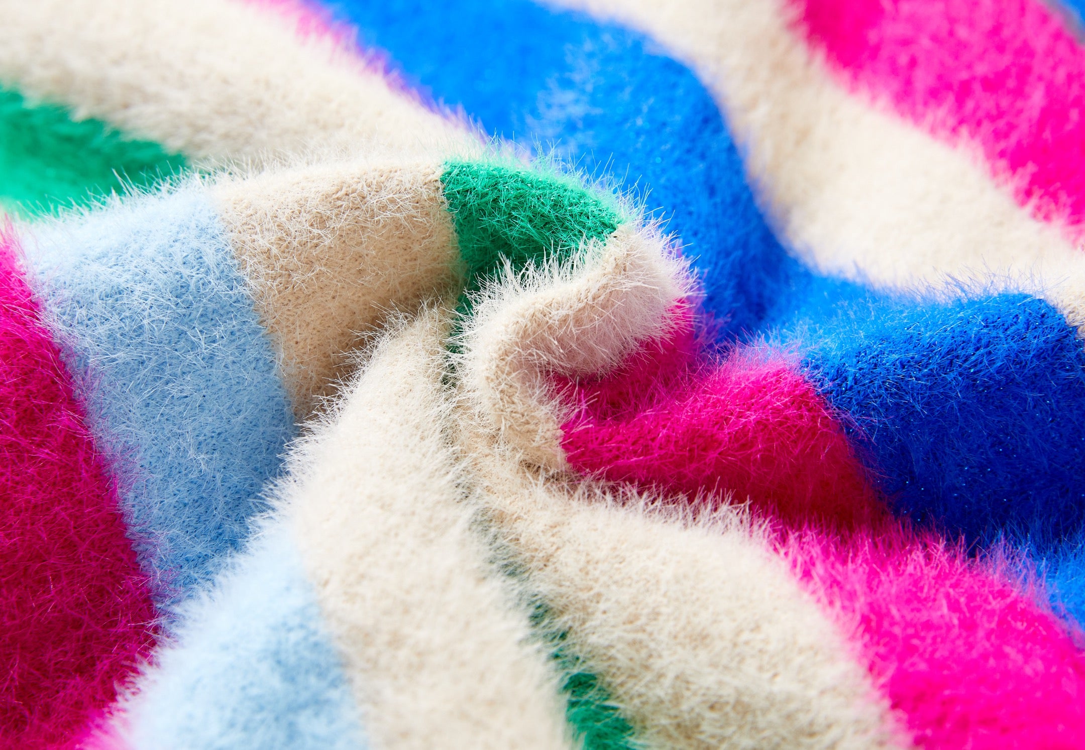 This cheerful sweater immediately stands out thanks to its vibrant stripes in a mix of fresh, bright shades. The combination of fuchsia, blue, green, and soft pastel tones creates a playful and lively look. The design features a classic round neckline and a comfortable fit, making it perfect for everyday wear. This sweater adds a burst of color to any outfit and is sure to bring a joyful touch to your child’s wardrobe.