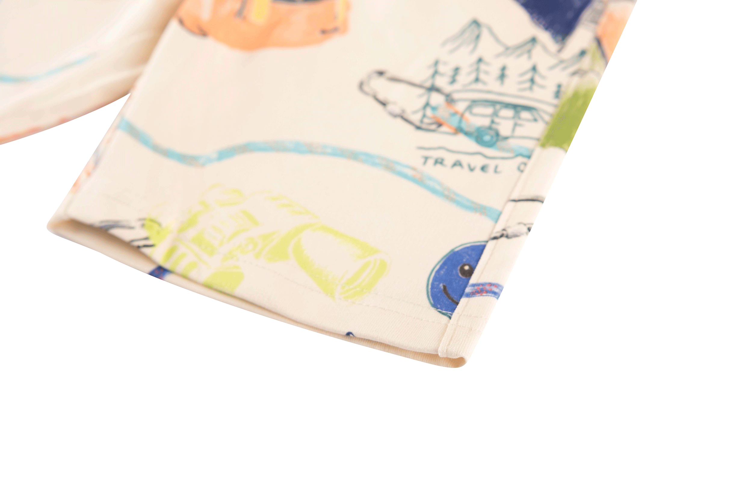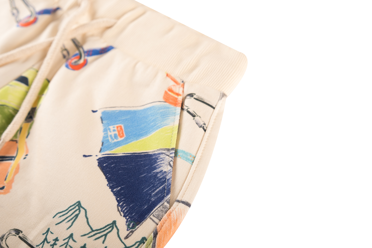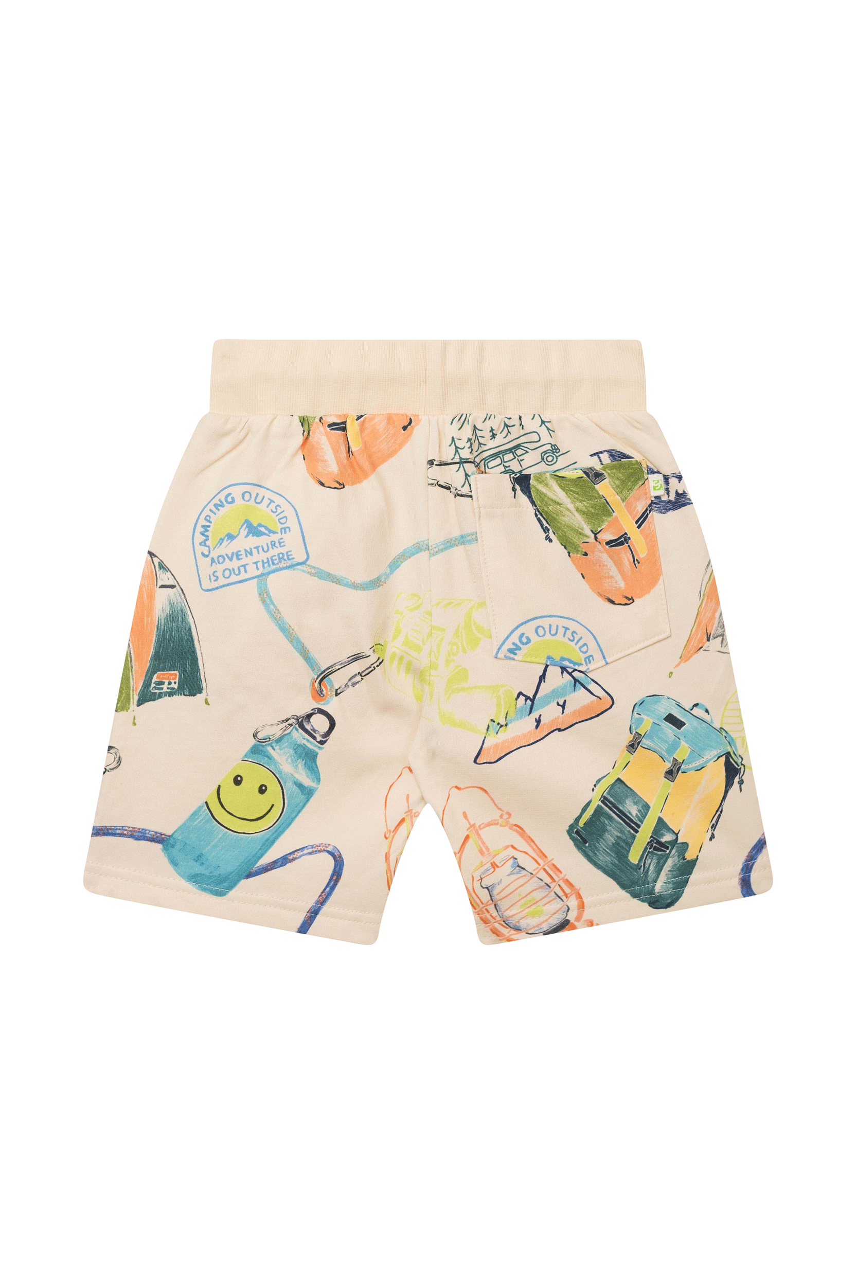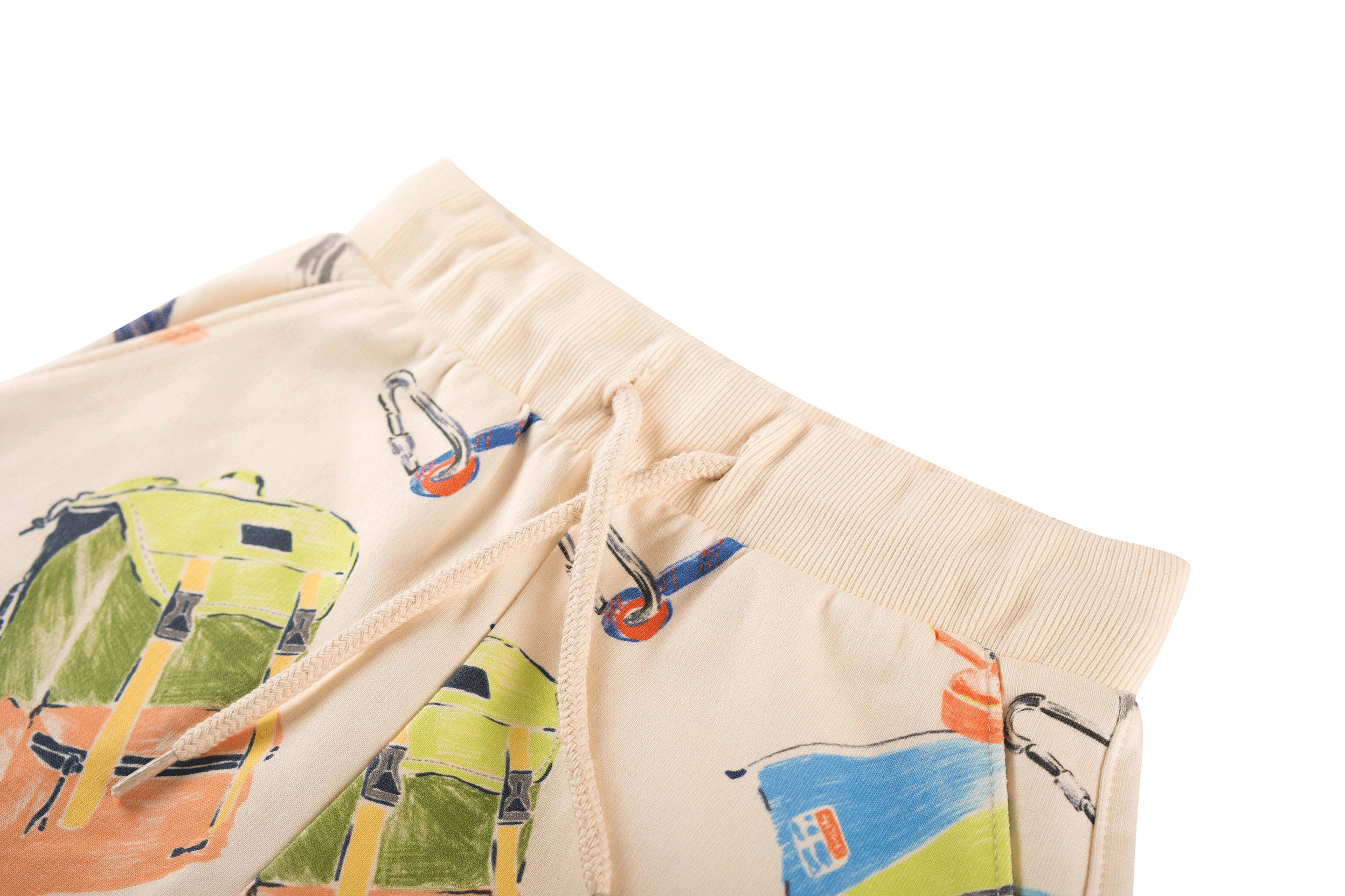 These shorts feature a cheerful outdoor print with backpacks, tents and small travel details that instantly spark a sense of adventure. The soft fabric and comfortable drawstring waistband make them easy to wear, even during long days of outdoor play. Thanks to the light base colour, they pair well with all kinds of summer T-shirts and sweaters. A perfect pick for kids who love exploring, running around and discovering new places.