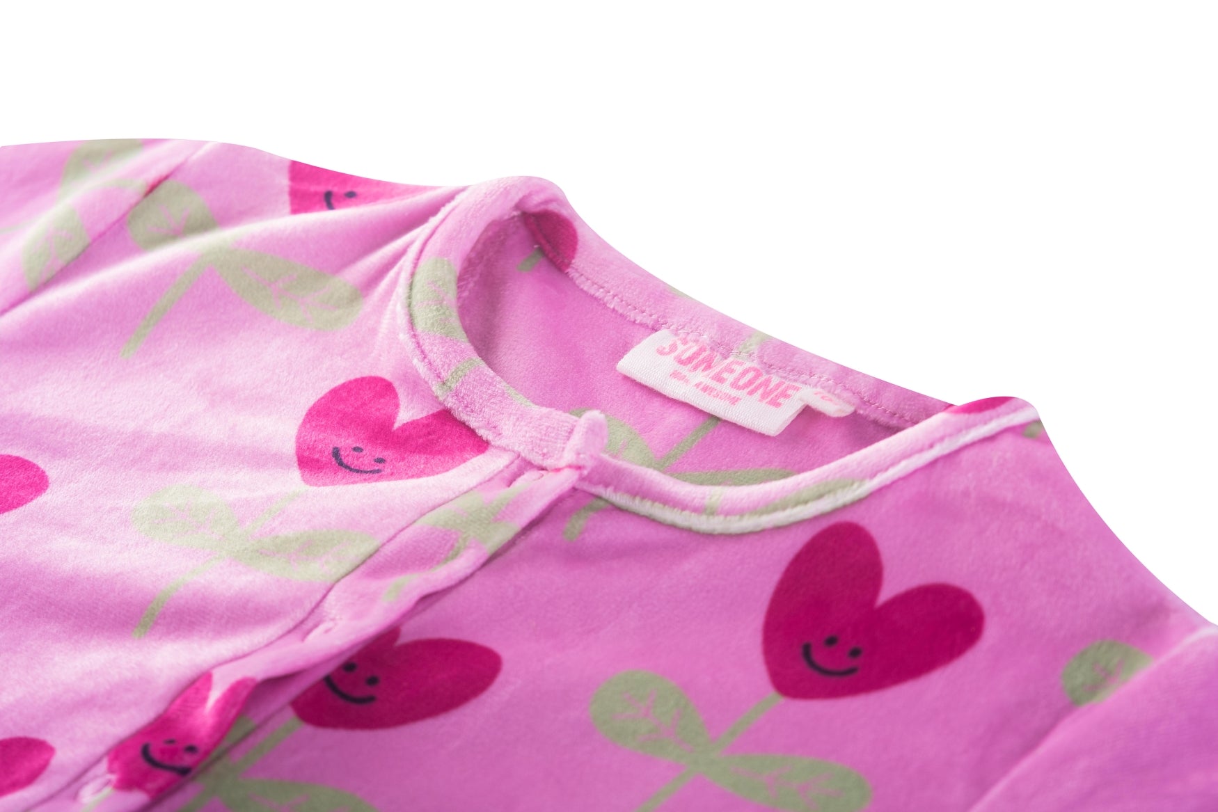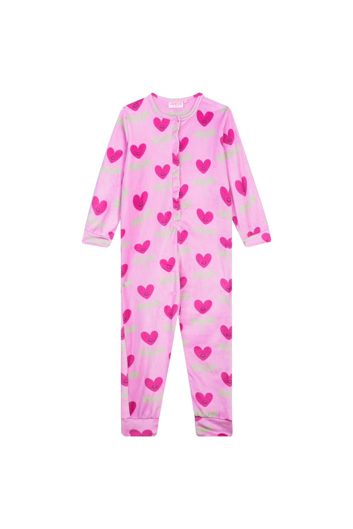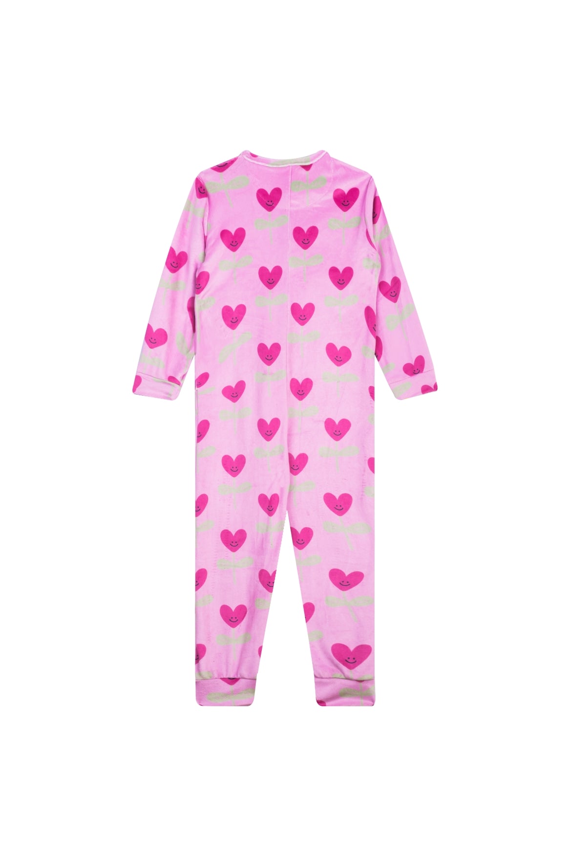 This cheerful pink onesie is covered in bright pink hearts, each with a smiling face that adds a playful and cute touch. The long sleeves and legs offer extra comfort and warmth, while the front button closure makes it easy to slip on and off. It’s a cosy piece that’s perfect for relaxed days at home or for snuggling up comfortably before bedtime.