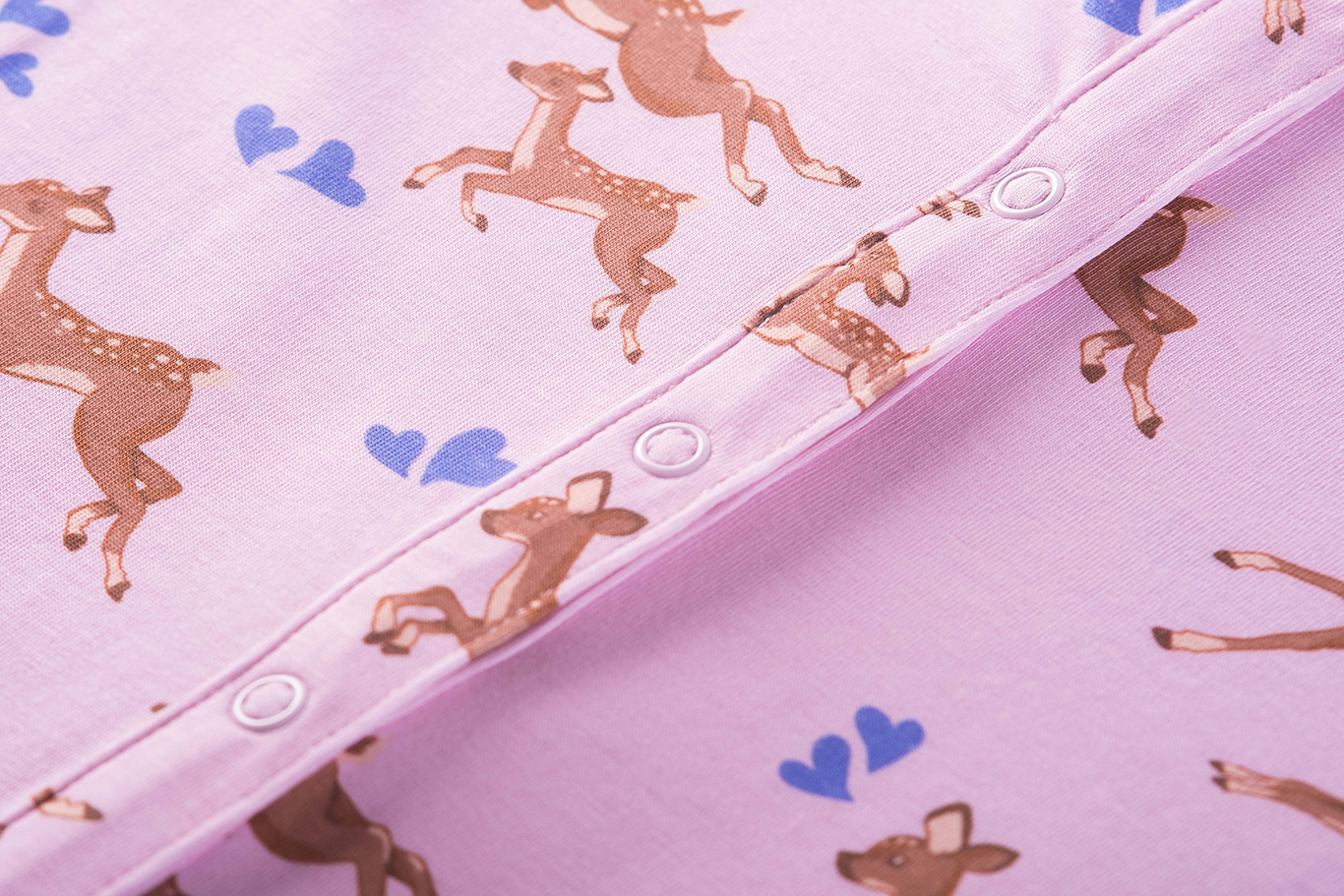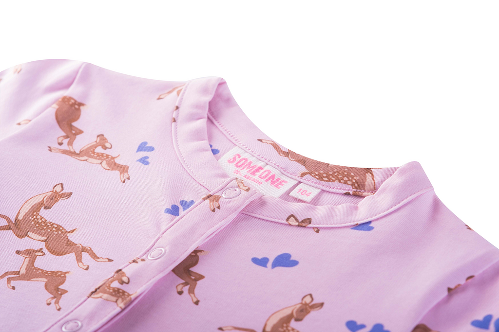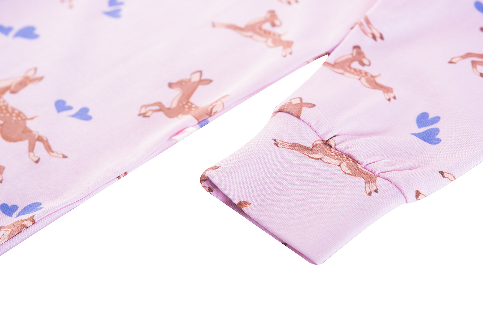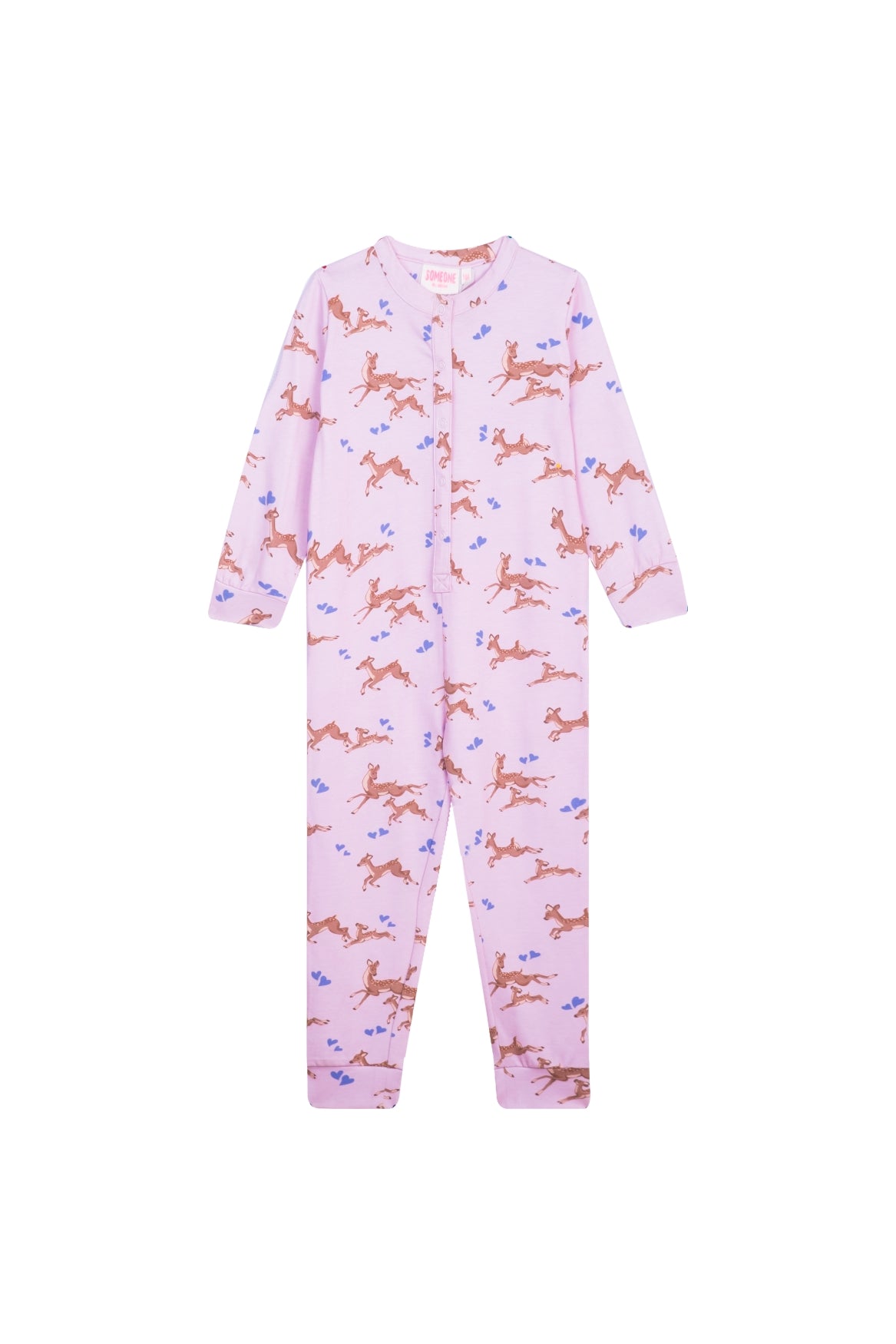 This pink onesie features a playful, dreamy look with running deer and small blue hearts scattered across the fabric. The long sleeves and legs make it perfect for cosy moments at home, while the all-over print adds a cheerful touch. It’s a comfortable piece that lets any child move freely and feel ready for a warm, relaxed evening or a good night’s sleep.