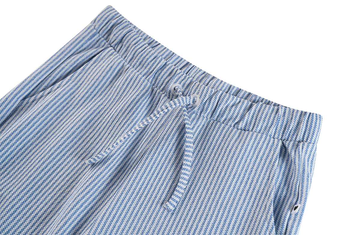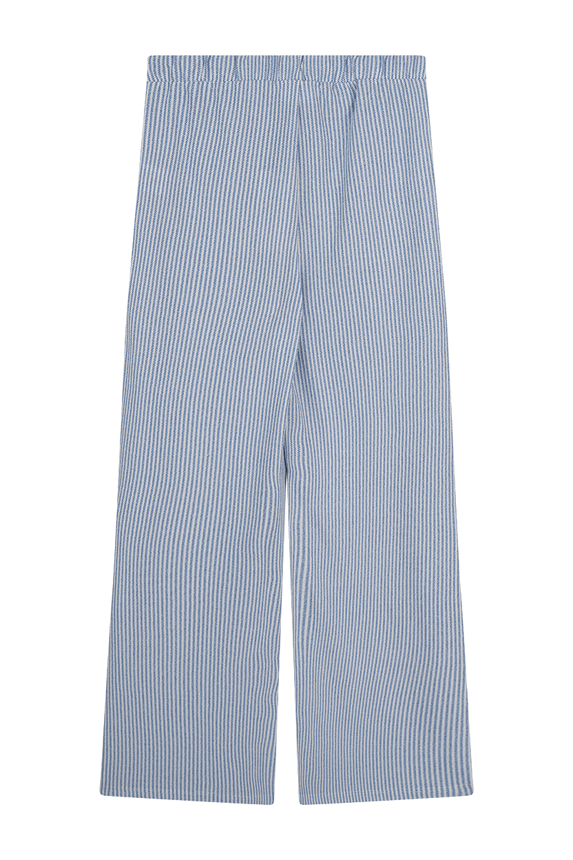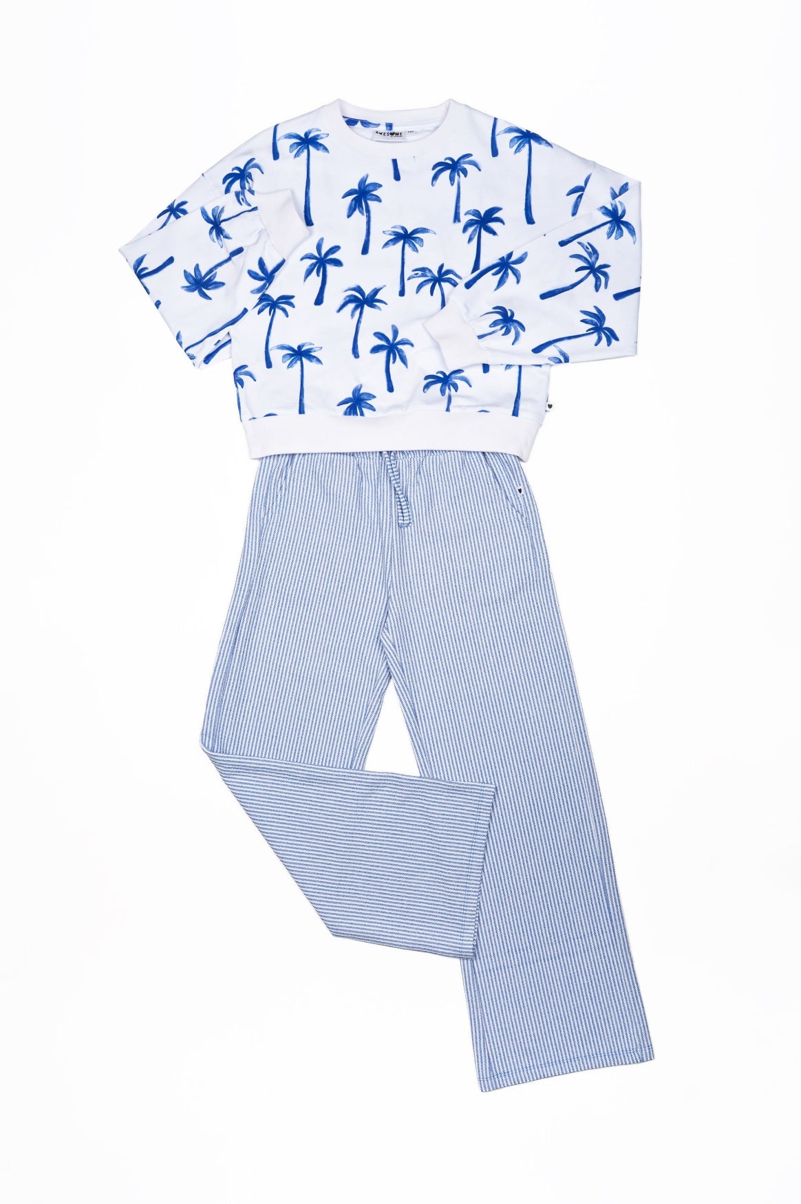 A fresh and summery set, perfect for laid-back days! The white sweater with blue palm tree print adds a fun, vacation-inspired vibe. The light blue striped trousers complement it perfectly and create a relaxed, breezy look. Great for beach days, holidays, or a comfortable weekend outfit.