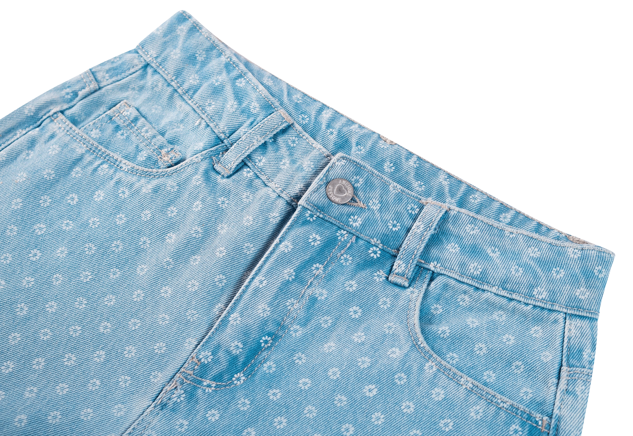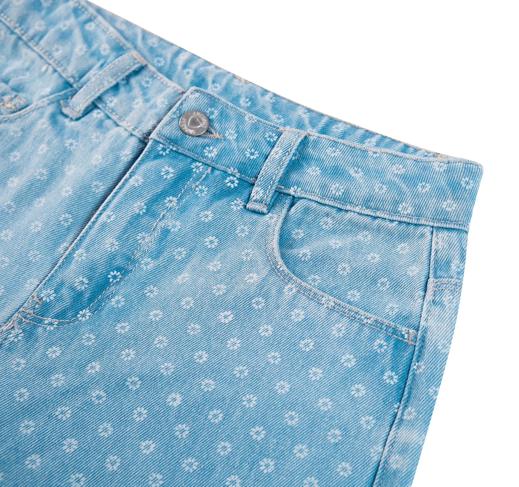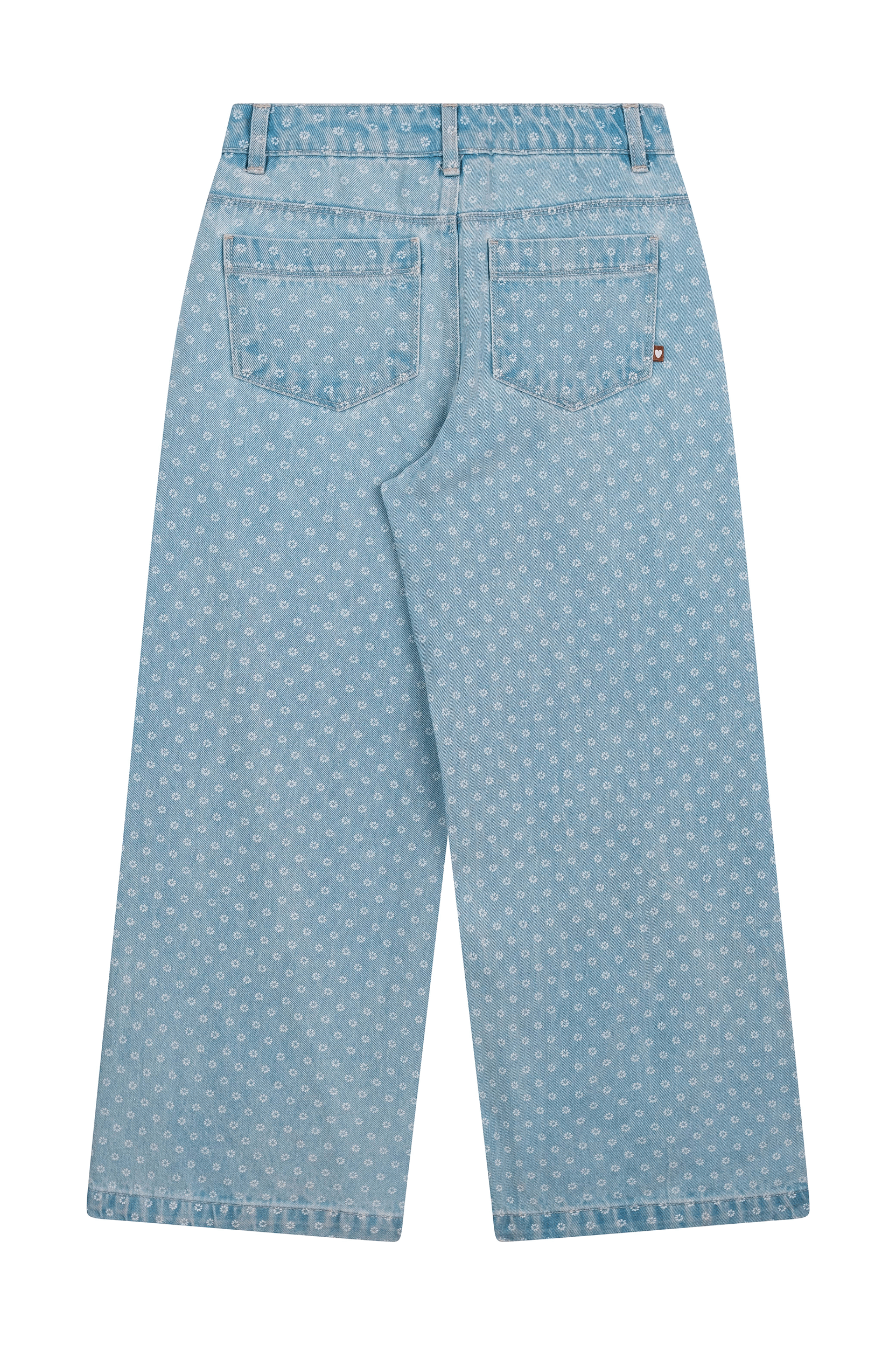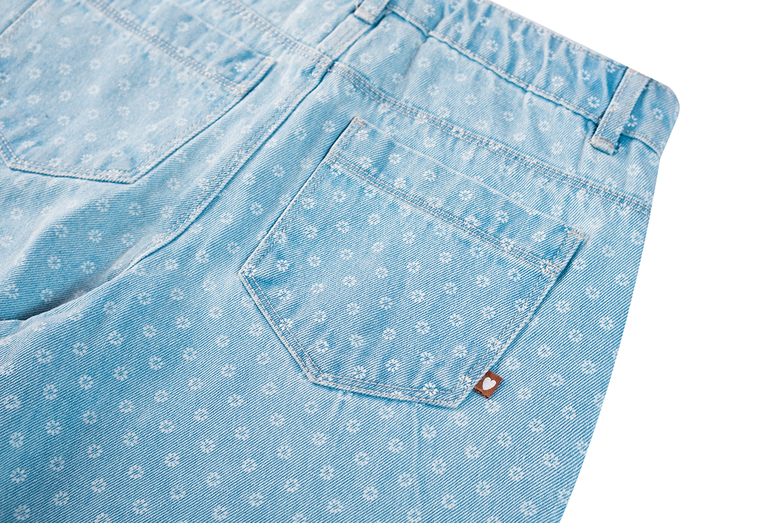 A playful and unique pair of jeans that stands out instantly! These light blue trousers feature an all-over subtle floral print, giving them a cheerful and fresh look. The wide-leg fit adds a modern touch and makes them perfect for both school and casual days. Easy to pair with a simple T-shirt, hoodie, or blouse for a stylish everyday outfit.