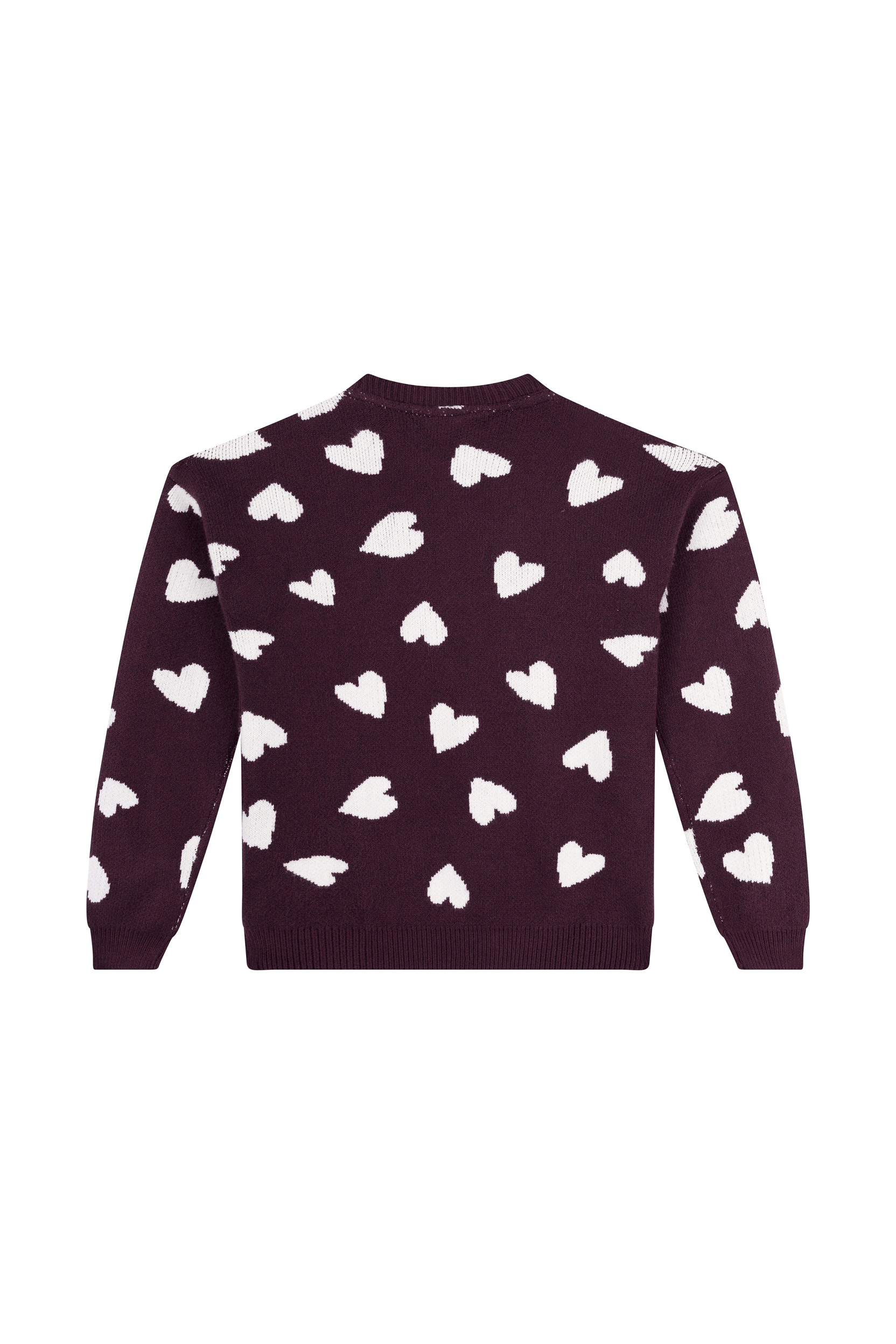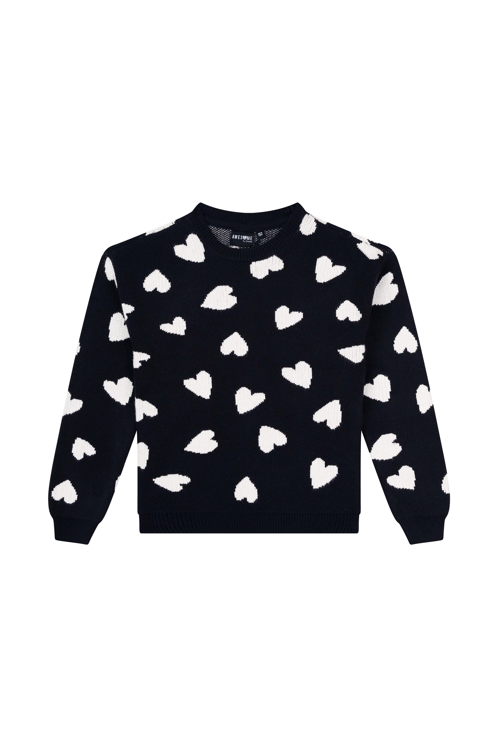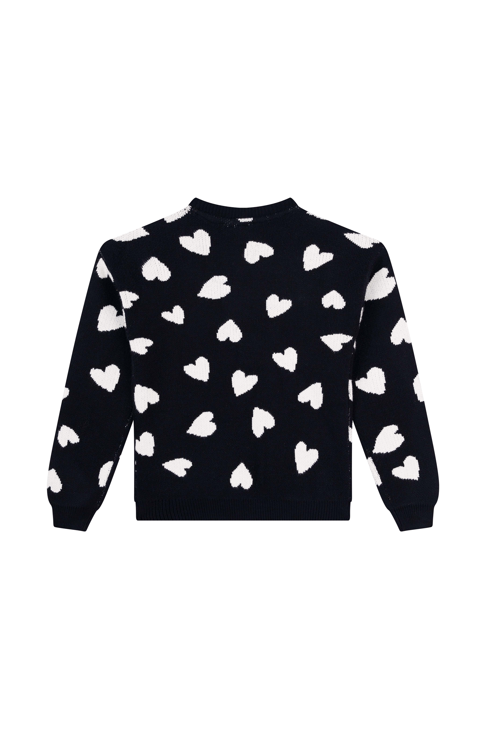 This dark blue sweater with a playful heart pattern is a charming and versatile choice for everyday wear. The contrasting white hearts add a cheerful and fresh touch, while the comfortable fit makes it ideal for casual outfits. The ribbed hems give it a clean and timeless finish. Perfect to pair with jeans, a skirt, or a cozy winter look.