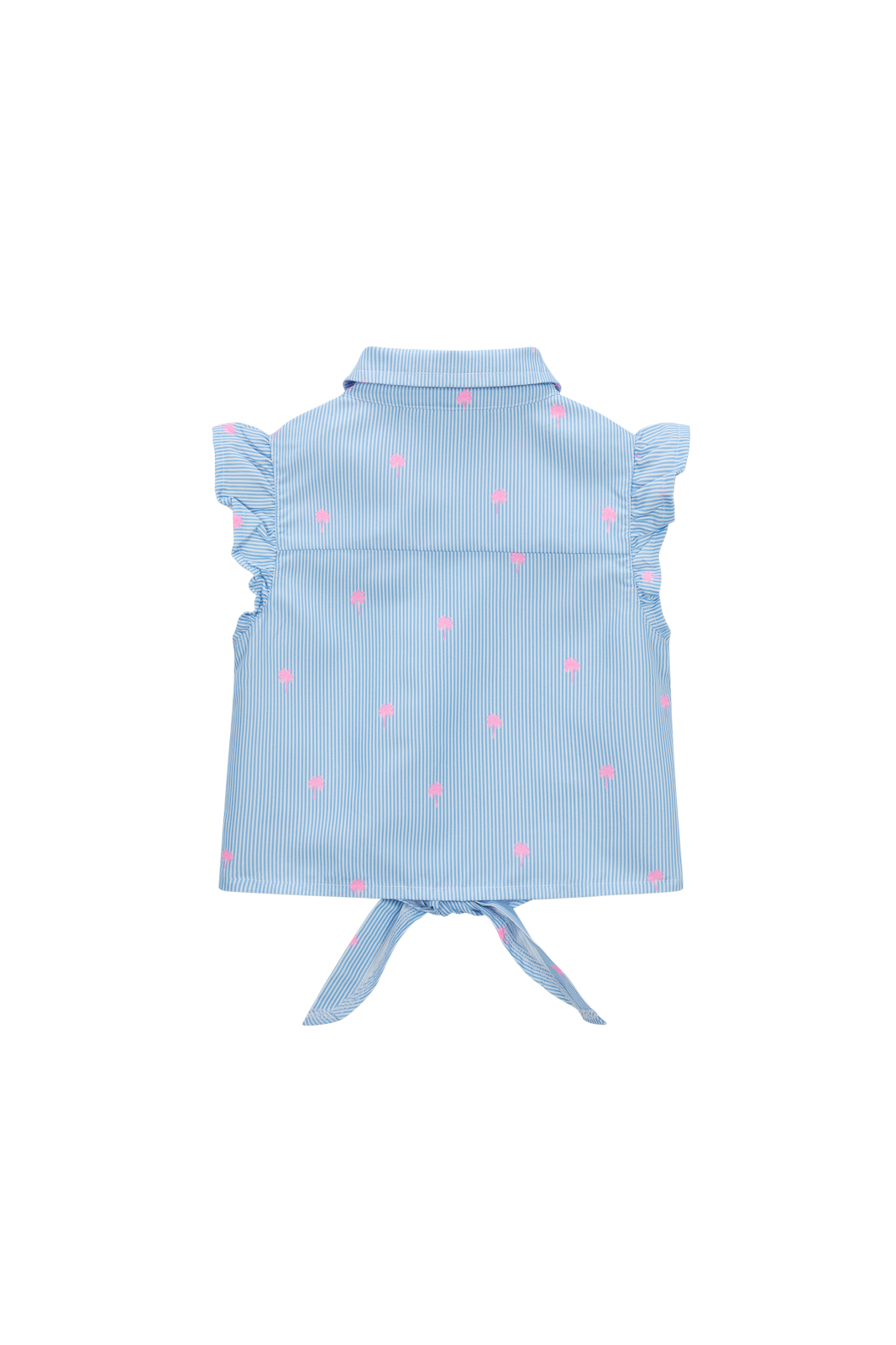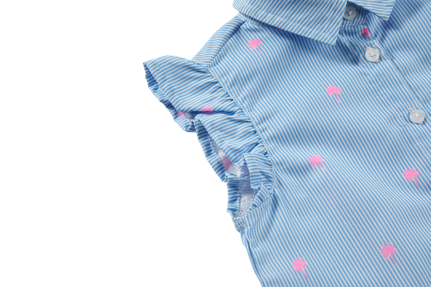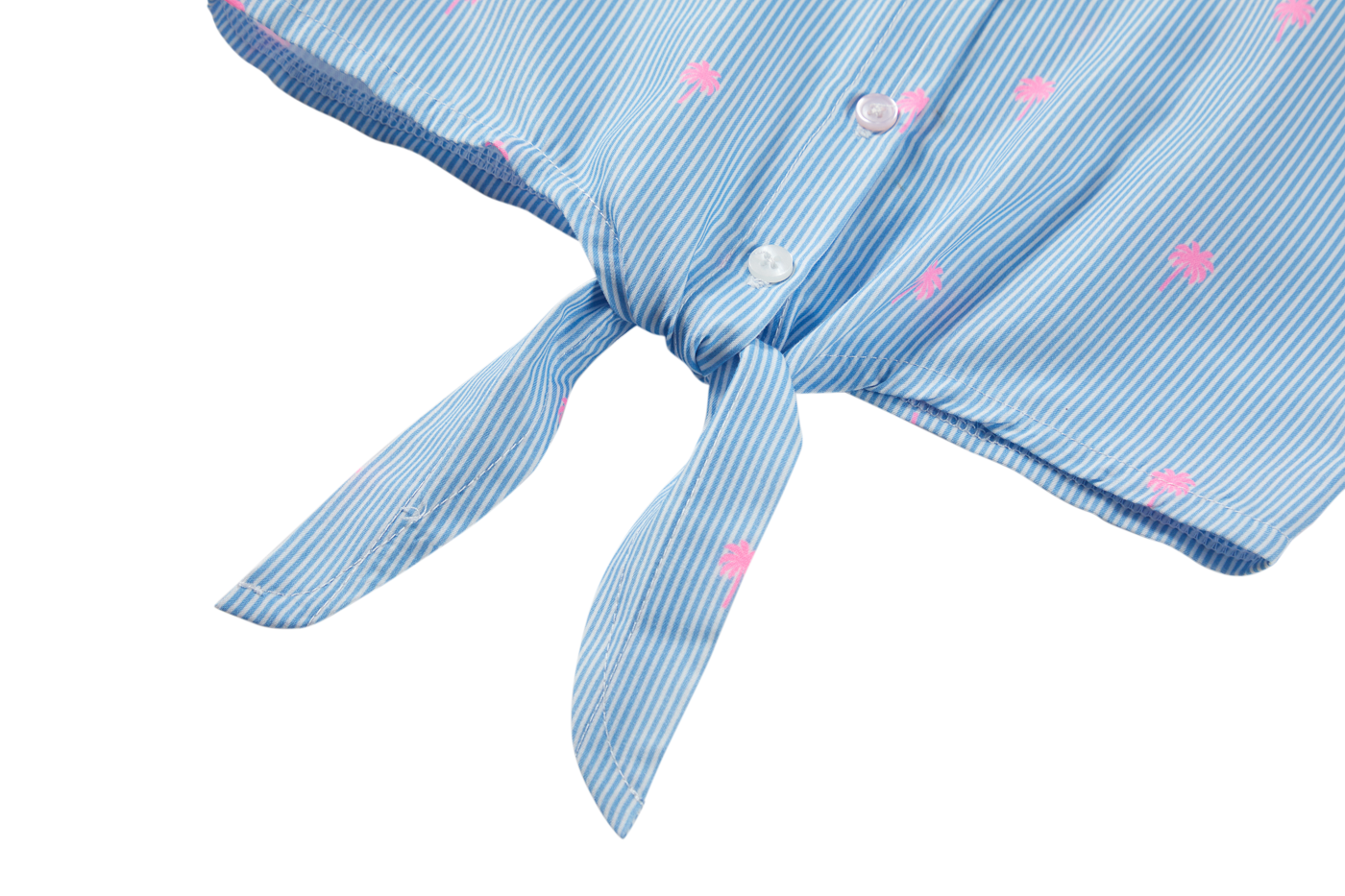 This top has an instant cheerful feel thanks to the blue stripes and small pink accents. The ruffled sleeves create a light, breezy look that’s perfect for warm days. The front tie adds a fun, summery touch and makes it easy to pair with shorts or a skirt for a bright, effortless outfit.