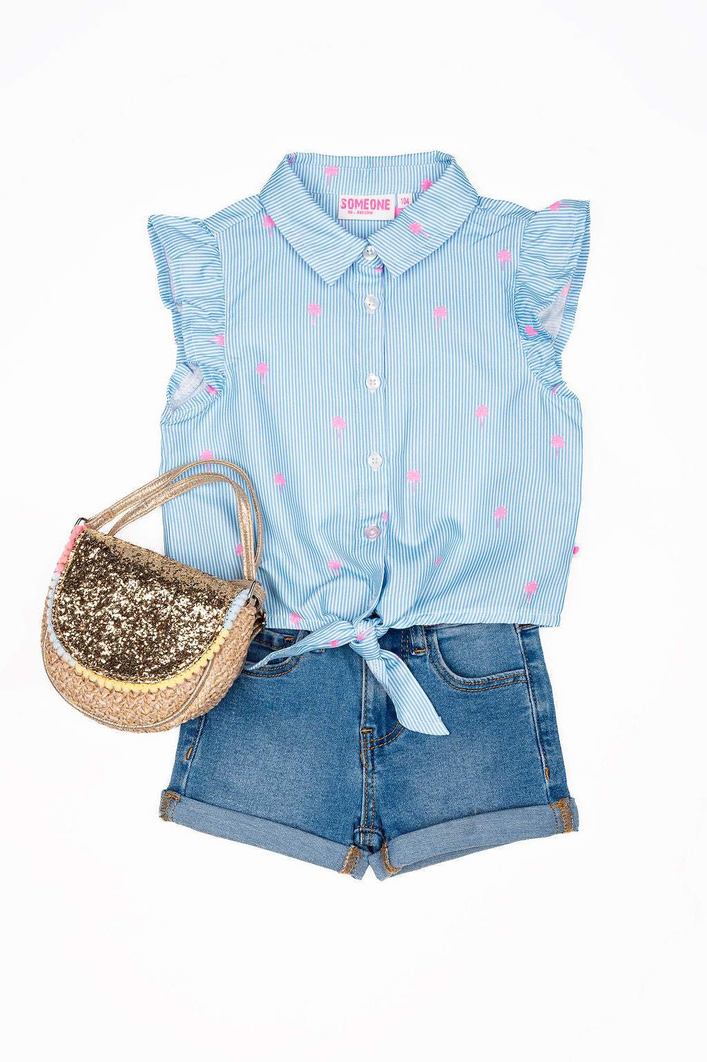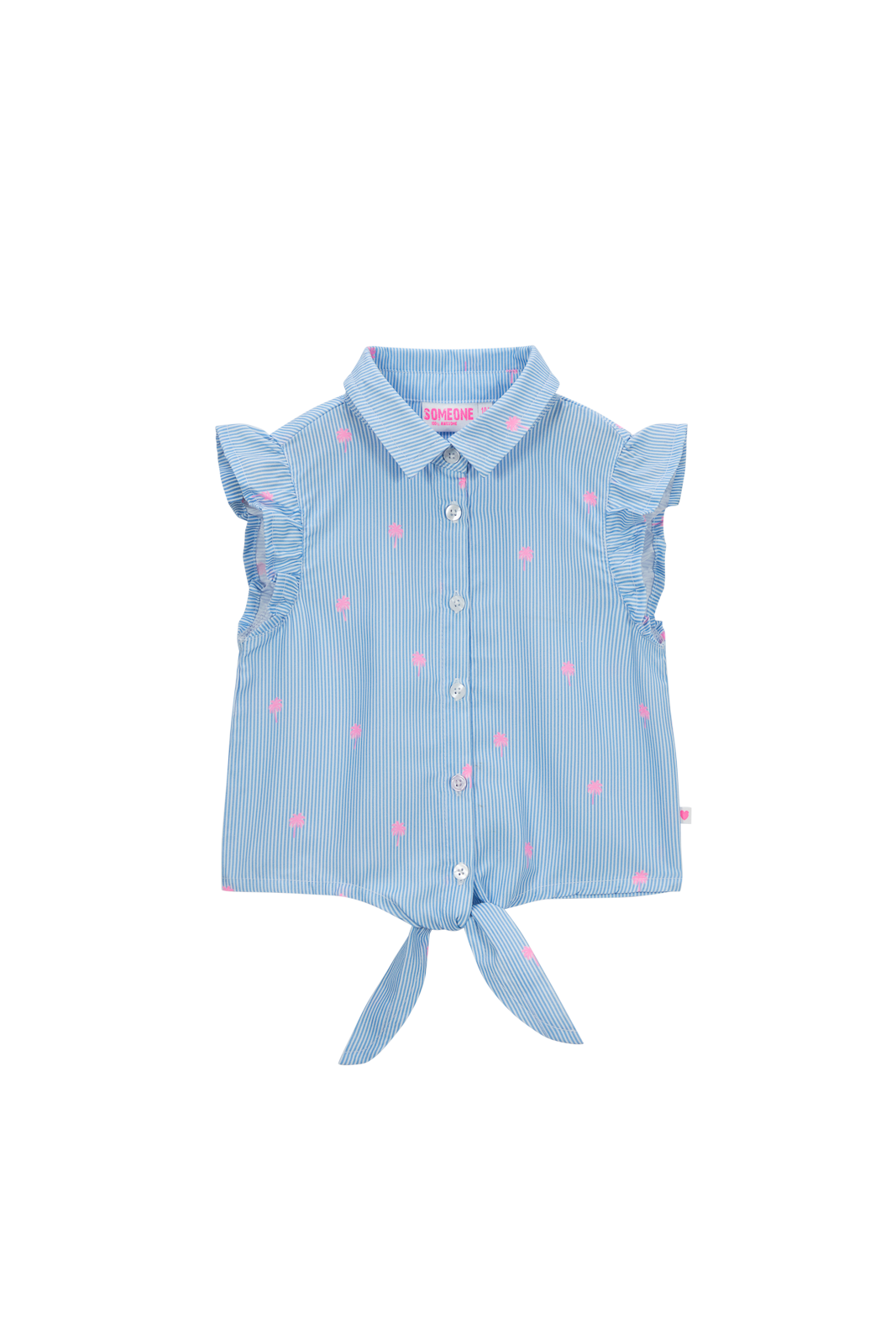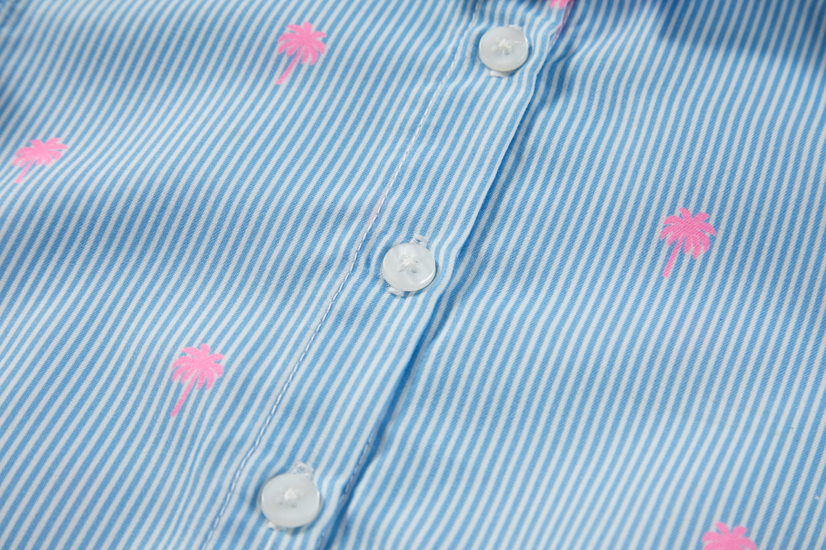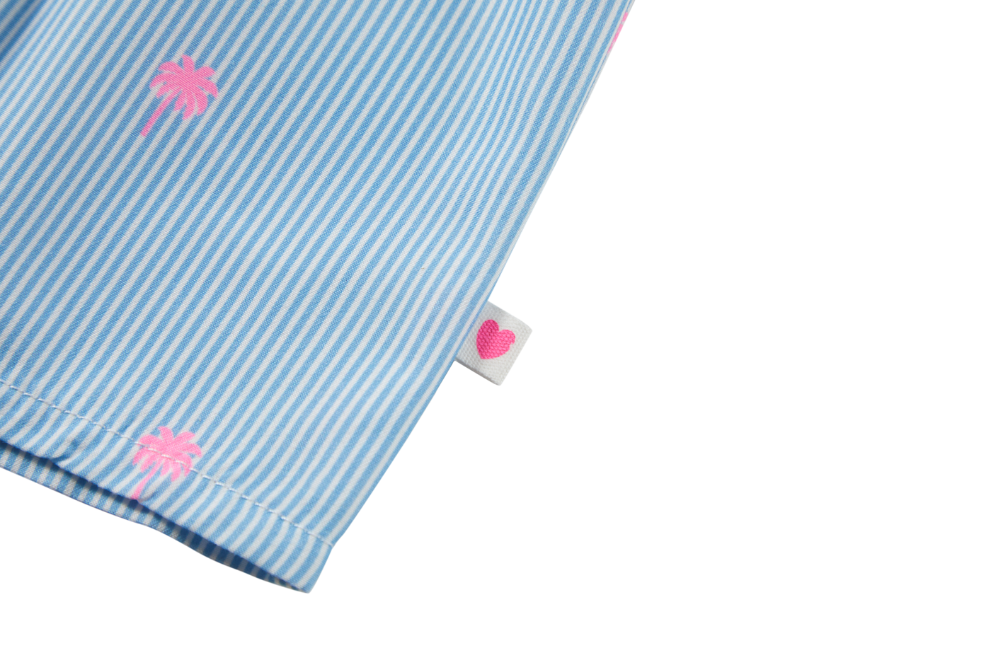 This top has an instant cheerful feel thanks to the blue stripes and small pink accents. The ruffled sleeves create a light, breezy look that’s perfect for warm days. The front tie adds a fun, summery touch and makes it easy to pair with shorts or a skirt for a bright, effortless outfit.