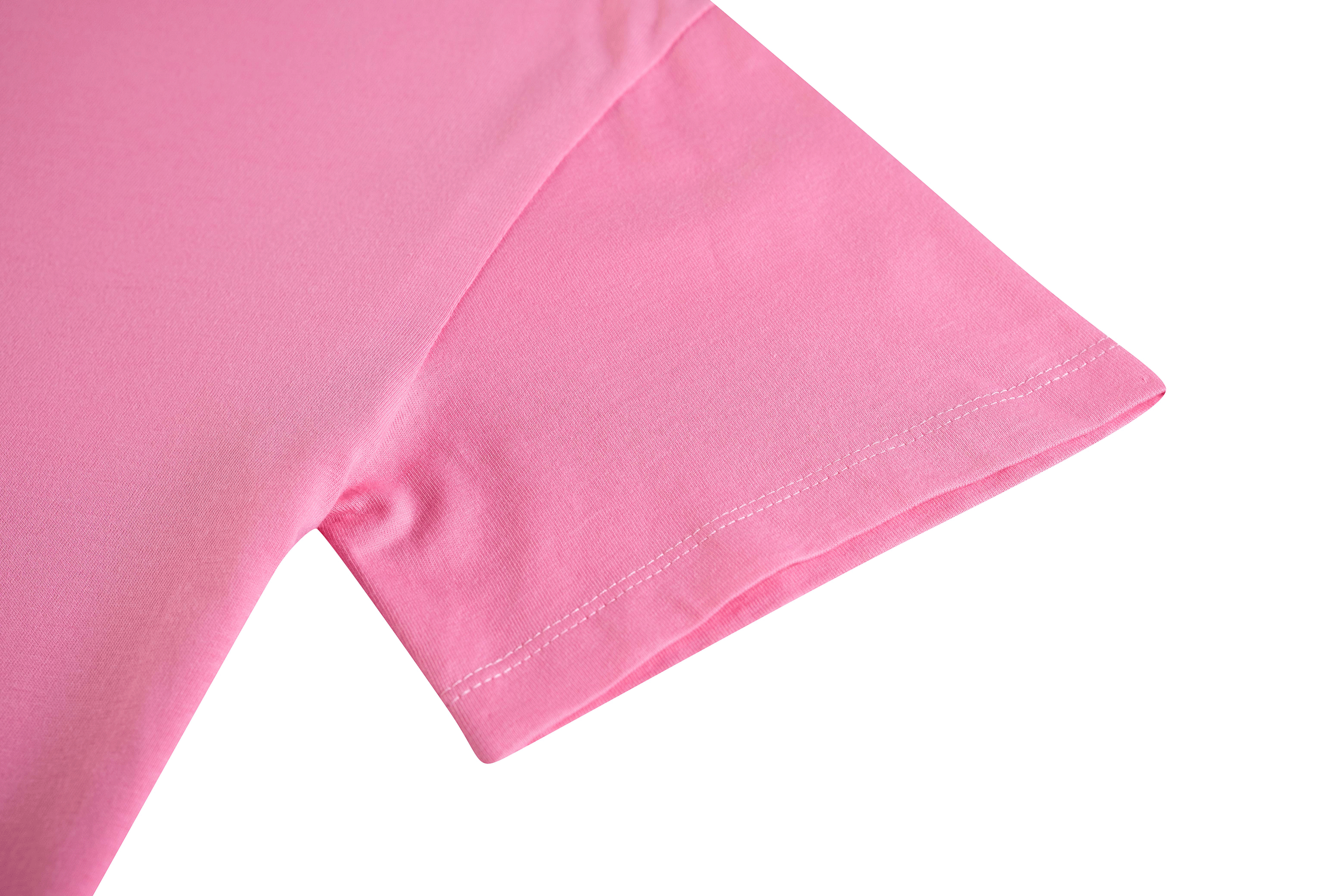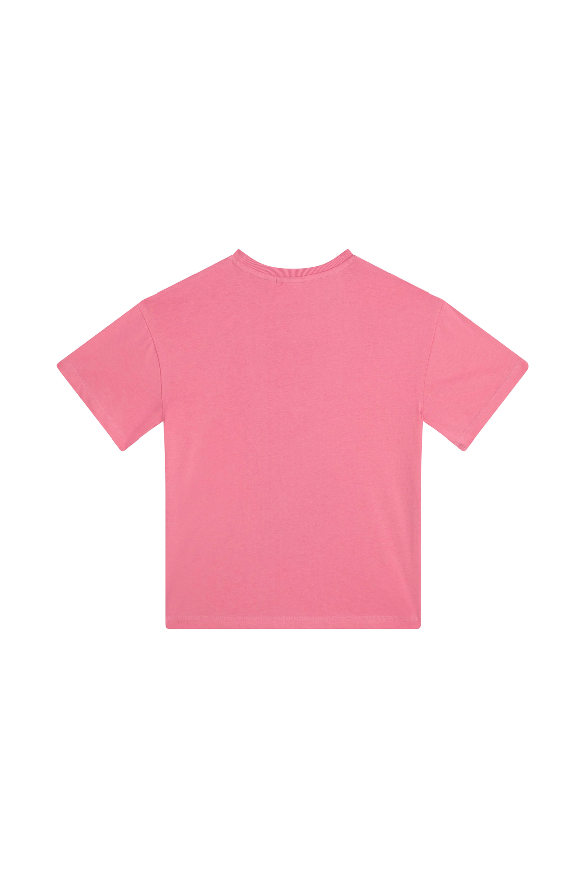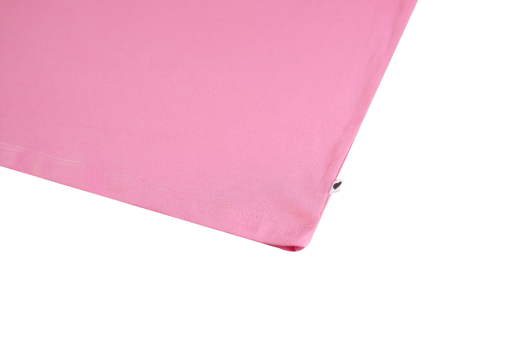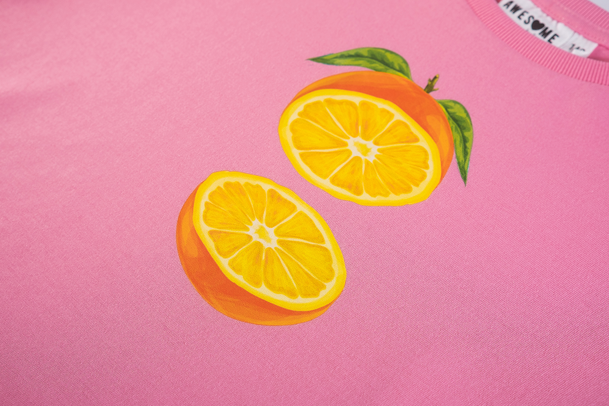 A cheerful pink T-shirt featuring a bright citrus print at the center. The two orange halves, complete with green leaves, add a playful, summery touch. Light, colourful, and perfect for warm days.