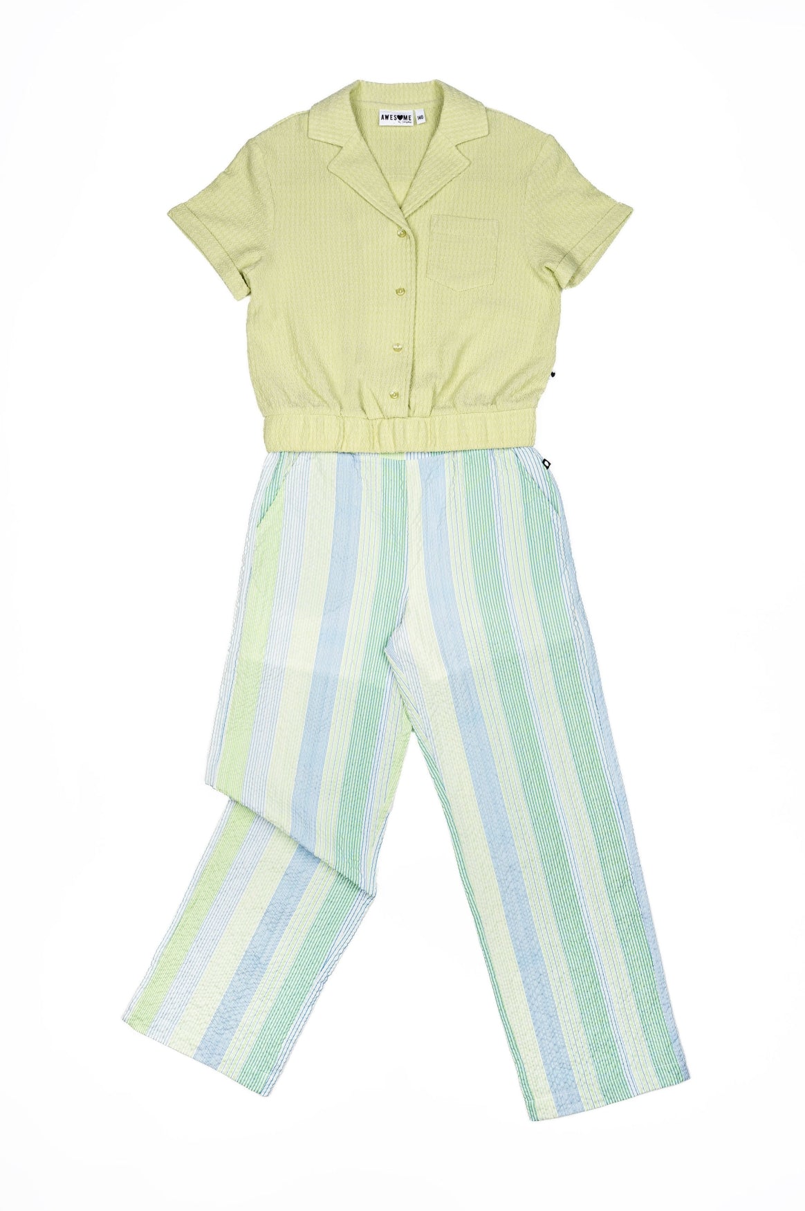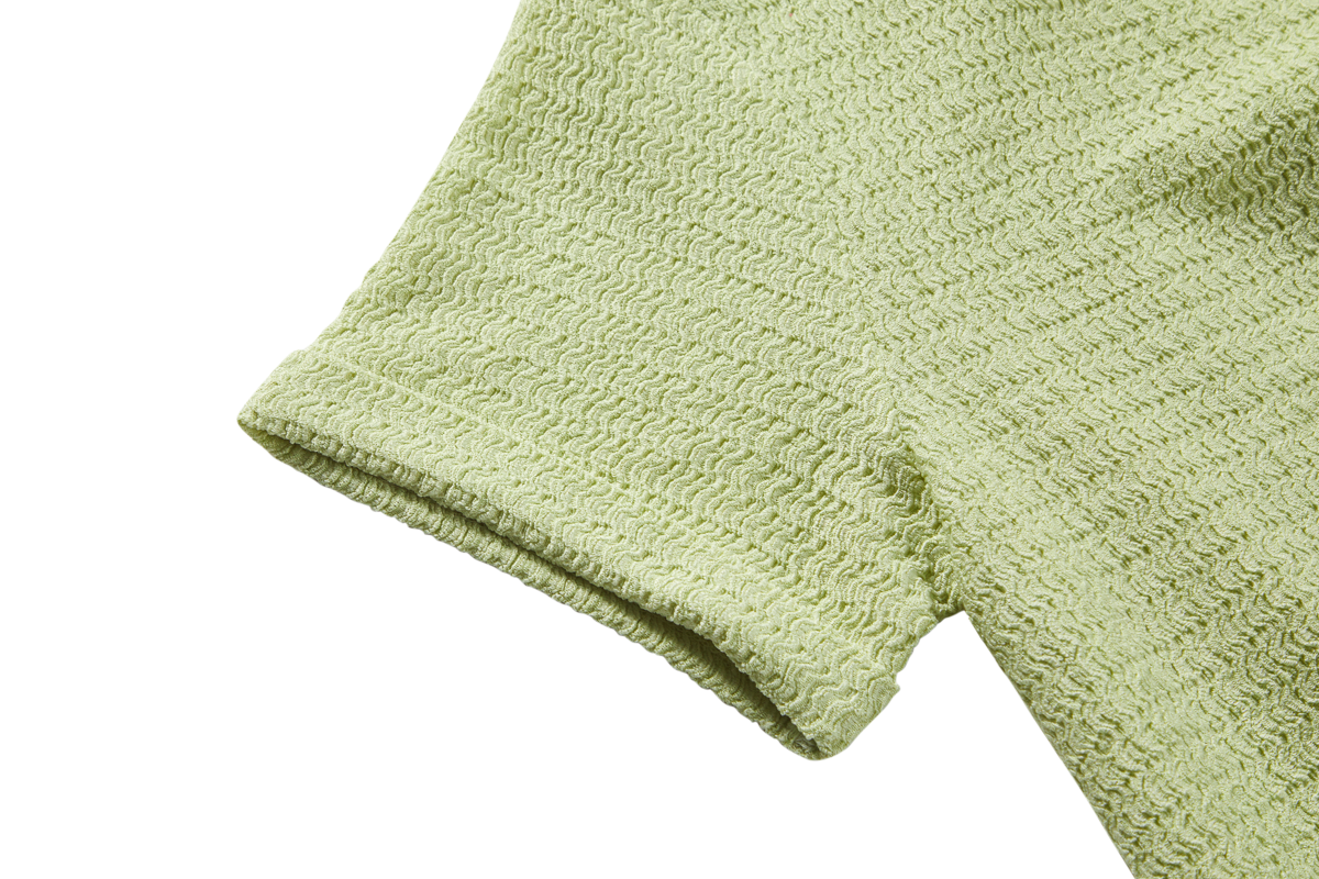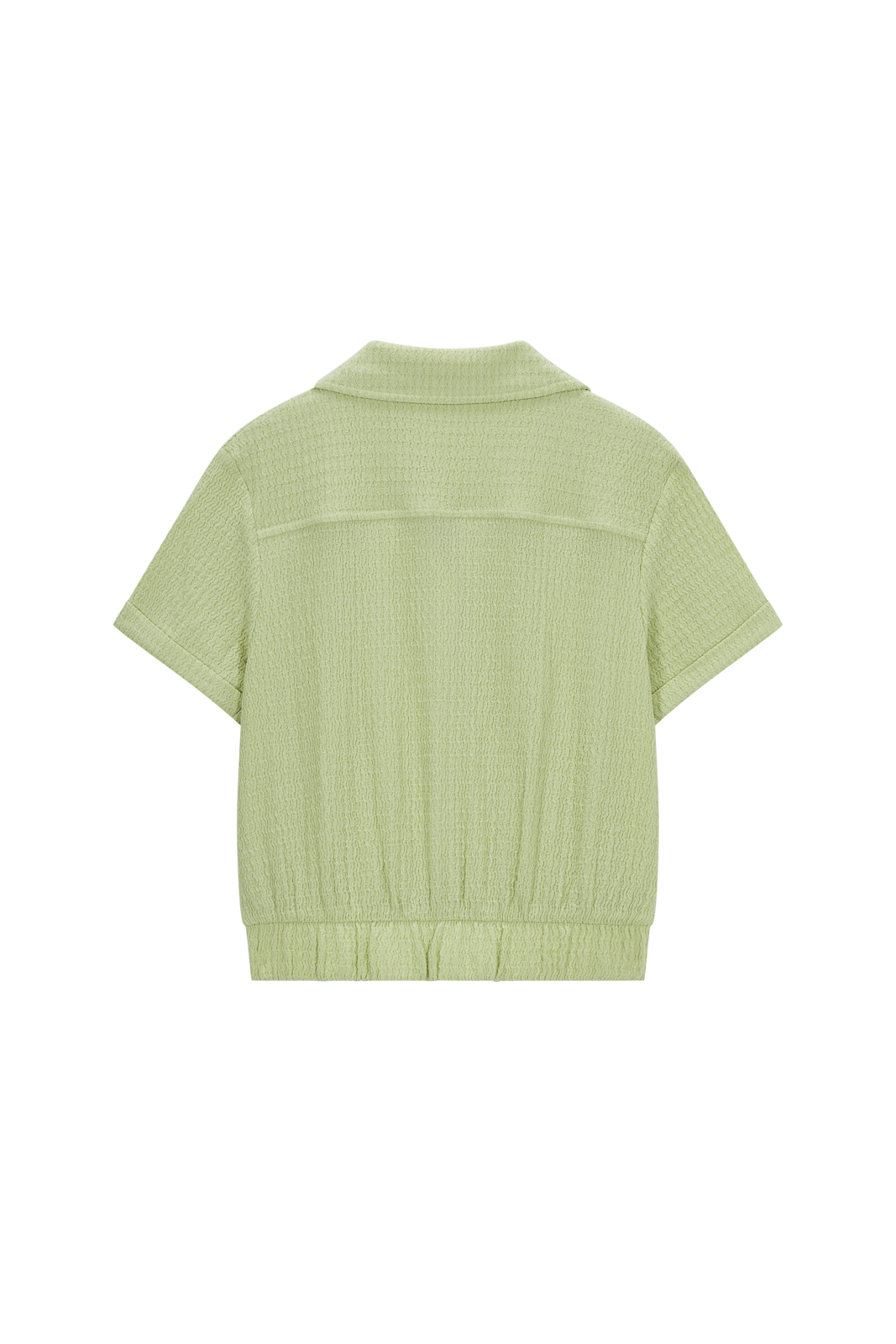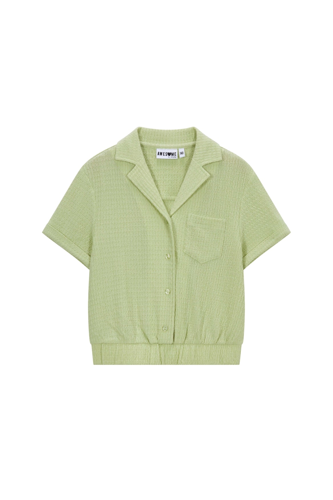 A fresh and trendy top in a soft pastel green shade! This blouse features a relaxed fit with short sleeves, a classic collar, and a front button closure. The elastic hem adds a playful, modern touch and helps the top sit nicely in place. Perfect for warm days and easy to style with shorts, a skirt, or lightweight trousers.