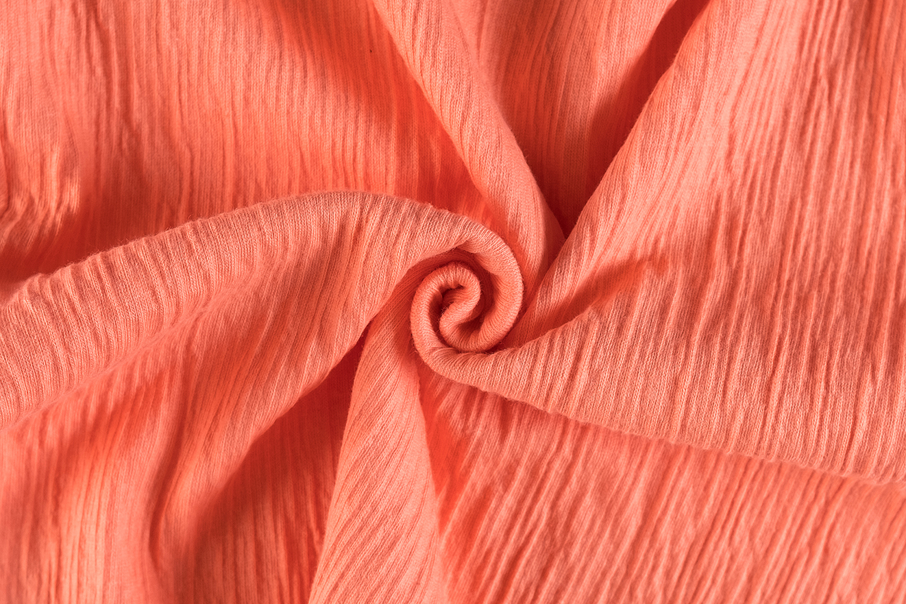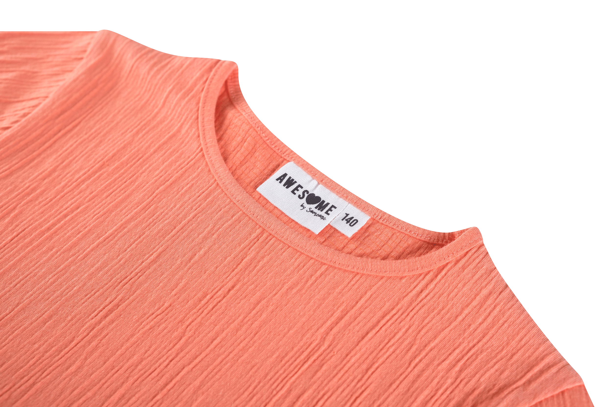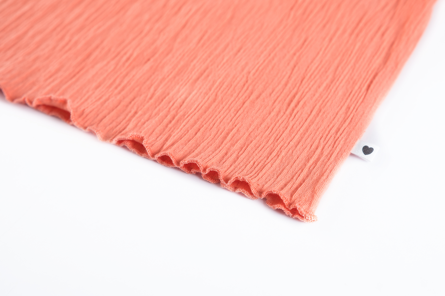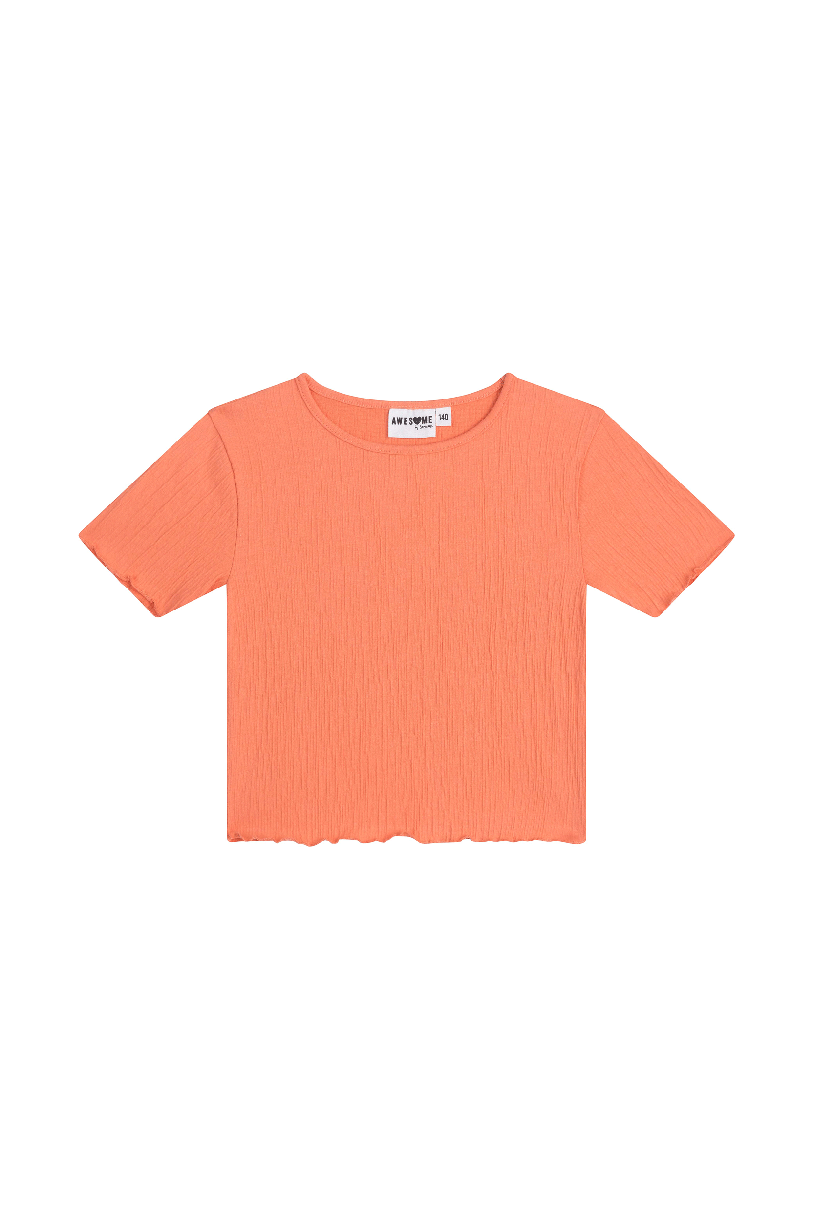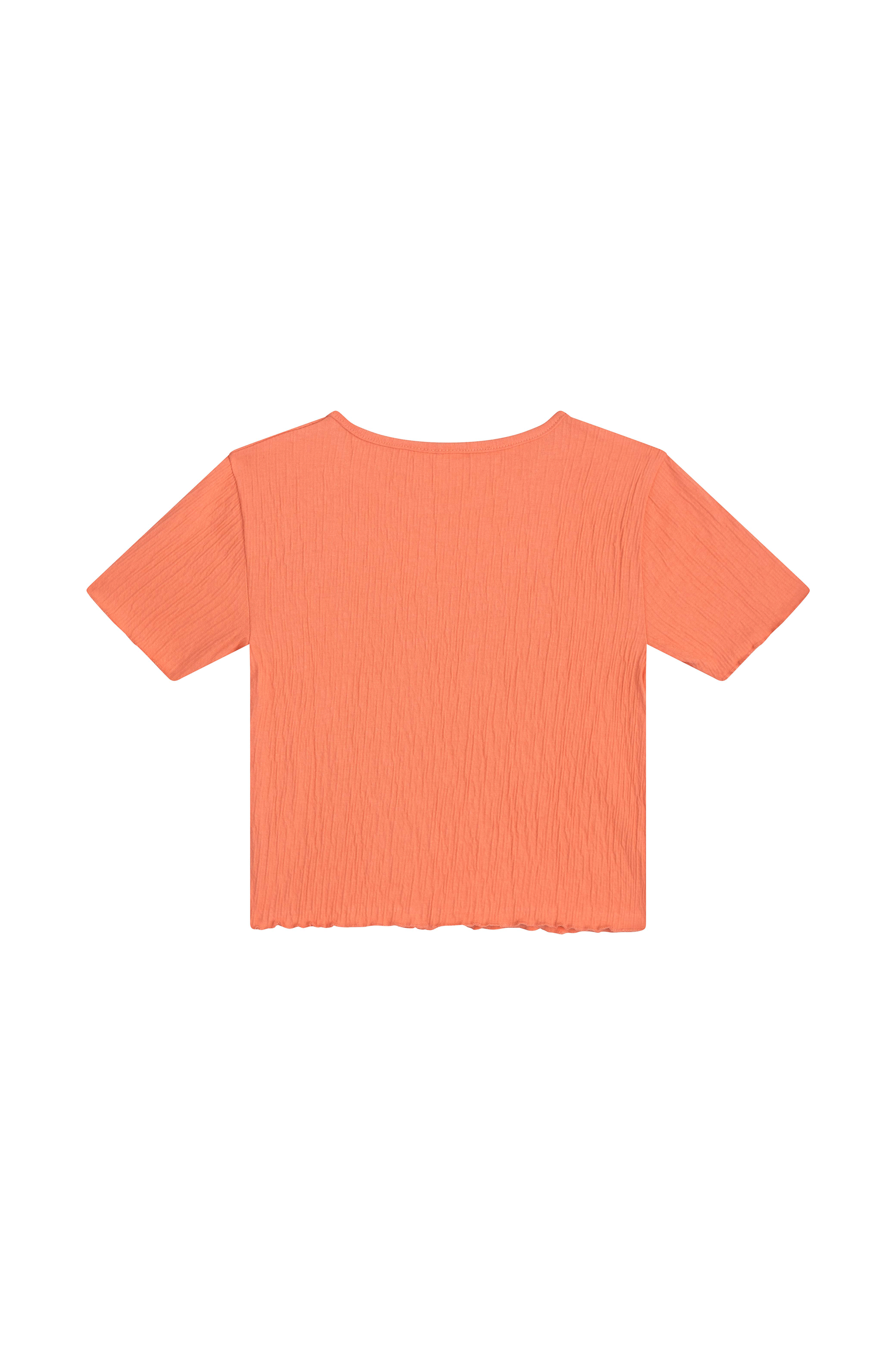 A fresh coral-coloured T-shirt with a gentle crinkled texture all over. The hem has a slight wavy finish that gives the piece a light, playful feel.