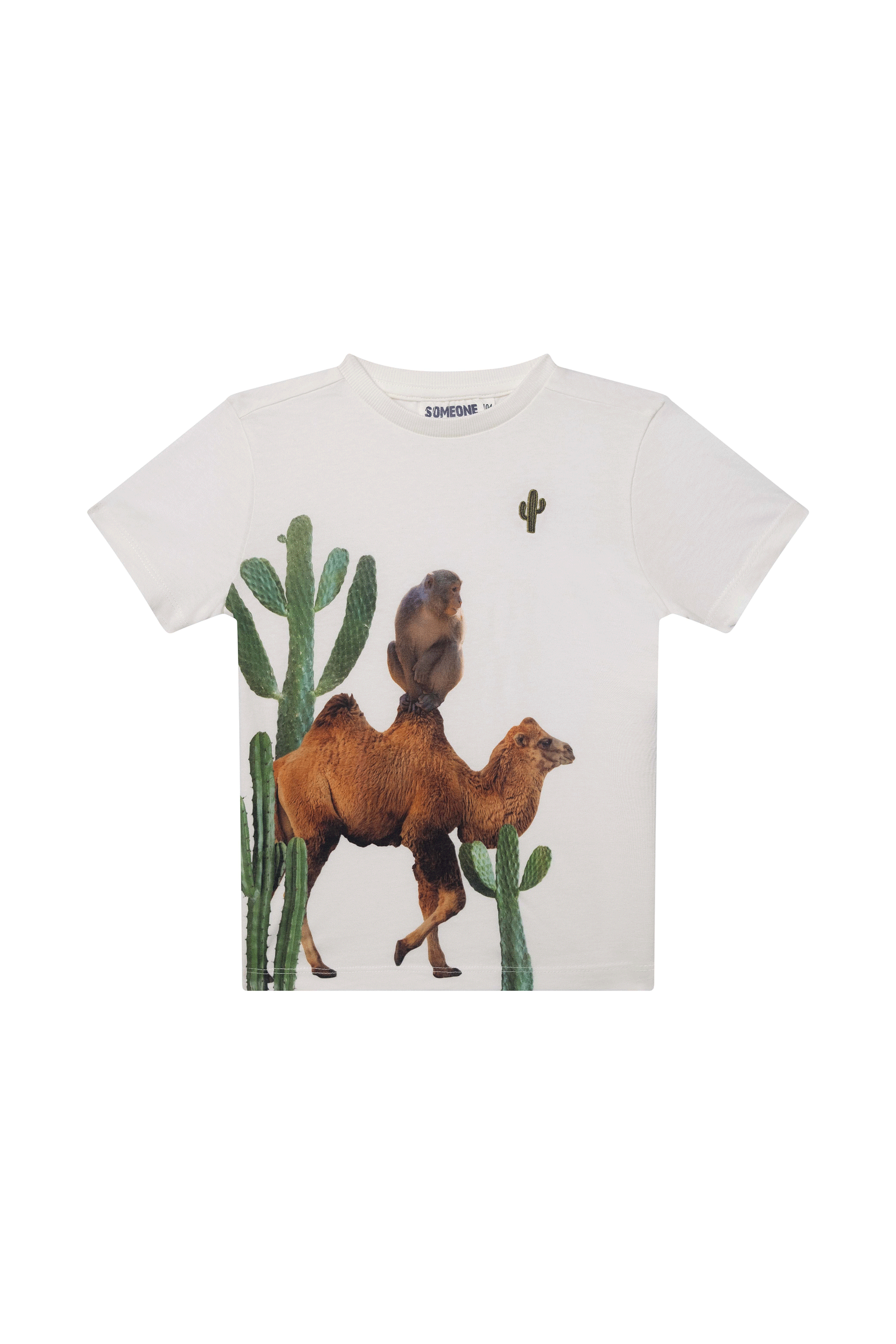 Dit T-shirt heeft een speelse en opvallende print van een kameel met een aapje op zijn rug, omringd door cactussen voor een echte woestijnsfeer. Op de borst staat een kleine cactus als extra detail dat het ontwerp mooi afwerkt. Dit is een vrolijk en uniek shirt dat perfect is voor kinderen die houden van avontuurlijke prints en veel kleur.