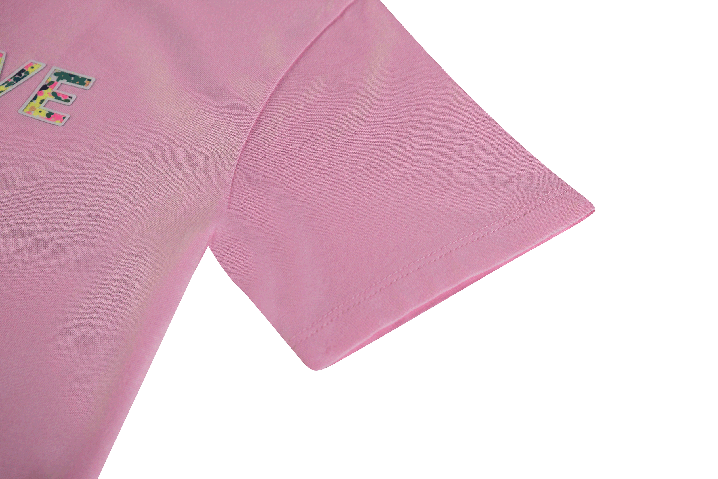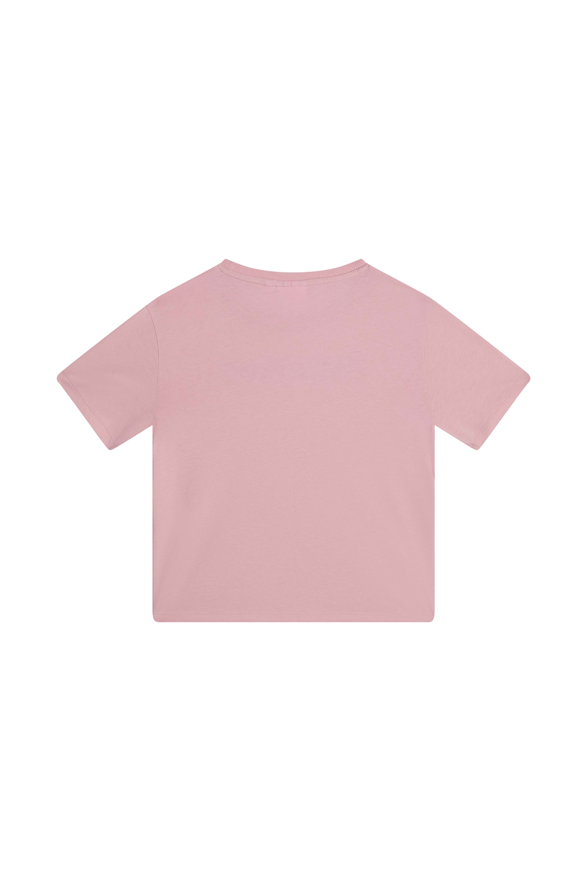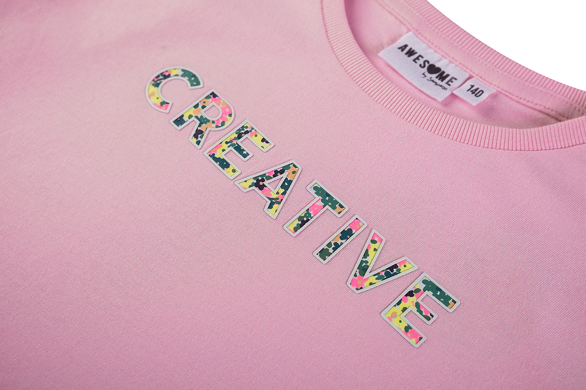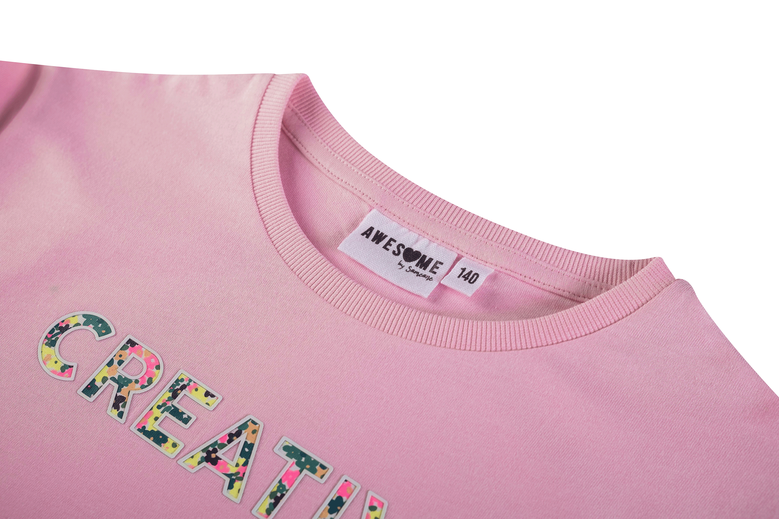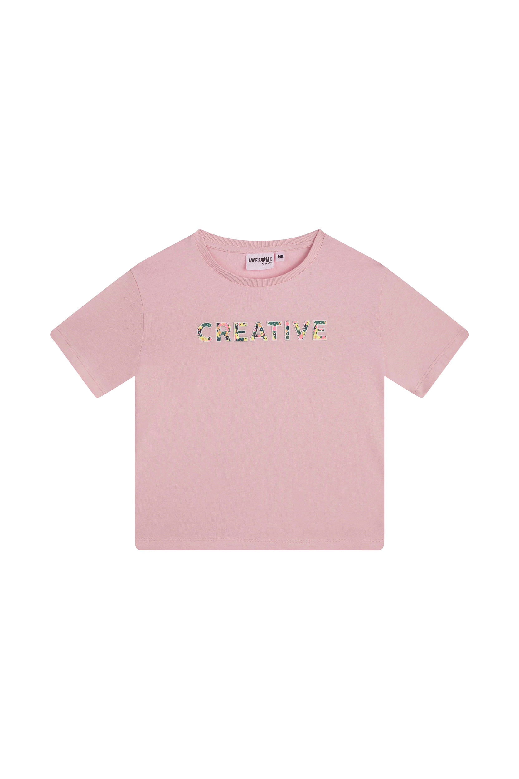 Een zachtroze T-shirt met in het midden het woord CREATIVE, uitgevoerd in een vrolijke, kleurrijke print. Het shirt heeft een eenvoudige snit, maar de speelse letters geven het meteen iets eigens.