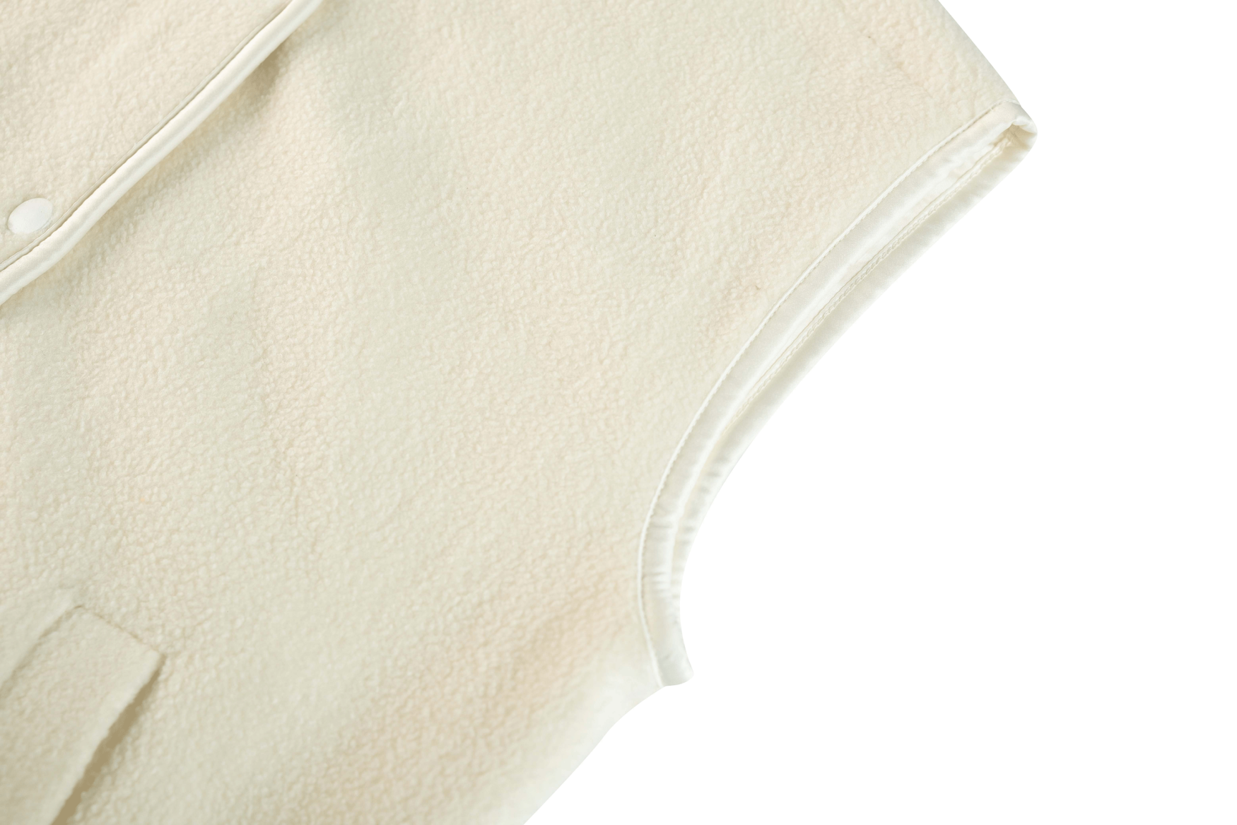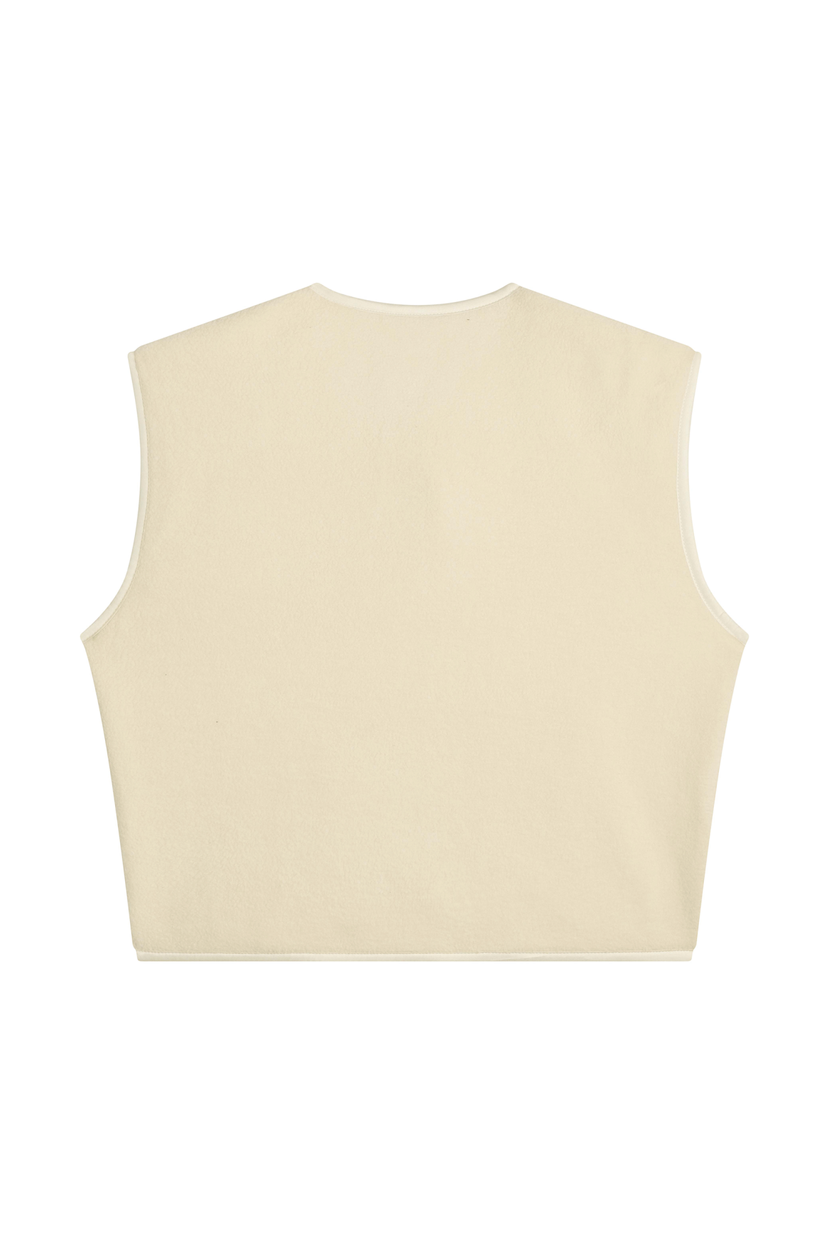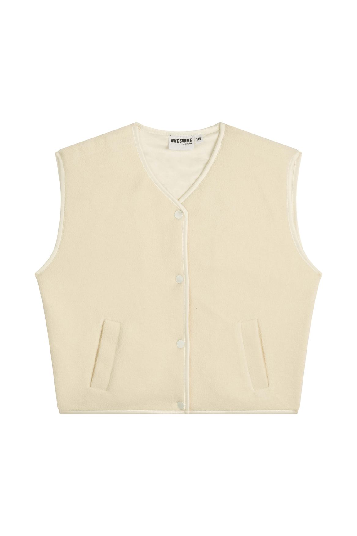 Een zachte, crèmekleurige bodywarmer met een minimalistische uitstraling. De V-hals en de drukknopen aan de voorkant geven het ontwerp een strakke en moderne look, terwijl de twee voorzakken zorgen voor een praktische touch. Een veelzijdig item dat gemakkelijk over elke outfit kan worden gedragen.