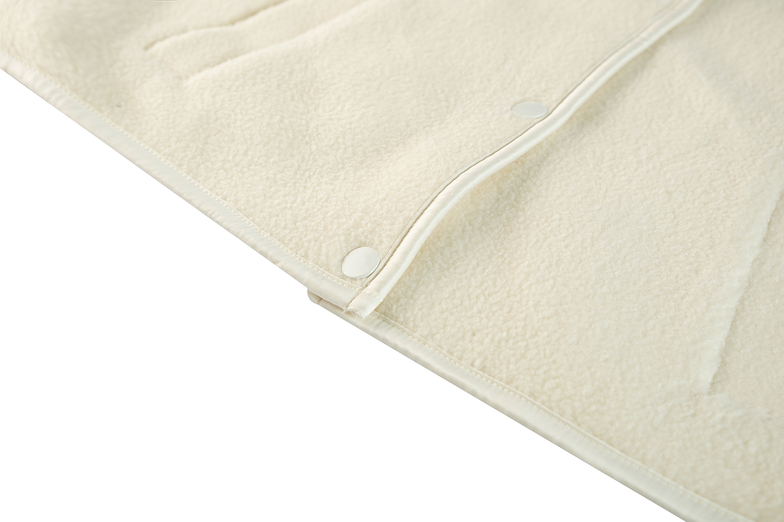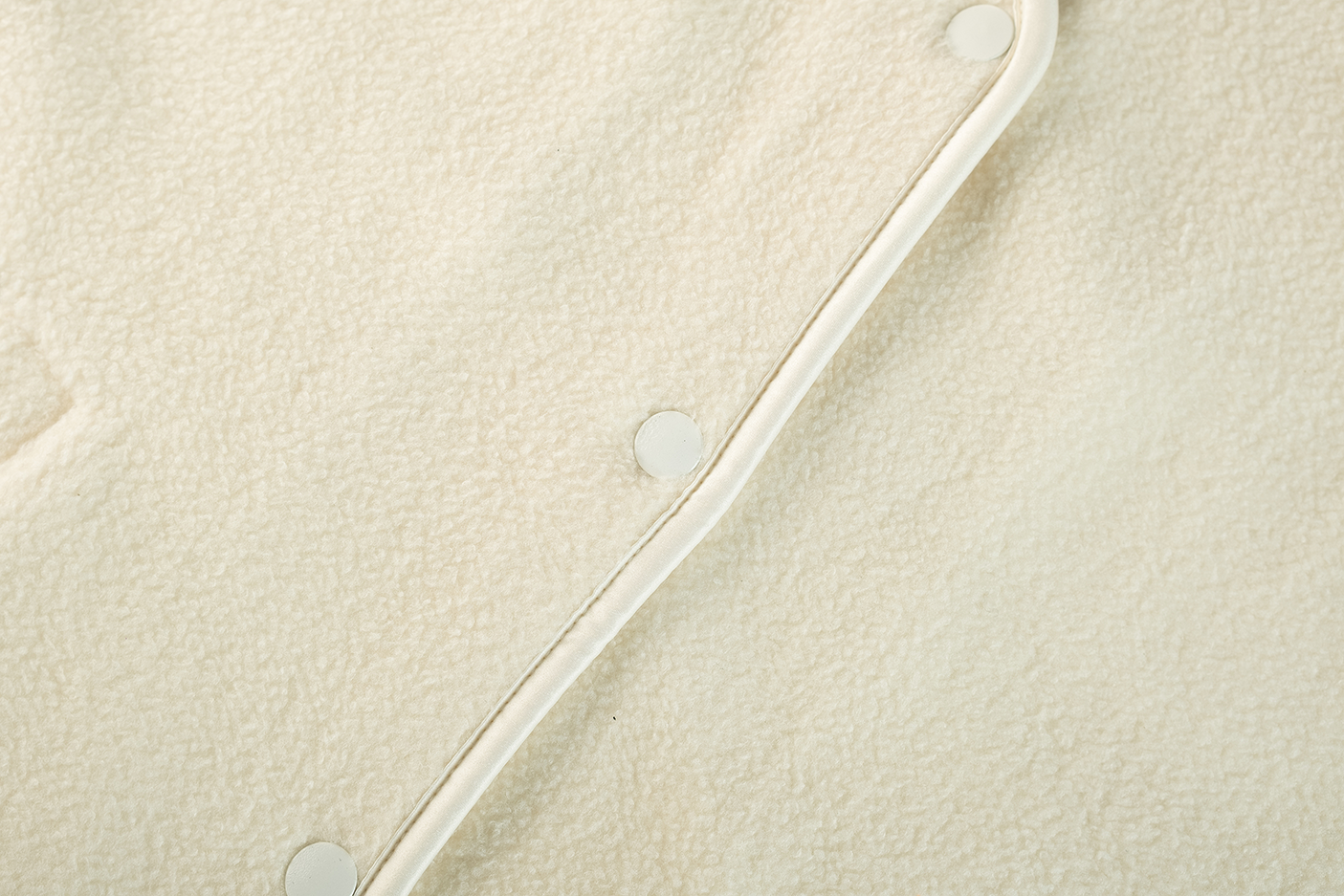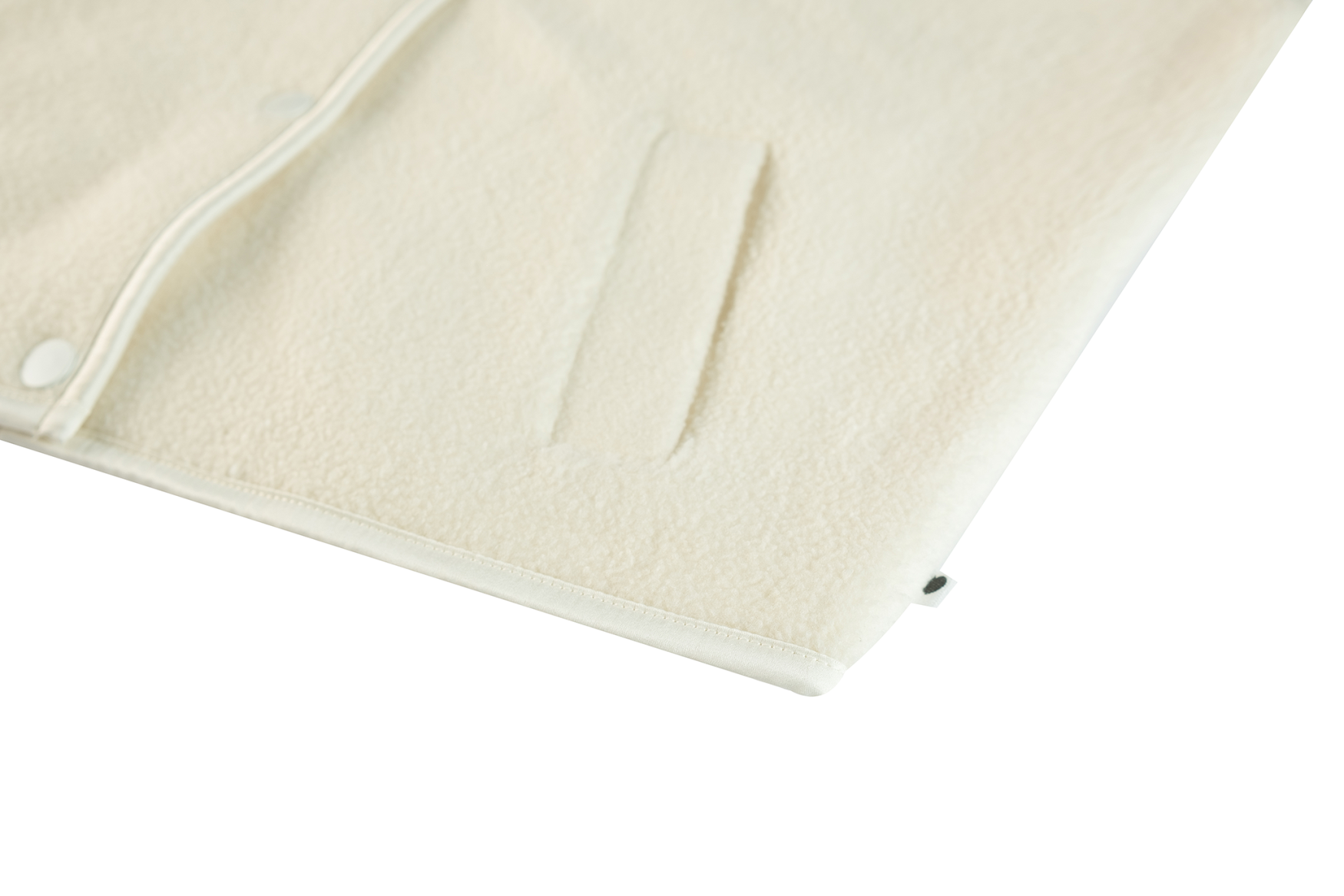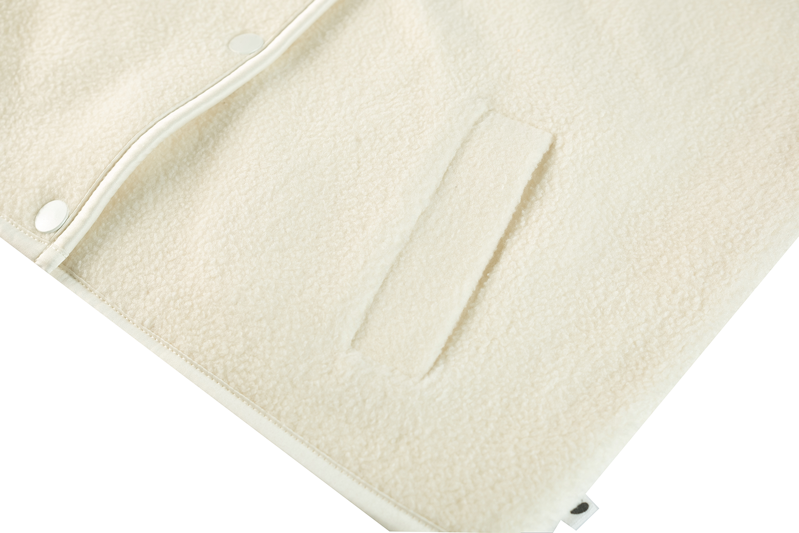 Een zachte, crèmekleurige bodywarmer met een minimalistische uitstraling. De V-hals en de drukknopen aan de voorkant geven het ontwerp een strakke en moderne look, terwijl de twee voorzakken zorgen voor een praktische touch. Een veelzijdig item dat gemakkelijk over elke outfit kan worden gedragen.