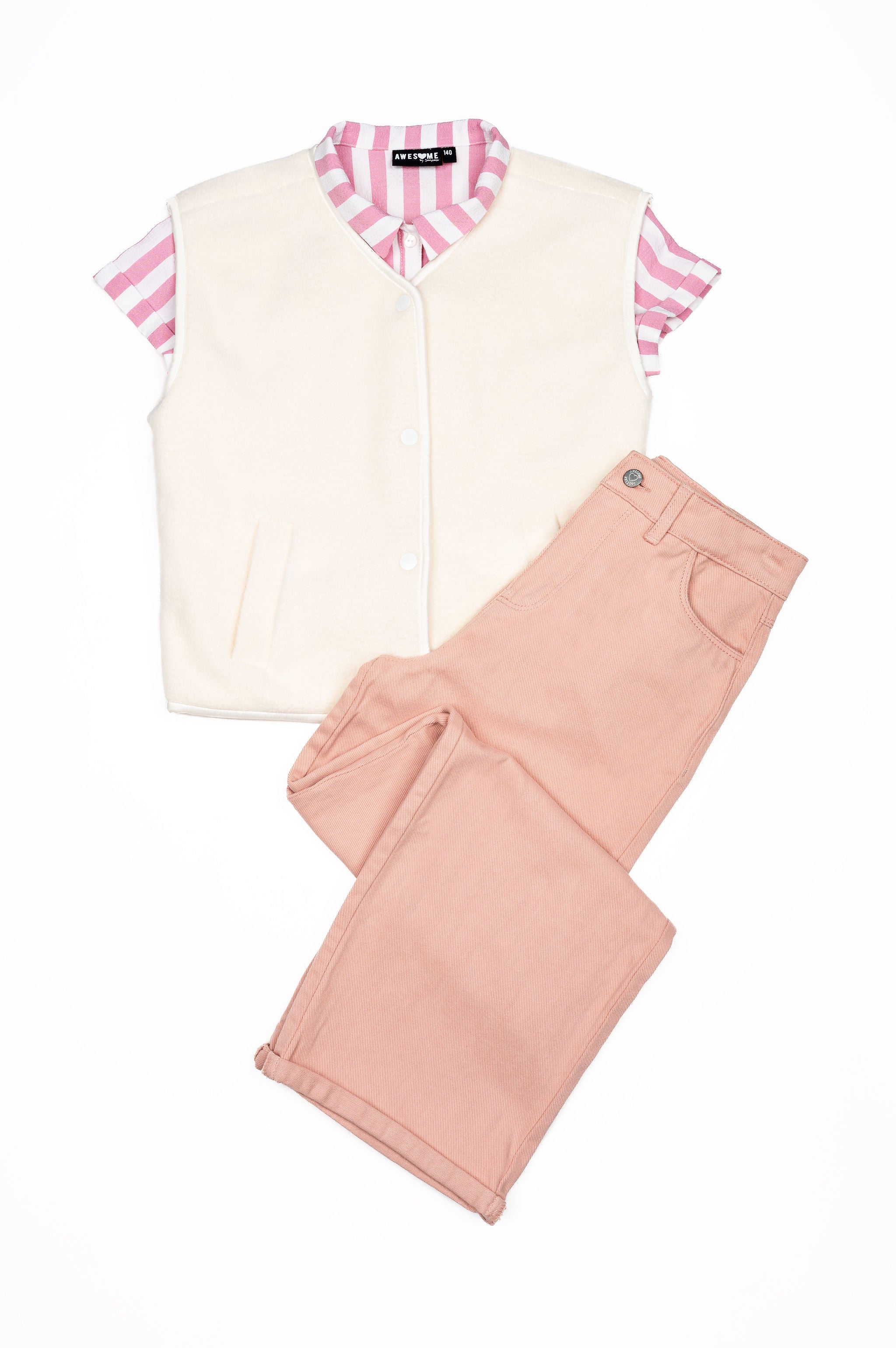 Een zachte en stijlvolle outfit met een frisse voorjaarslook! De roze-wit gestreepte top geeft de set een speels accent, terwijl het crèmekleurige vestje met drukknoopjes zorgt voor een cosy en moderne touch. De lichtroze broek maakt de outfit helemaal compleet en geeft een rustige, modieuze uitstraling. Perfect voor school, uitstapjes of een casual dag waarop je toch leuk gekleed wilt zijn.