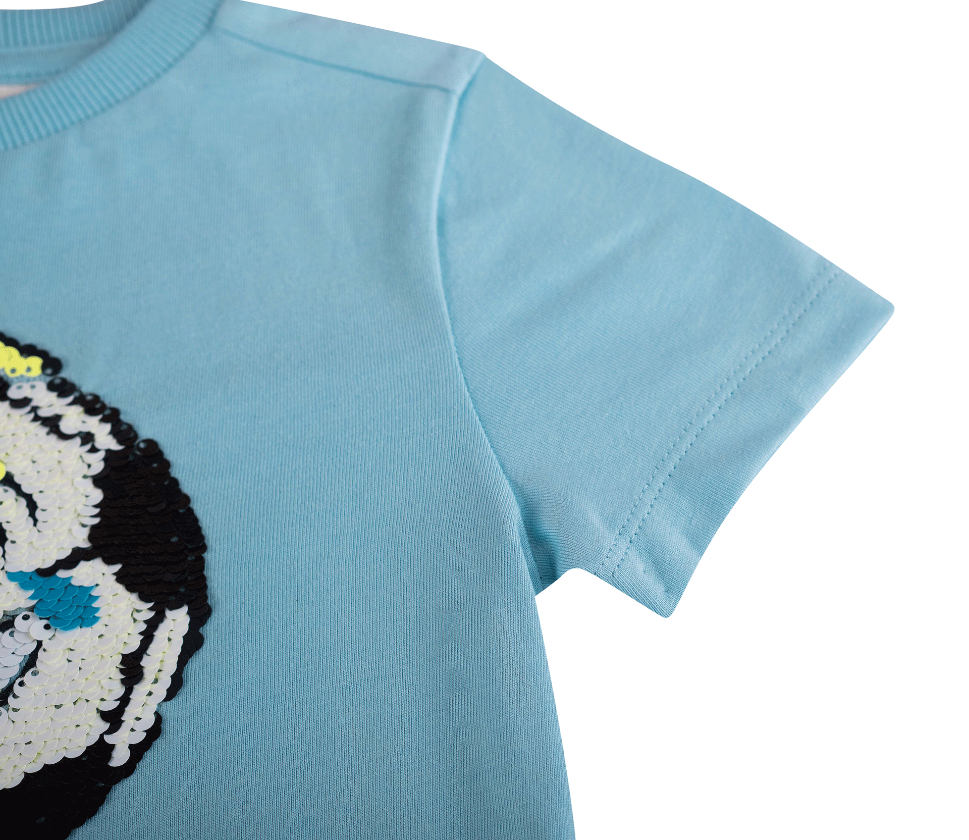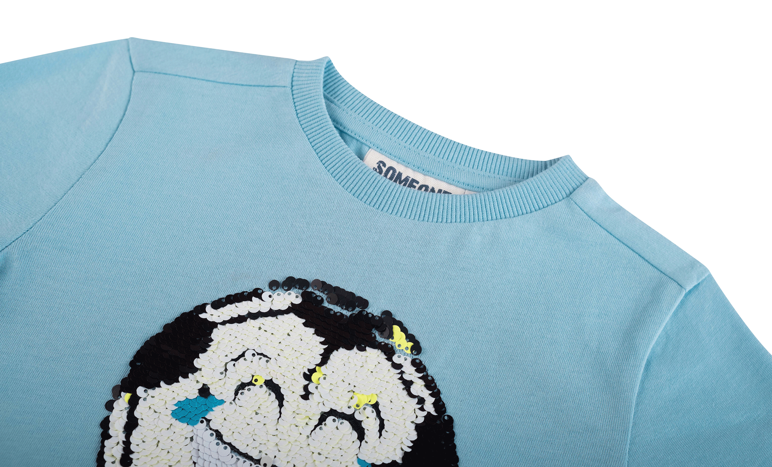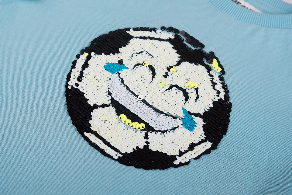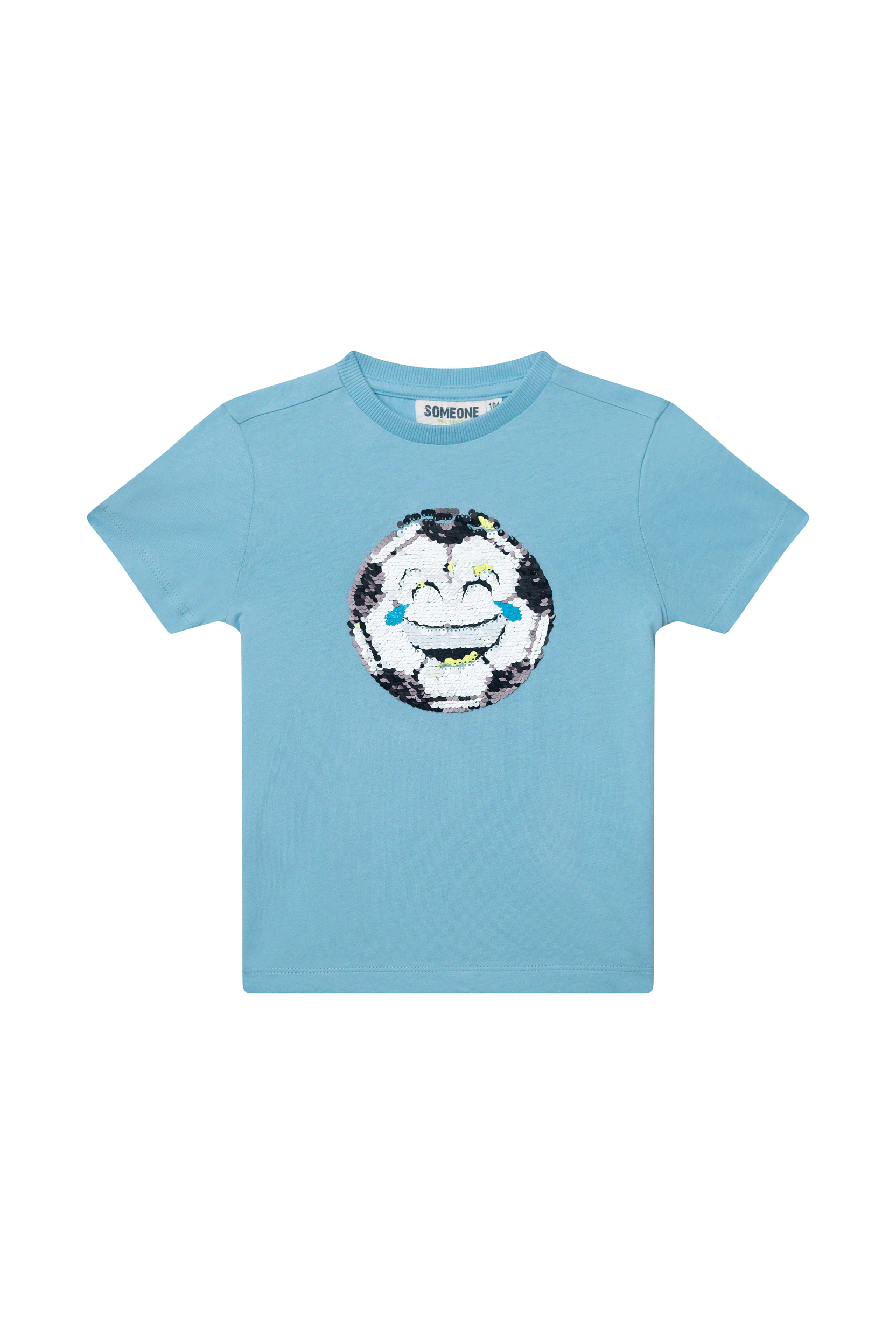 Dit lichtblauwe T-shirt heeft een opvallende paillettenpatch in het midden waarop een voetbal staat die verandert in een lachende emoji met tranen van het lachen. De glinsterende pailletten zorgen voor een speels effect dat kinderen geweldig vinden en uitnodigt om ermee te spelen. Een vrolijk en dynamisch T-shirt dat elke outfit meteen extra fun geeft.