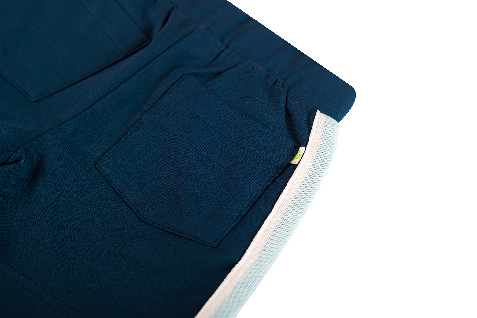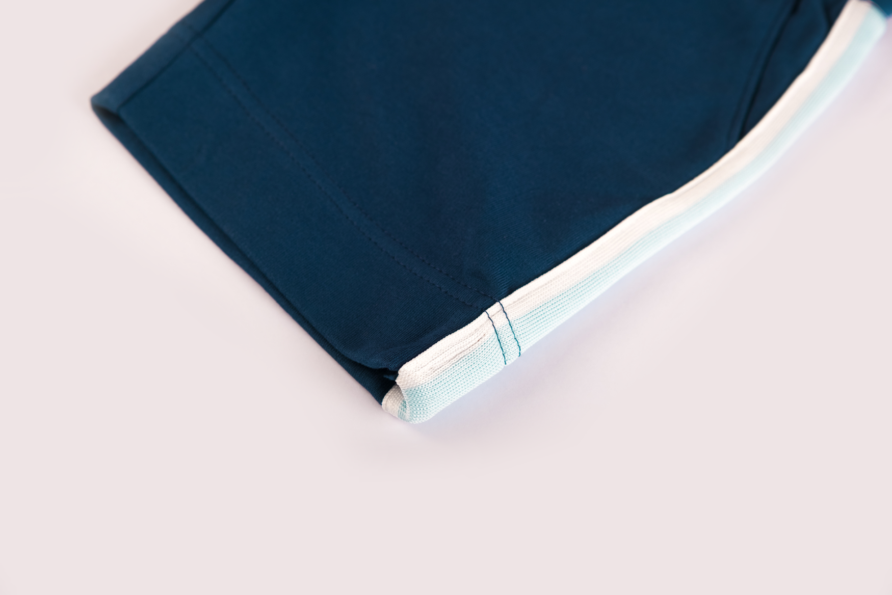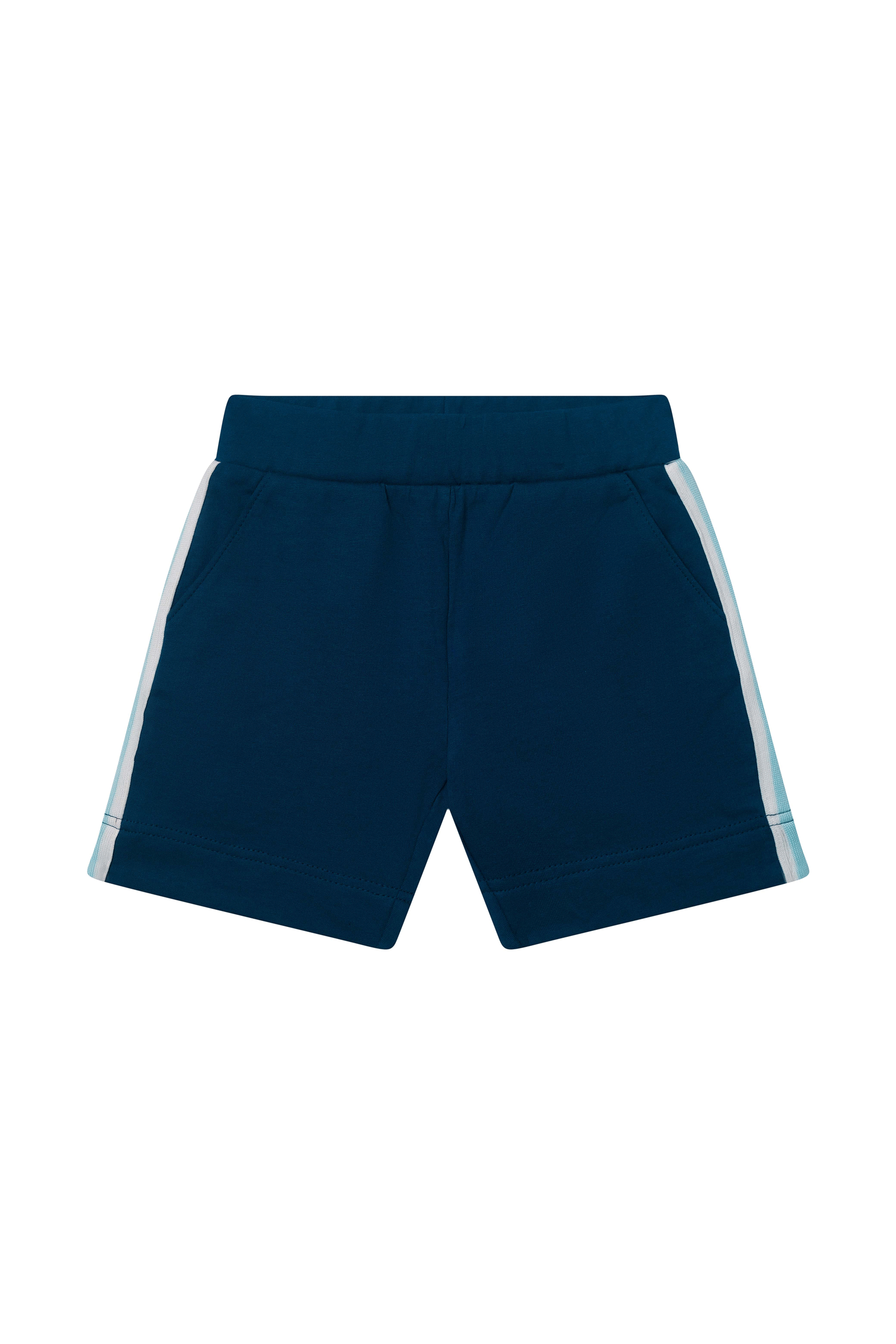 Deze donkerblauwe korte broek heeft een sportieve uitstraling dankzij de opvallende strepen langs de zijkanten. De zachte stof en de elastische tailleband zorgen ervoor dat hij comfortabel zit, zowel tijdens het spelen als op warme dagen. De diepe steekzakken maken hem extra praktisch voor kleine schatten of handige spulletjes. Een fijne basic die makkelijk te combineren is met T-shirts, hoodies en sneakers.