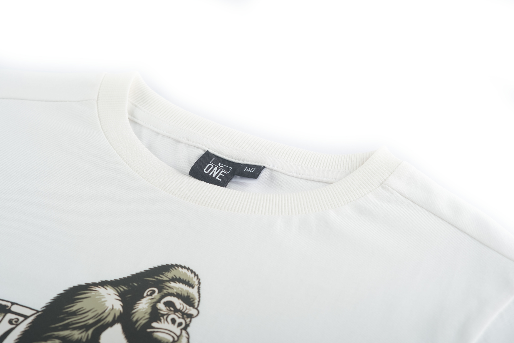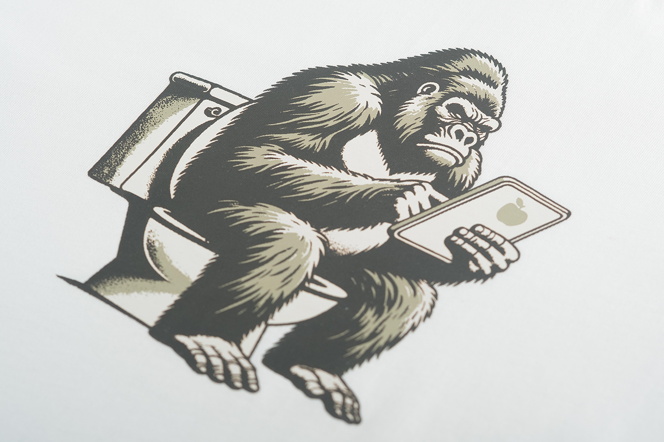 Dit T-shirt heeft een grappige print van een gorilla die relaxed op het toilet zit met een smartphone, wat zorgt voor een speelse en humoristische look. De minimalistische witte achtergrond laat de illustratie extra opvallen, waardoor dit shirt een echte blikvanger is. Perfect voor kids die houden van leuke en originele prints.