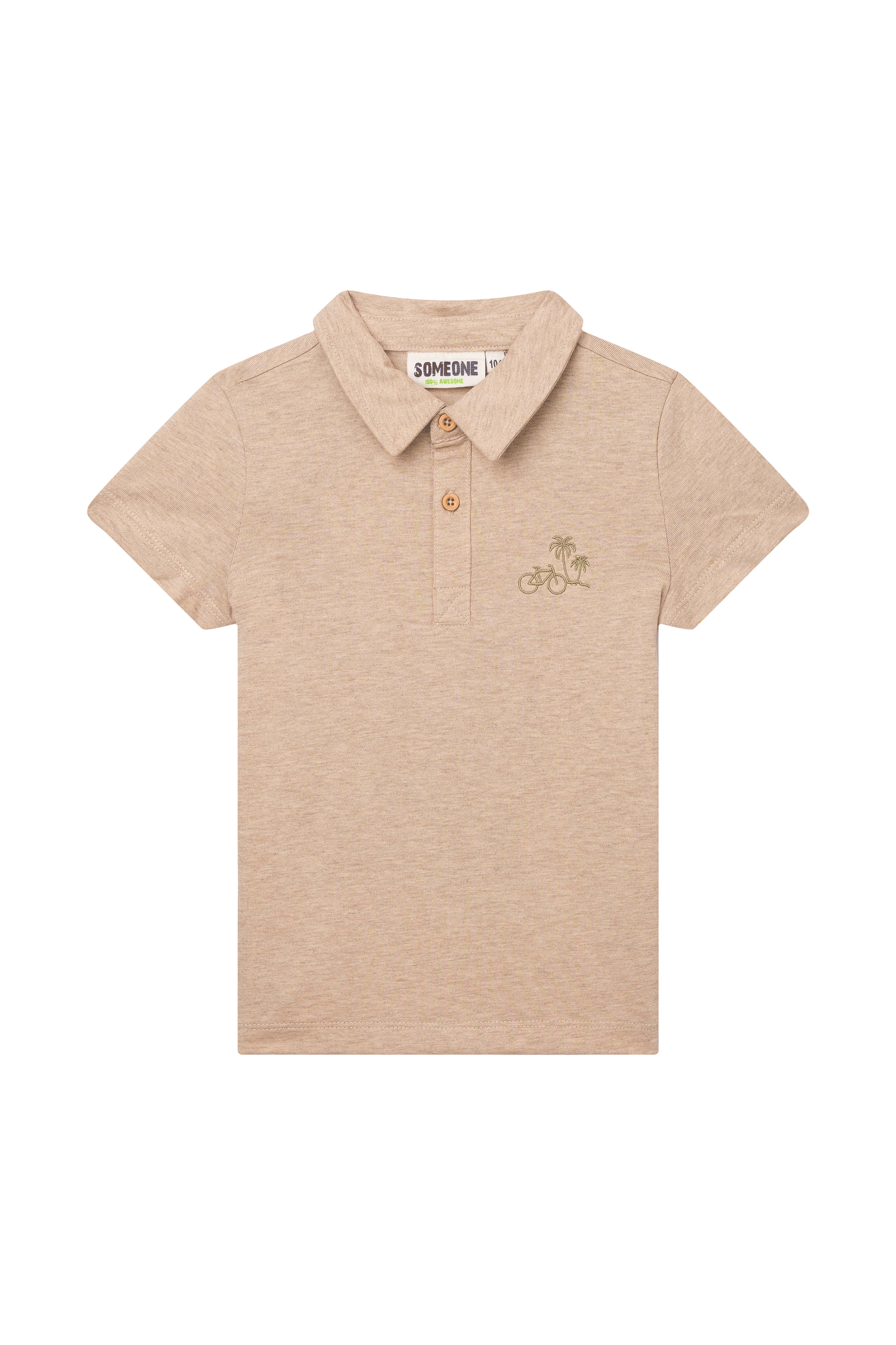 Deze beige polo heeft een subtiel geborduurd motief van palmbomen en een fiets op de borst, wat zorgt voor een ontspannen vakantiesfeer. De klassieke kraag met twee knopen geeft het shirt een tijdloze uitstraling die makkelijk te combineren is. Een veelzijdig stuk dat zowel casual als nét iets netter gedragen kan worden.