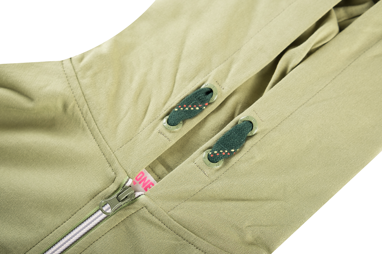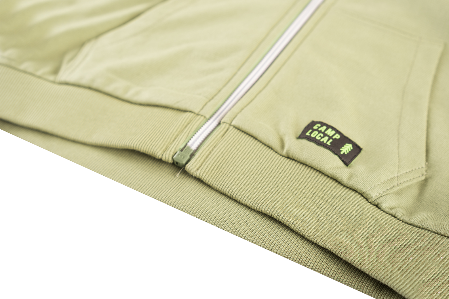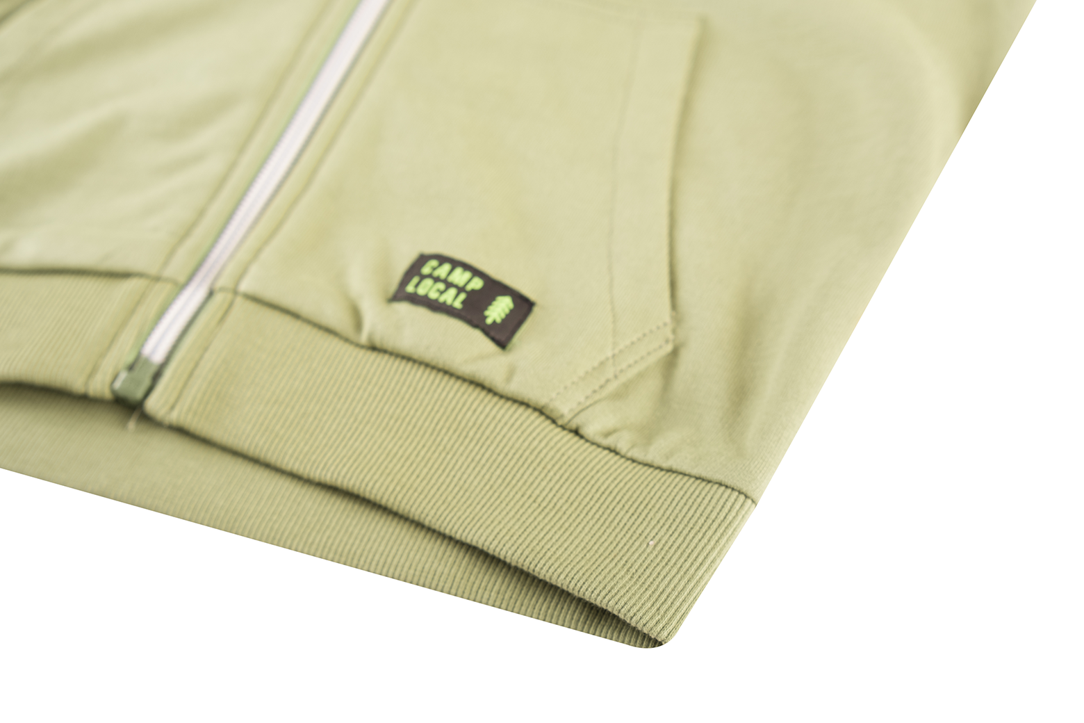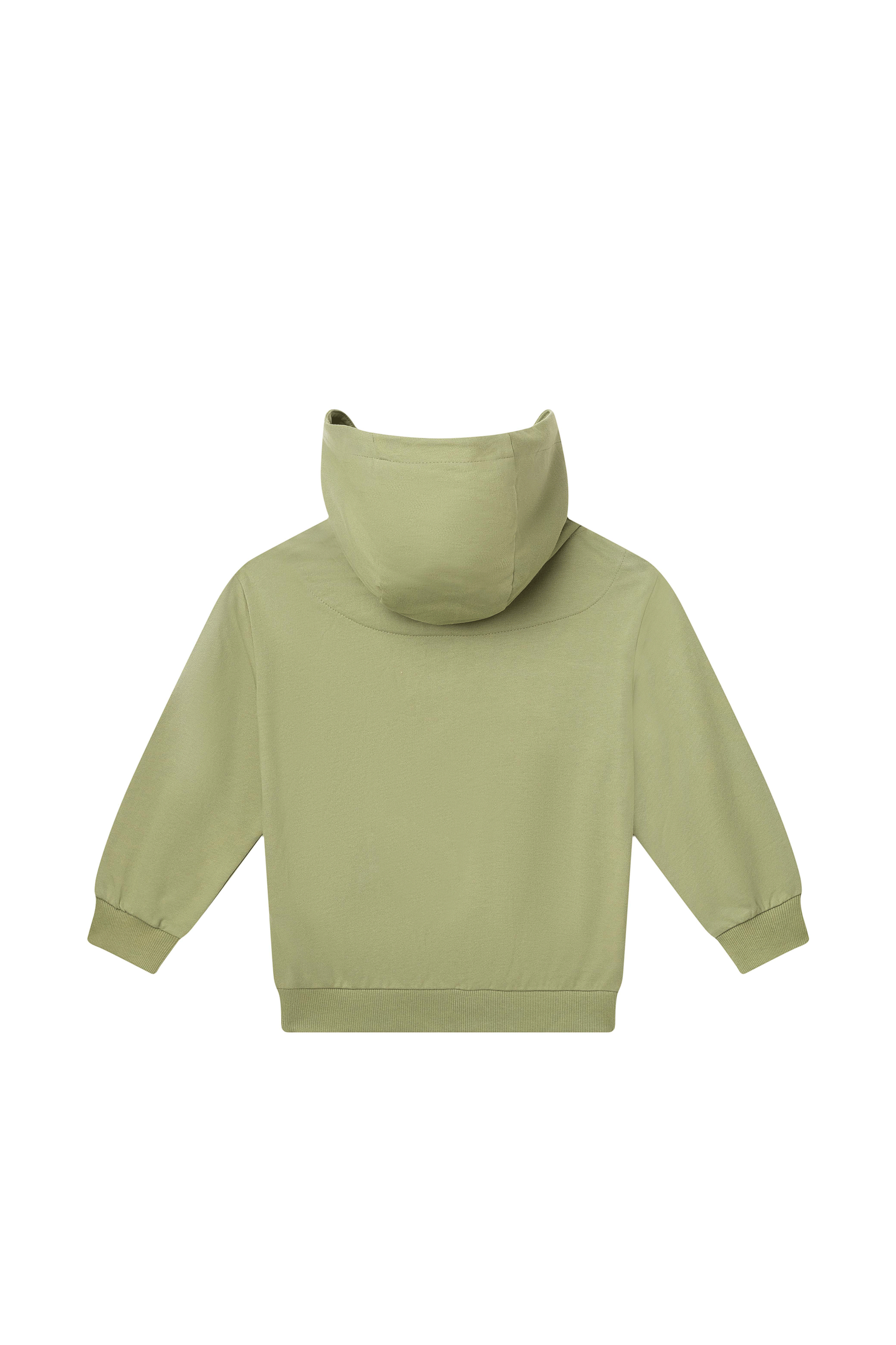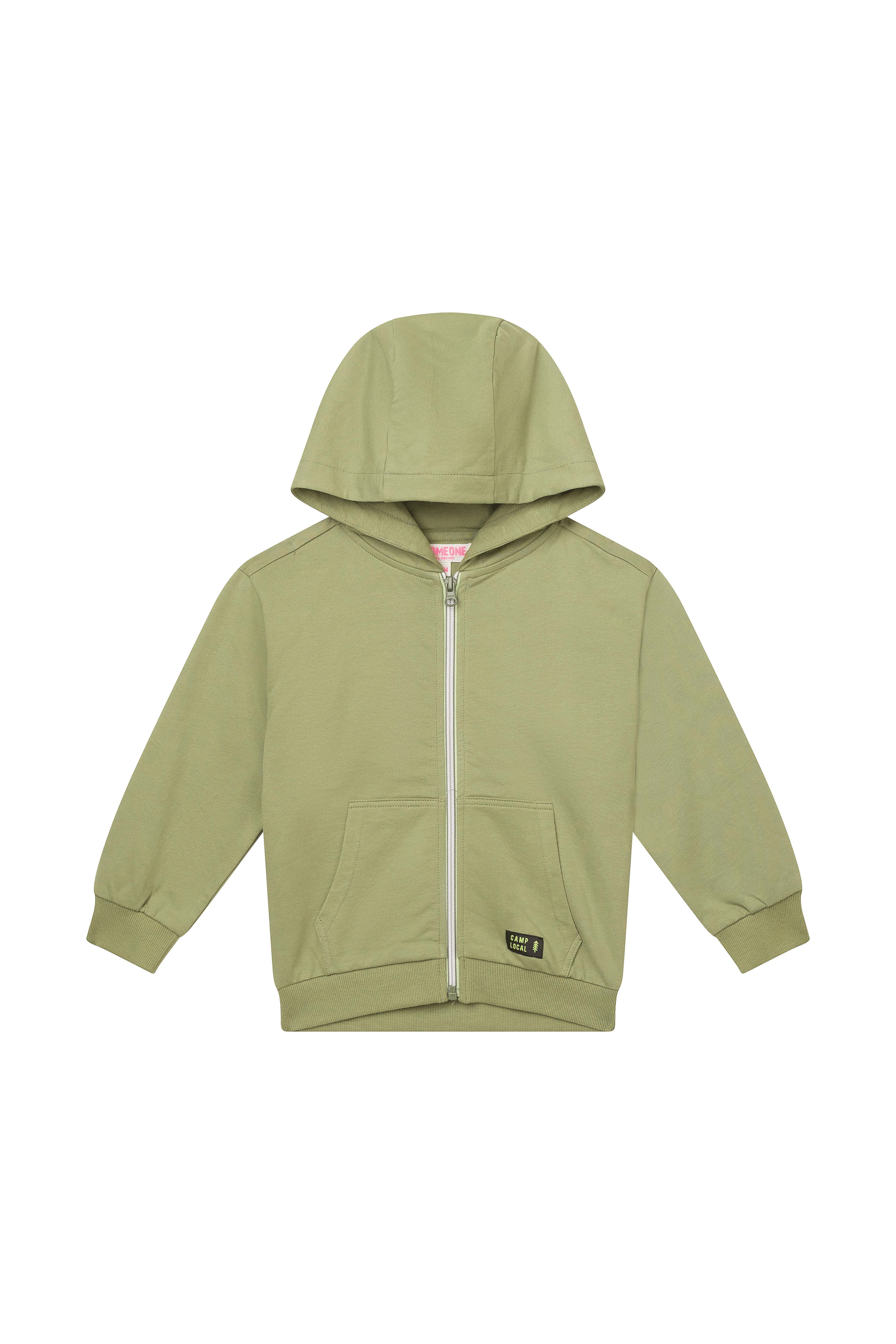 Deze comfortabele hoodie in zacht olijfgroen heeft een klassieke look met capuchon, handige rits en een grote kangoeroezak, afgewerkt met een subtiel labeldetail voor een stoere, tijdloze uitstraling.