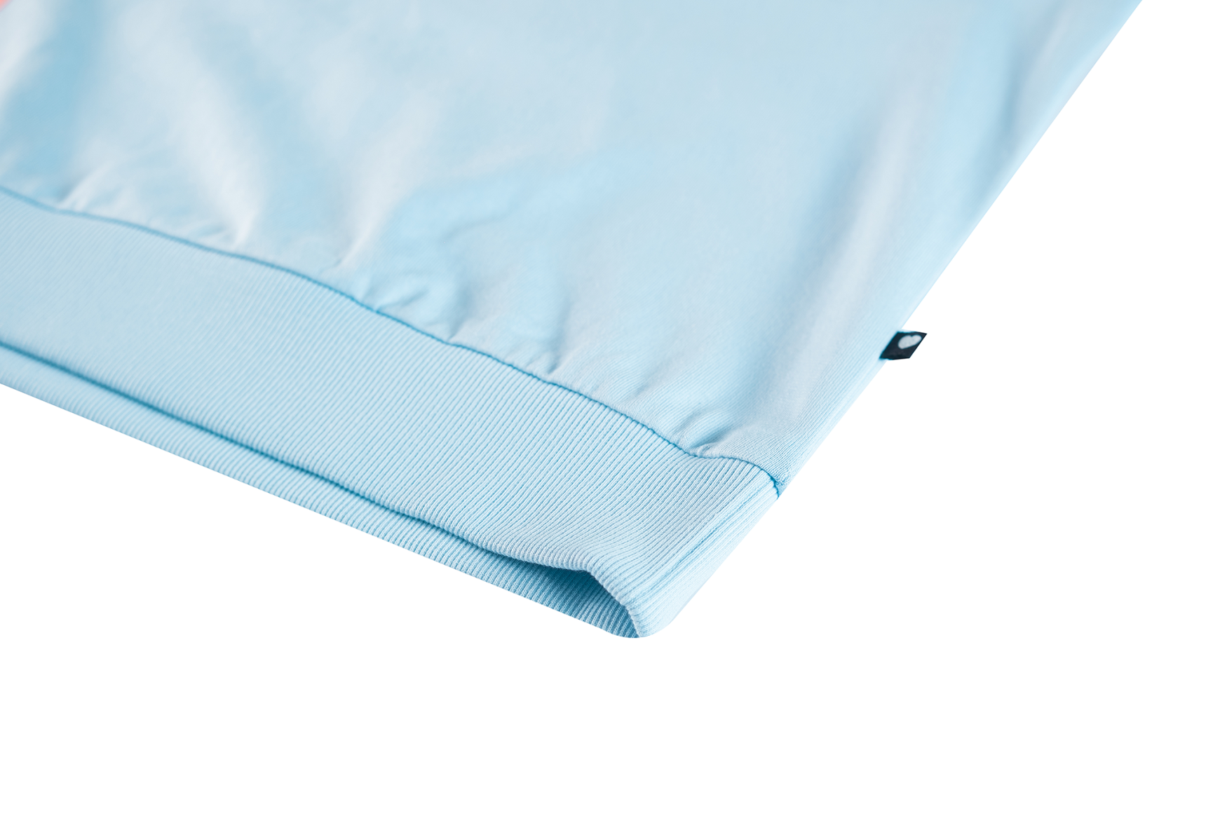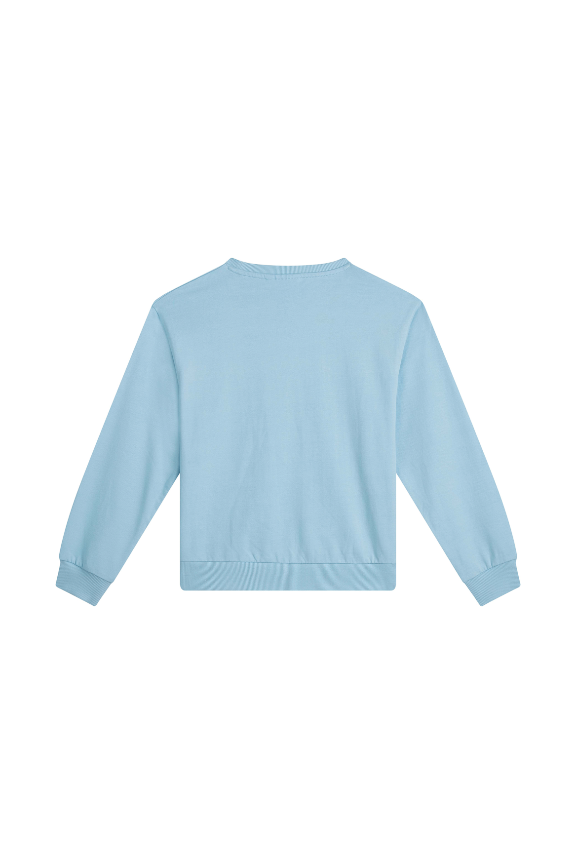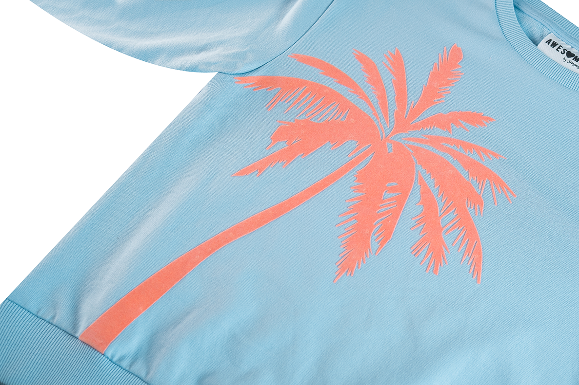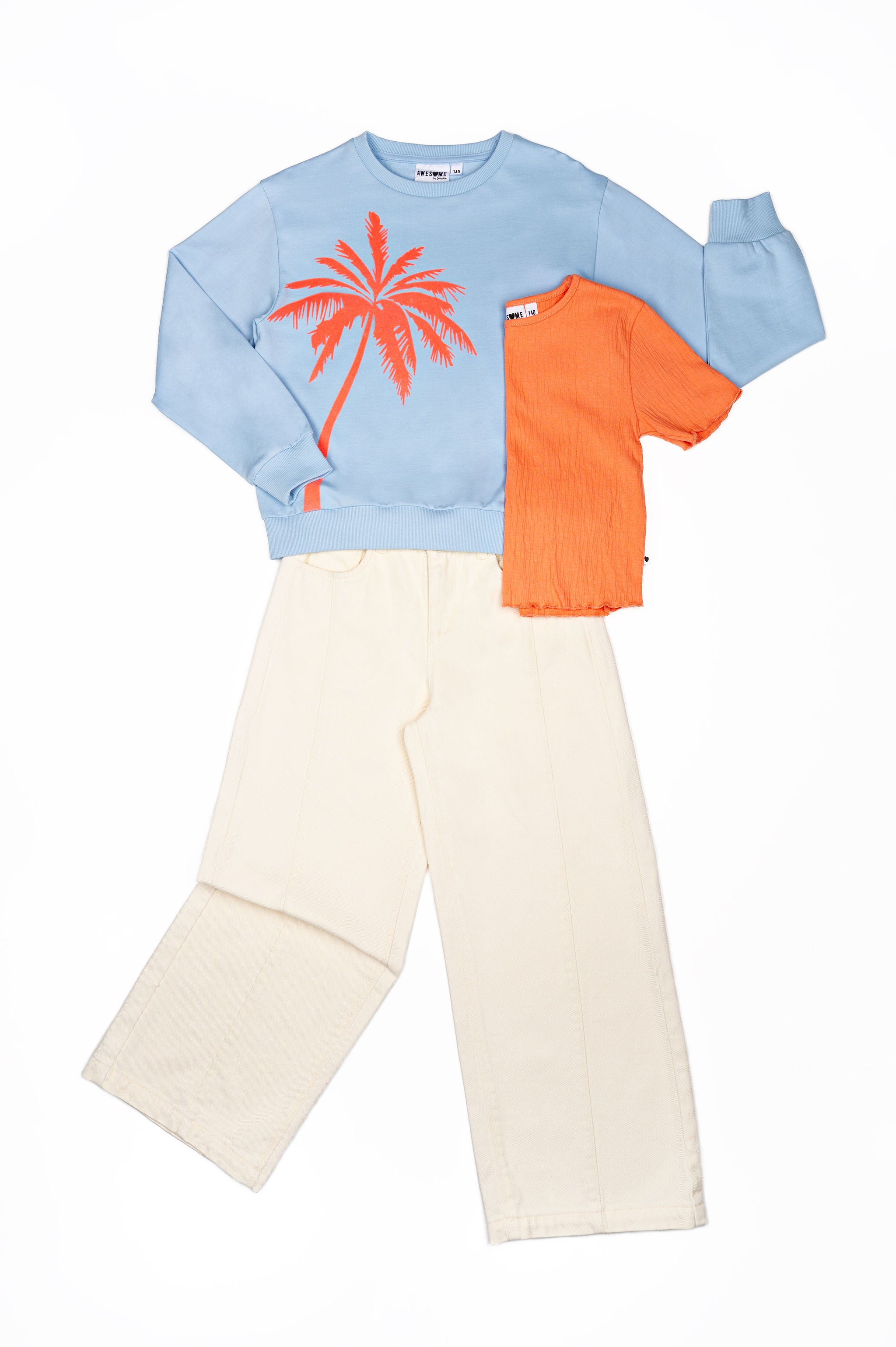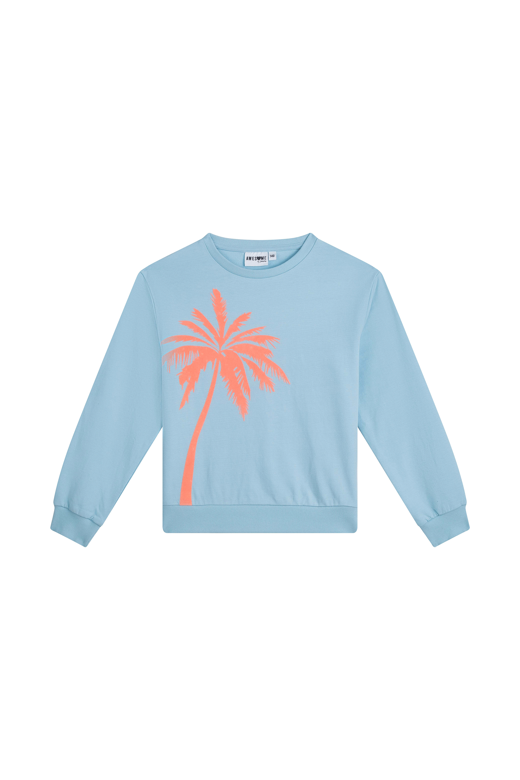 Deze lichtblauwe trui heeft een frisse en speelse uitstraling dankzij de grote feloranje palmboomprint aan de voorkant. Het ontwerp is eenvoudig maar opvallend, met een relaxte pasvorm en afgewerkte boorden die zorgen voor een comfortabele, dagelijkse look. Een ideaal item voor een zonnige, vrolijke stijl.