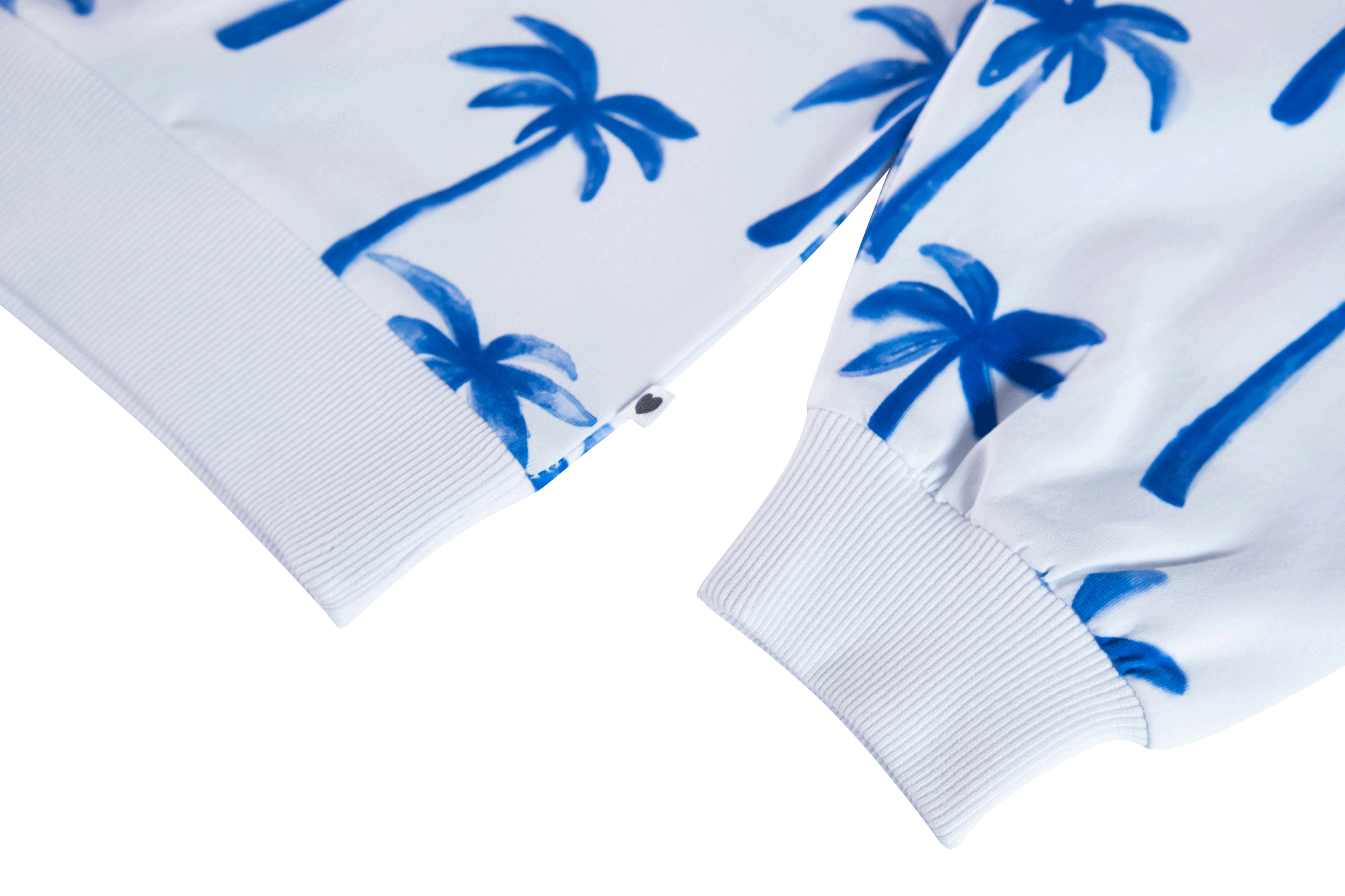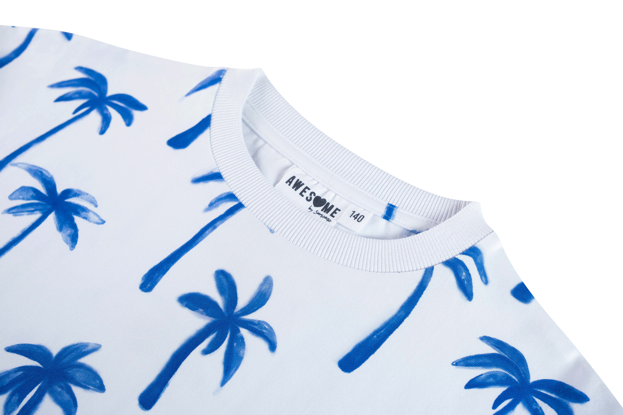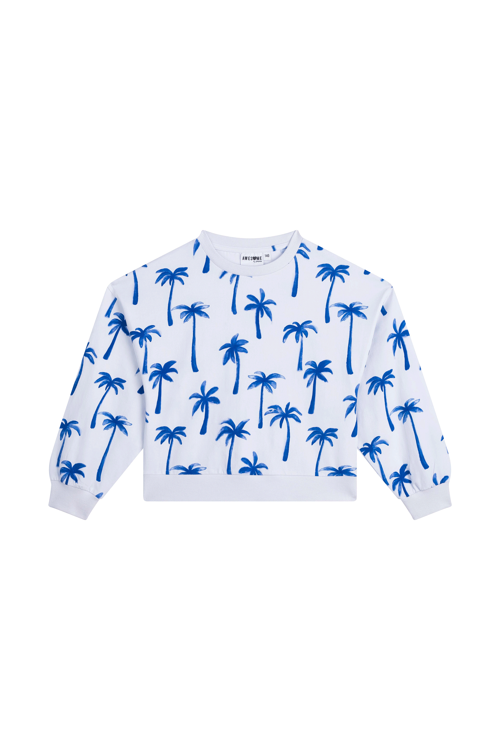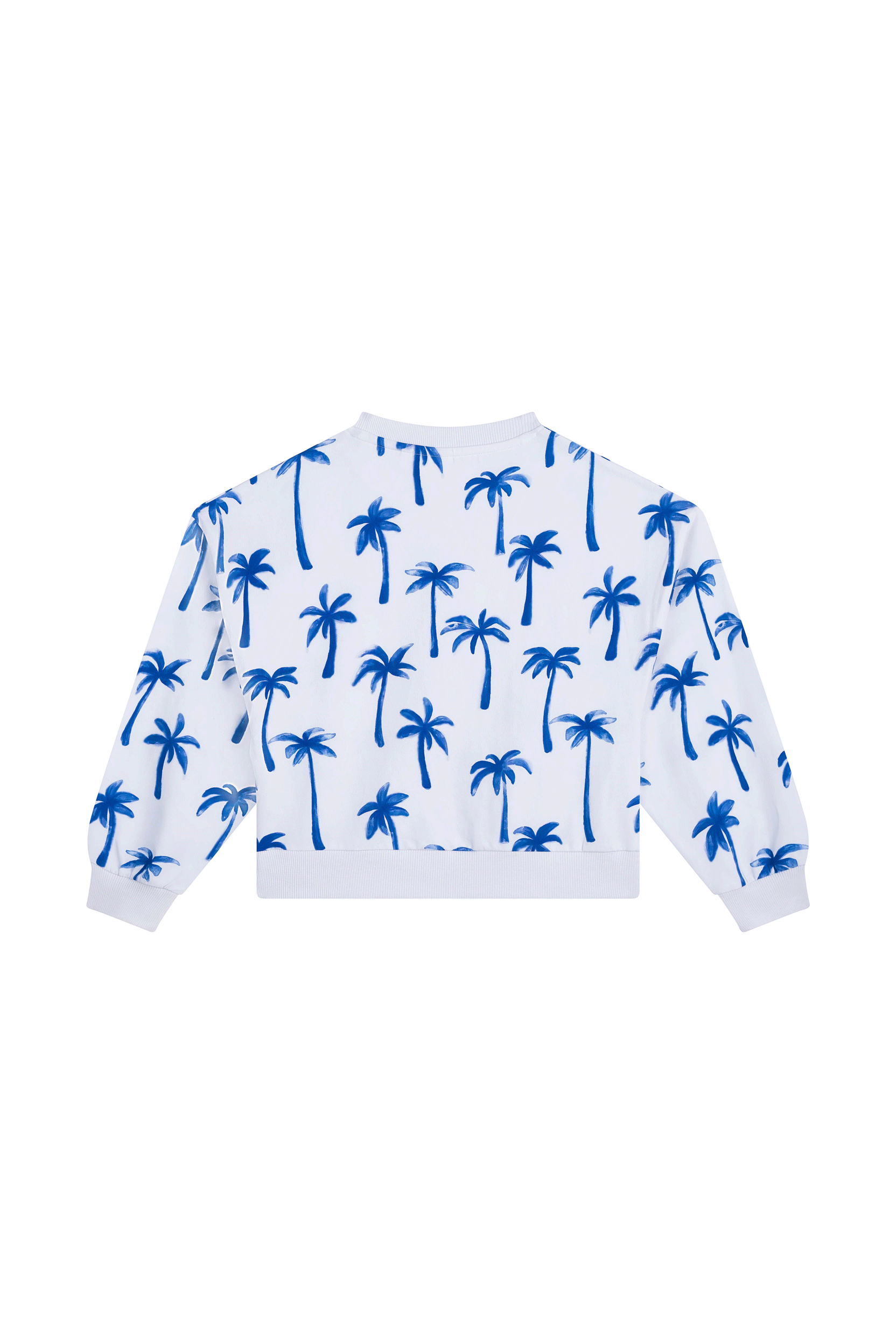 Deze witte trui valt meteen op door de speelse print met felblauwe palmbomen. Het model heeft een rechte pasvorm met een brede boord onderaan, waardoor het een frisse en moderne look krijgt. De all-over print geeft het geheel een vrolijke, zomerse uitstraling – perfect voor een outfit die nét wat extra energie heeft.