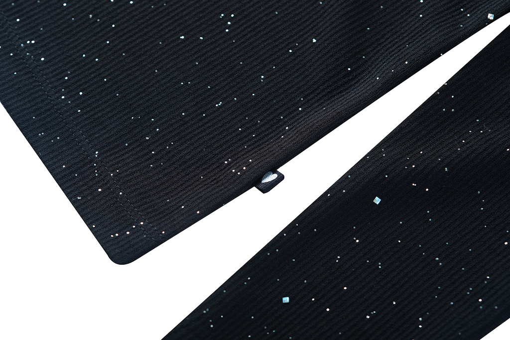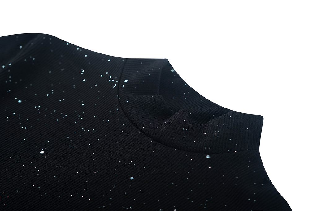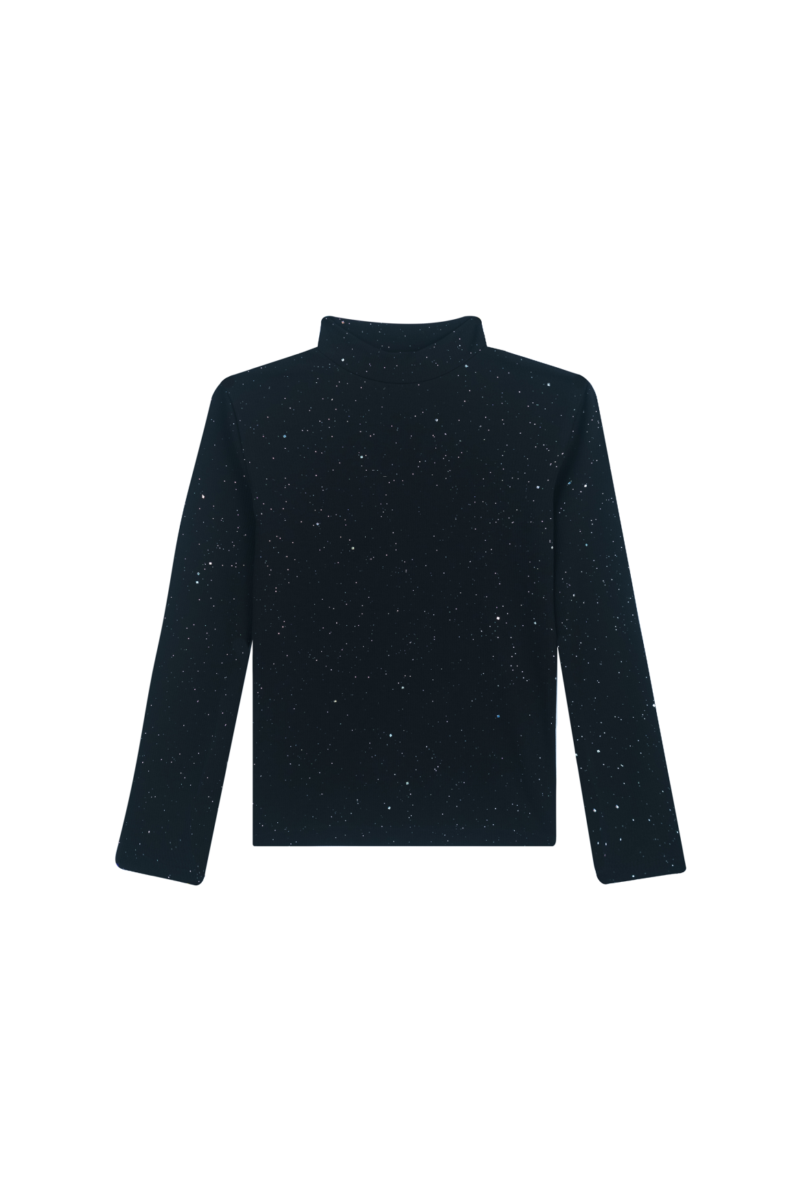 Een zwarte coltrui met lange mouwen en een subtiel gespikkeld sterren-effect. De top heeft een moderne, aansluitende pasvorm en voelt zacht en comfortabel aan. Perfect om casual te dragen, maar ook ideaal om een outfit een unieke en stijlvolle touch te geven.