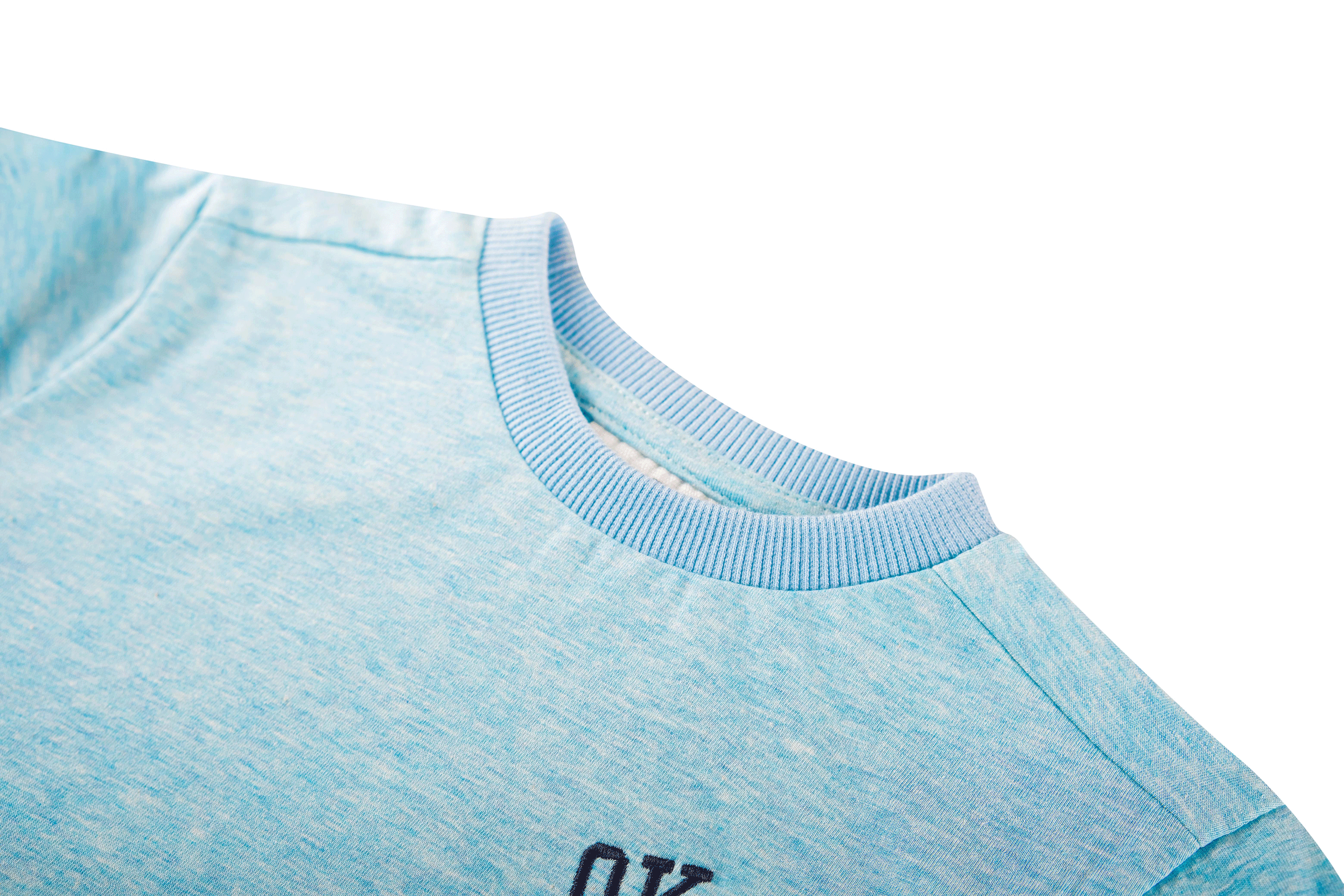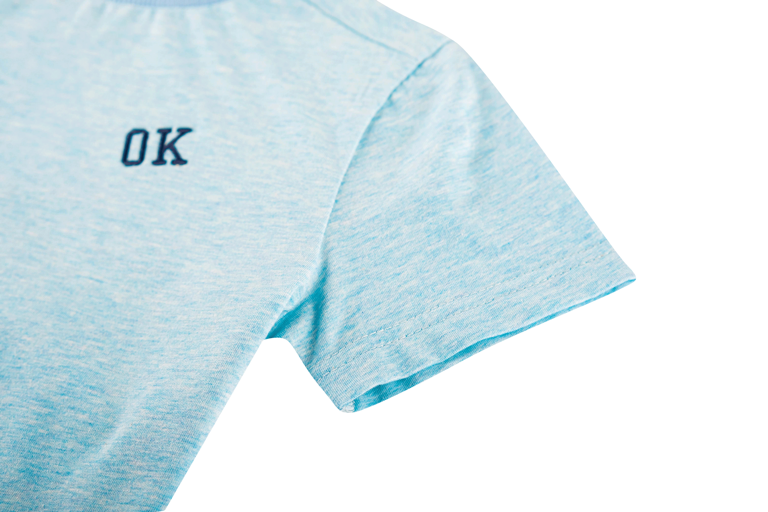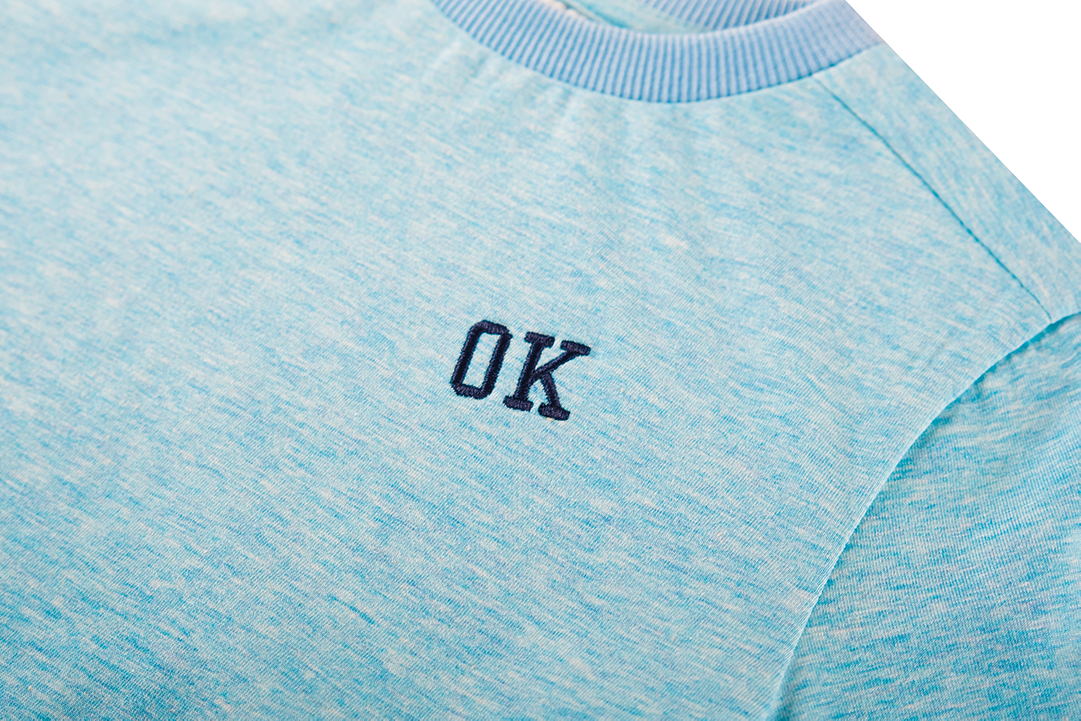 Dit lichtblauwe T-shirt heeft een subtiel gemêleerde look en een kleine “OK”-borduring op de borst voor een speelse touch. De contrasterende ribkraag geeft het ontwerp net dat beetje extra. Een makkelijk te combineren basic die altijd goed zit.