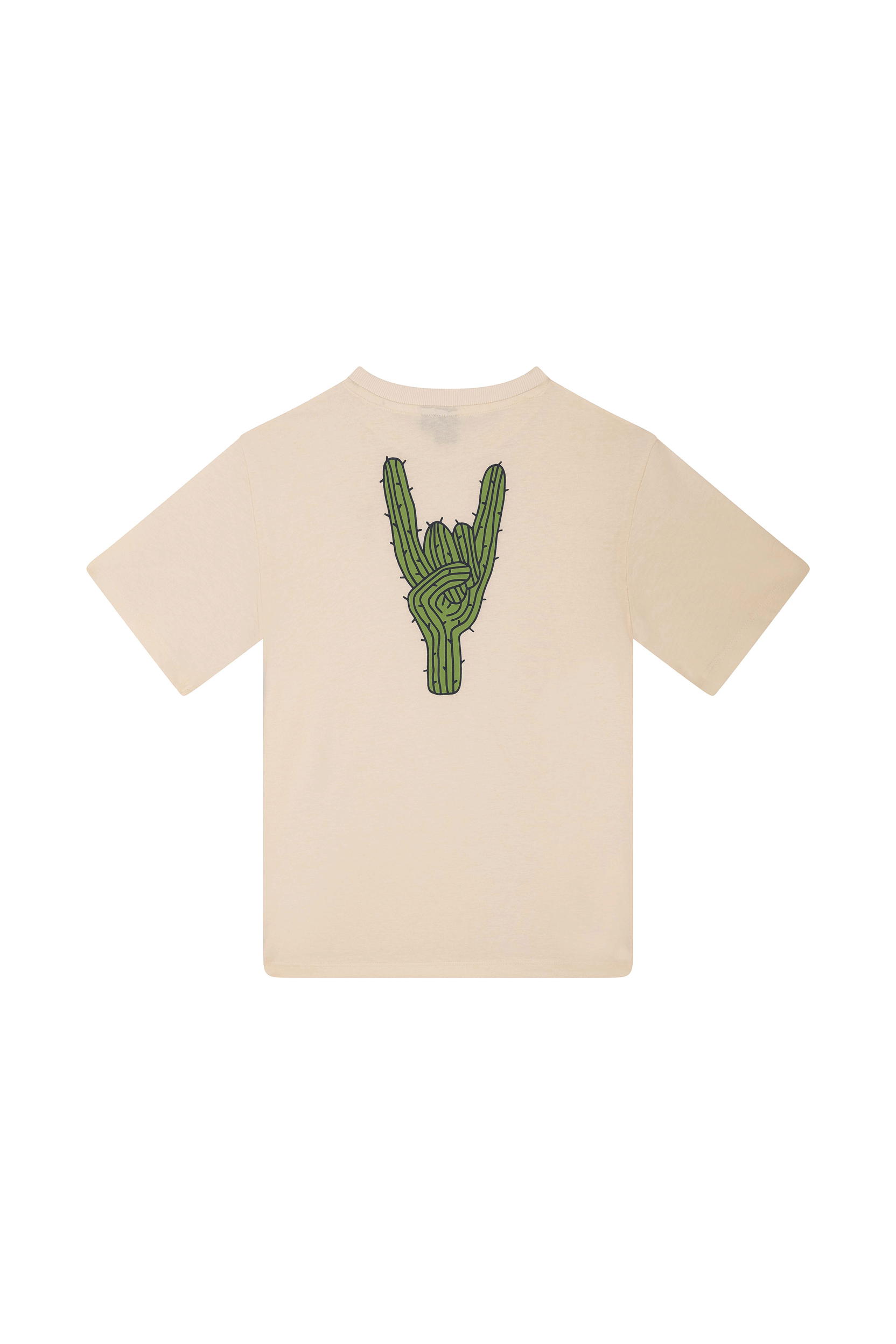 Dit lichte T-shirt heeft een minimalistische look met een grappige twist. Op de borst staat een klein groen handgebaar dat meteen opvalt zonder schreeuwerig te zijn. Het is zo’n item dat je overal bij kunt aantrekken: van een comfortabele jeans tot een korte broek op warme dagen.