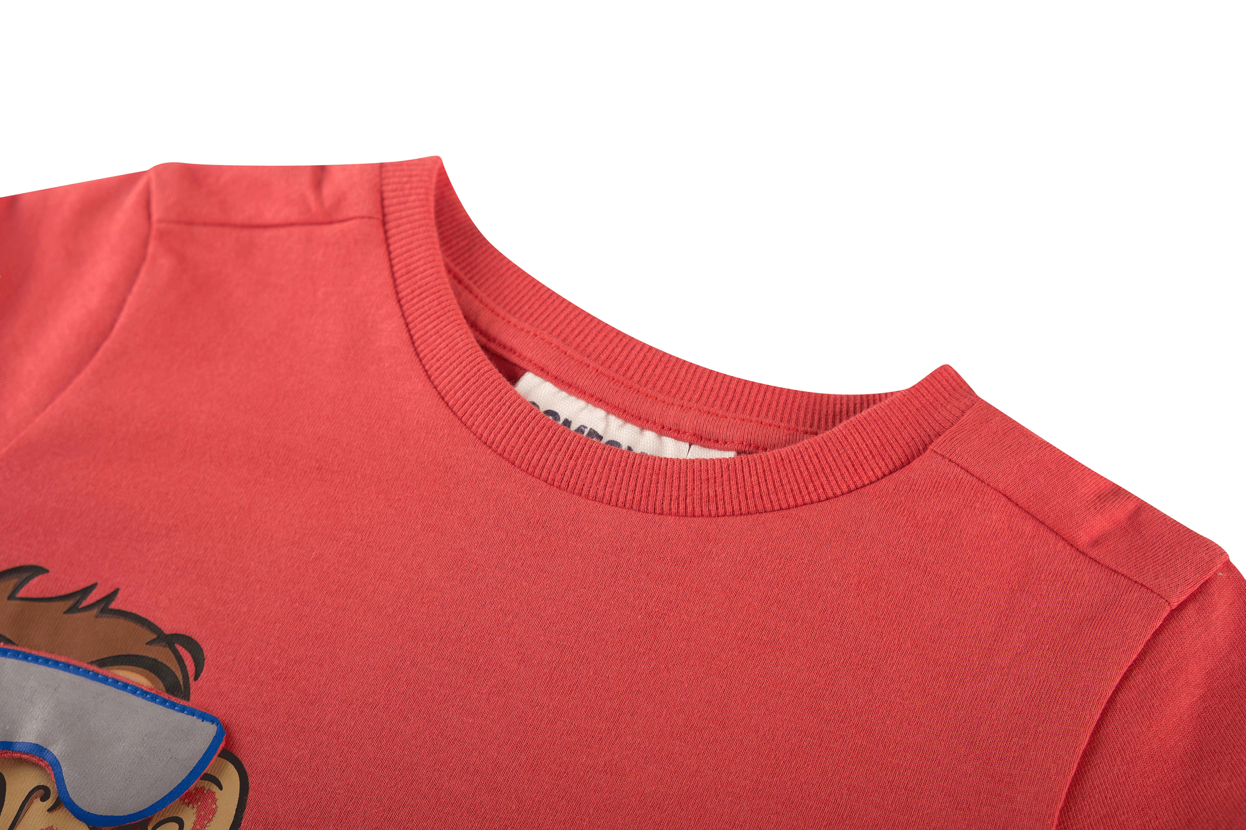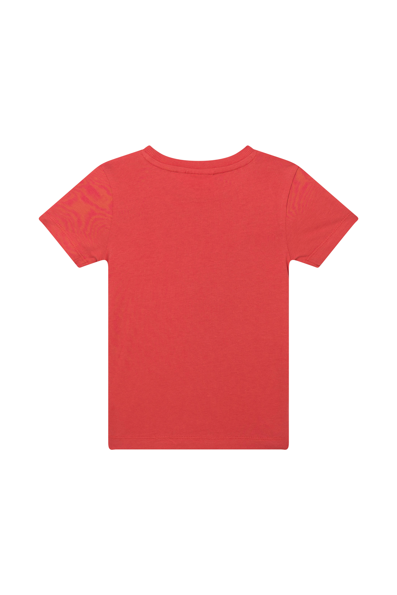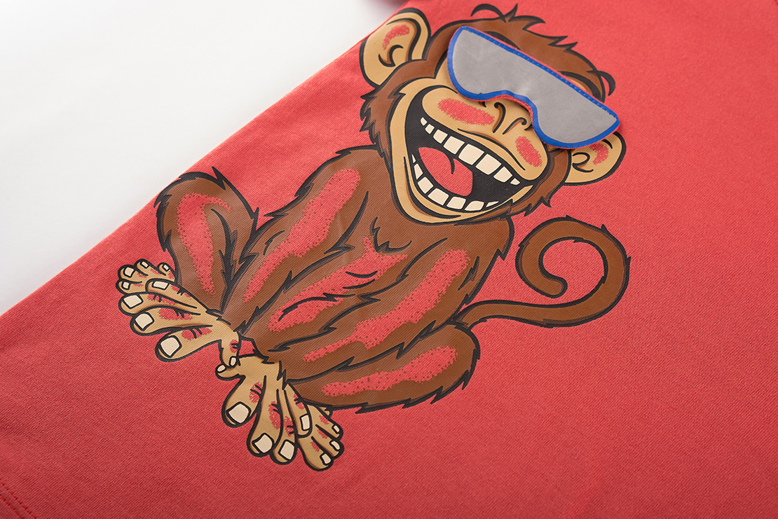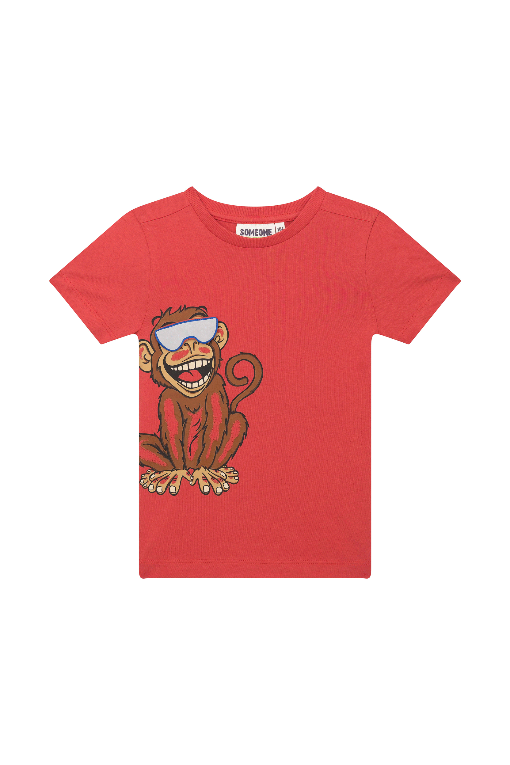 Dit vrolijke rode T-shirt heeft een opvallende print van een lachend aapje met grote zonnebril, wat meteen een speelse en energieke uitstraling geeft. Het ontwerp staat links op de voorkant, waardoor het shirt net dat extra leuke detail krijgt. Perfect voor kinderen die houden van grappige en originele prints en graag een beetje humor in hun outfit verwerken.