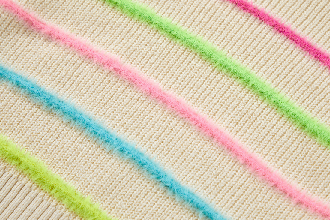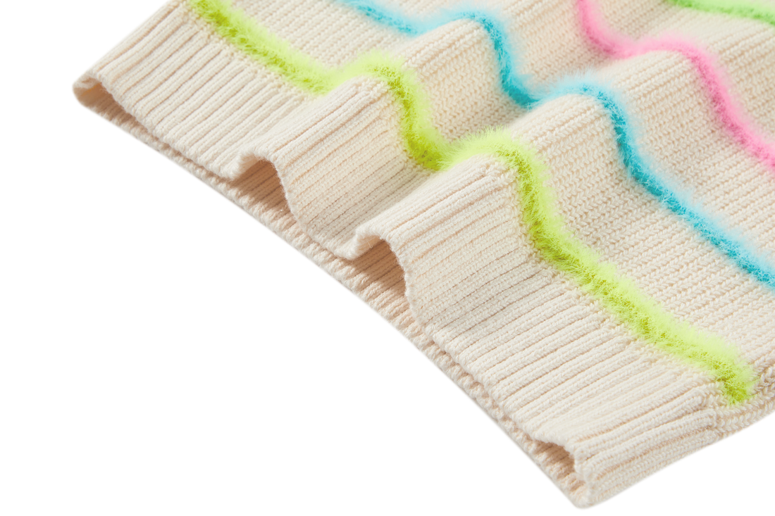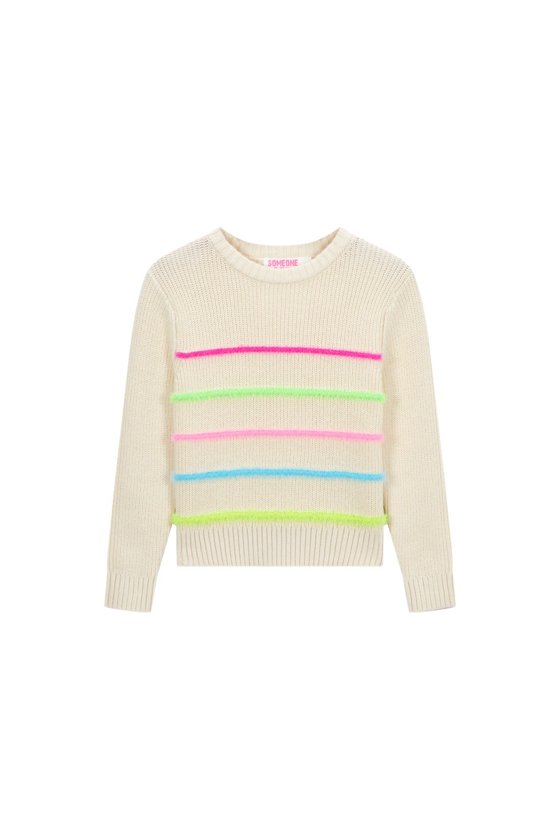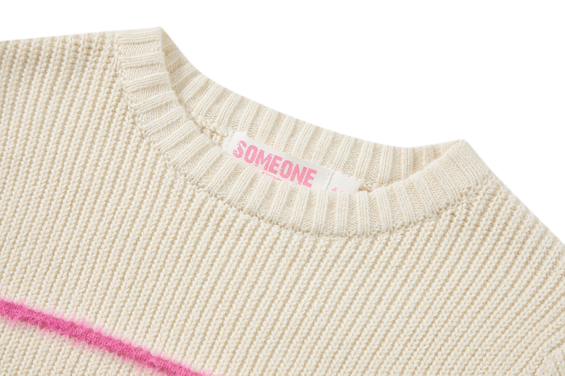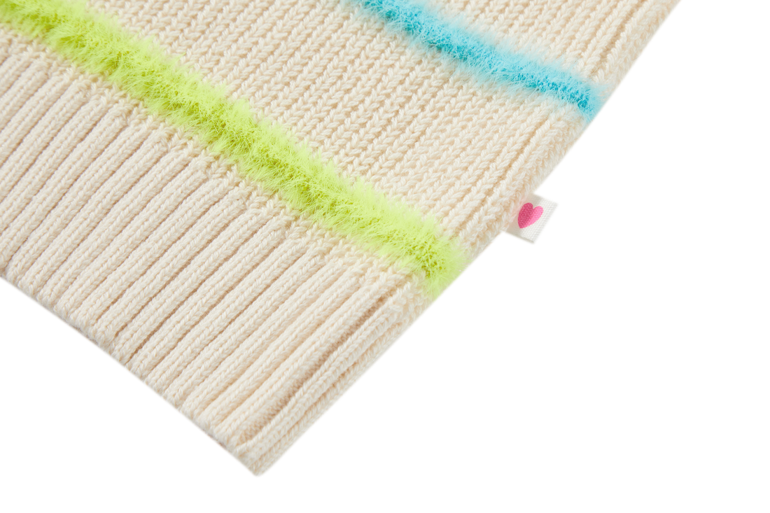 A cosy knit with a fun twist. The bright neon stripes add a pop of personality to the soft neutral base, making this sweater easy to pair yet never boring. Perfect for kids who like their everyday outfits to have a little spark.