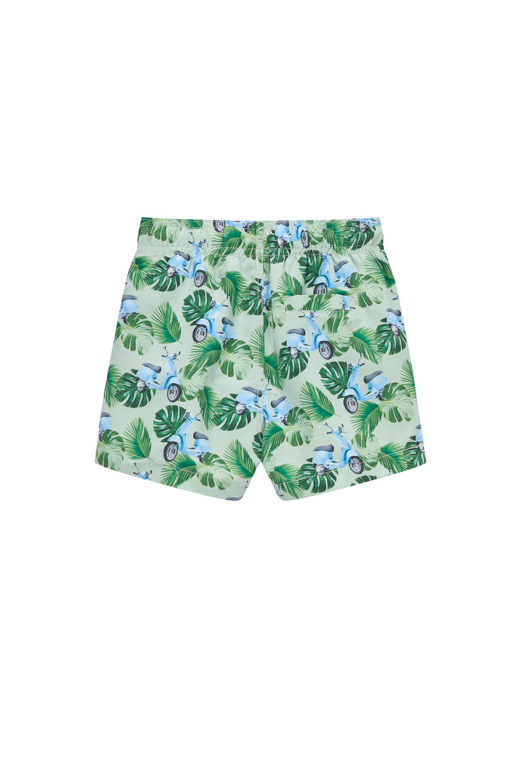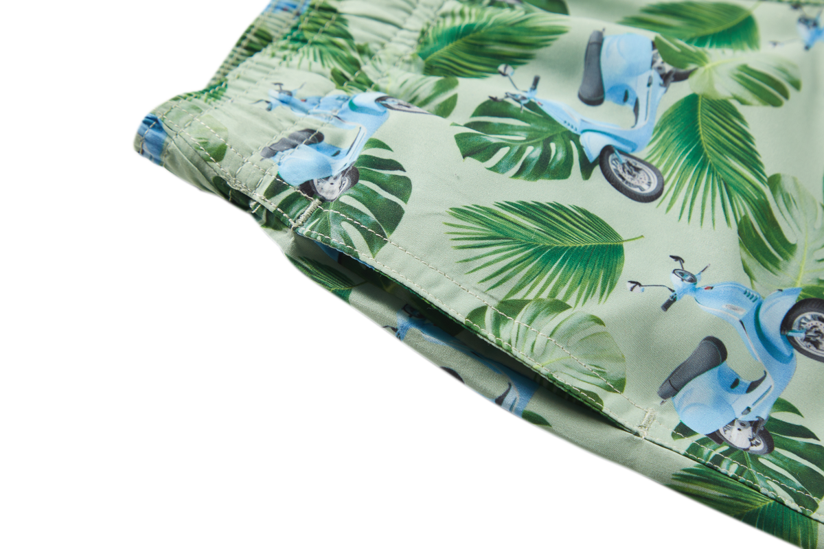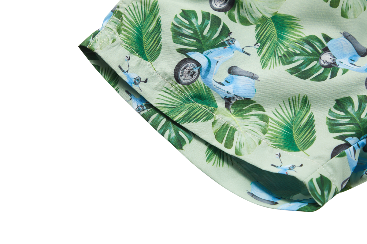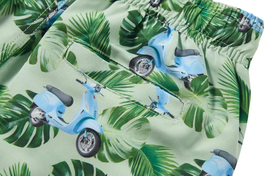 This swim short stands out with its fun print featuring green leaves and light-blue scooters, giving it a bright, summery feel. The adjustable drawstring ensures a secure fit, whether swimming or running around. Its light and comfortable design makes it easy for kids to move freely. A perfect pick for beach days, pool fun, and everything in between.