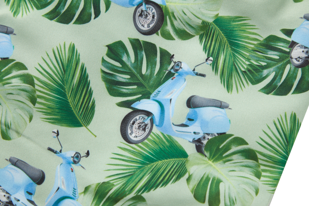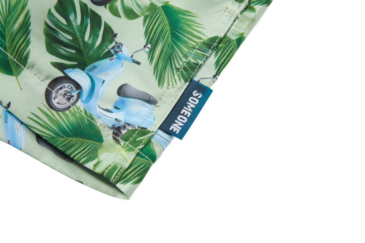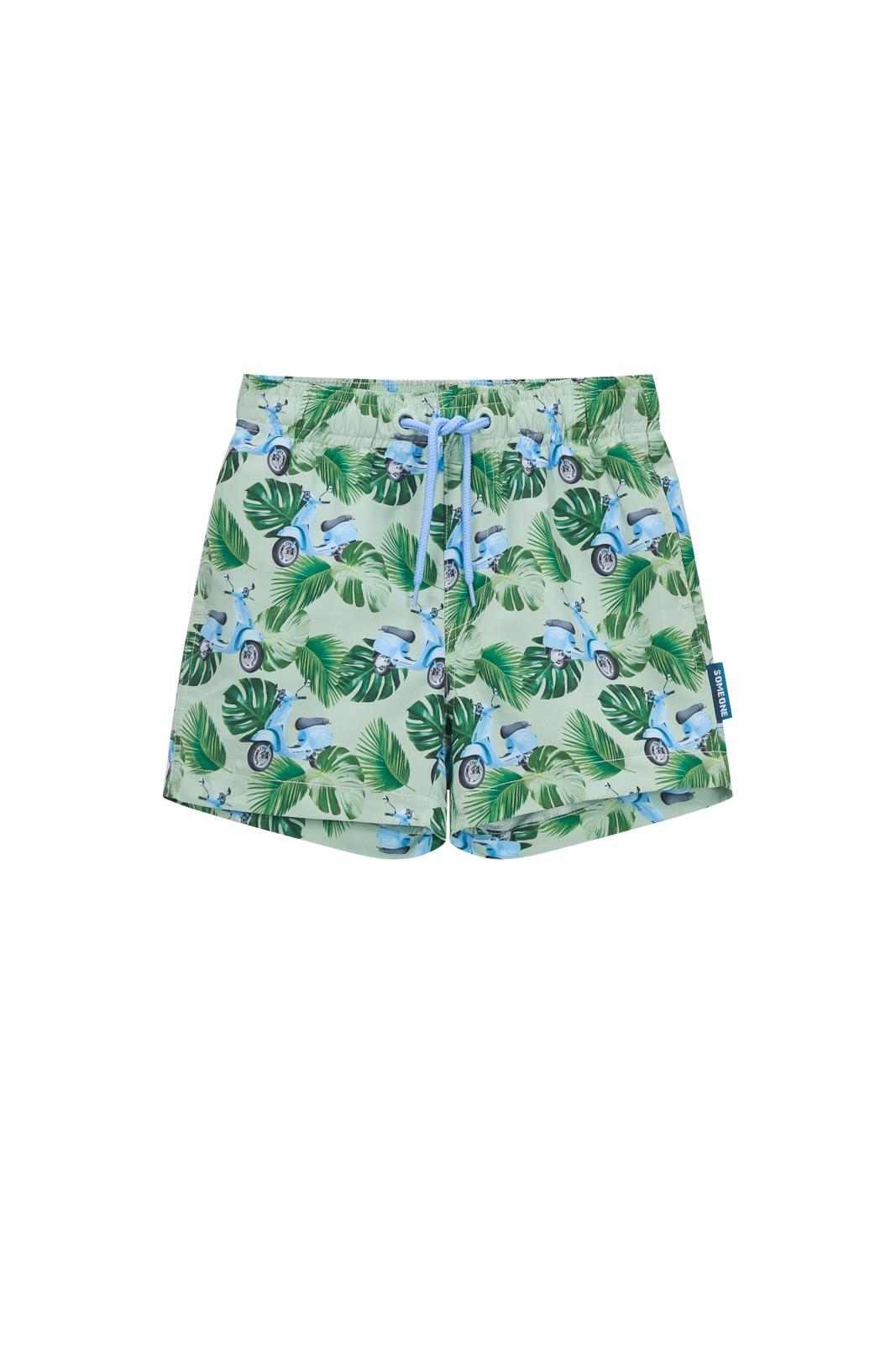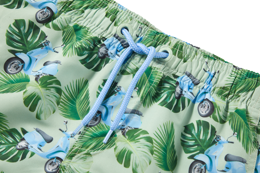 This swim short stands out with its fun print featuring green leaves and light-blue scooters, giving it a bright, summery feel. The adjustable drawstring ensures a secure fit, whether swimming or running around. Its light and comfortable design makes it easy for kids to move freely. A perfect pick for beach days, pool fun, and everything in between.