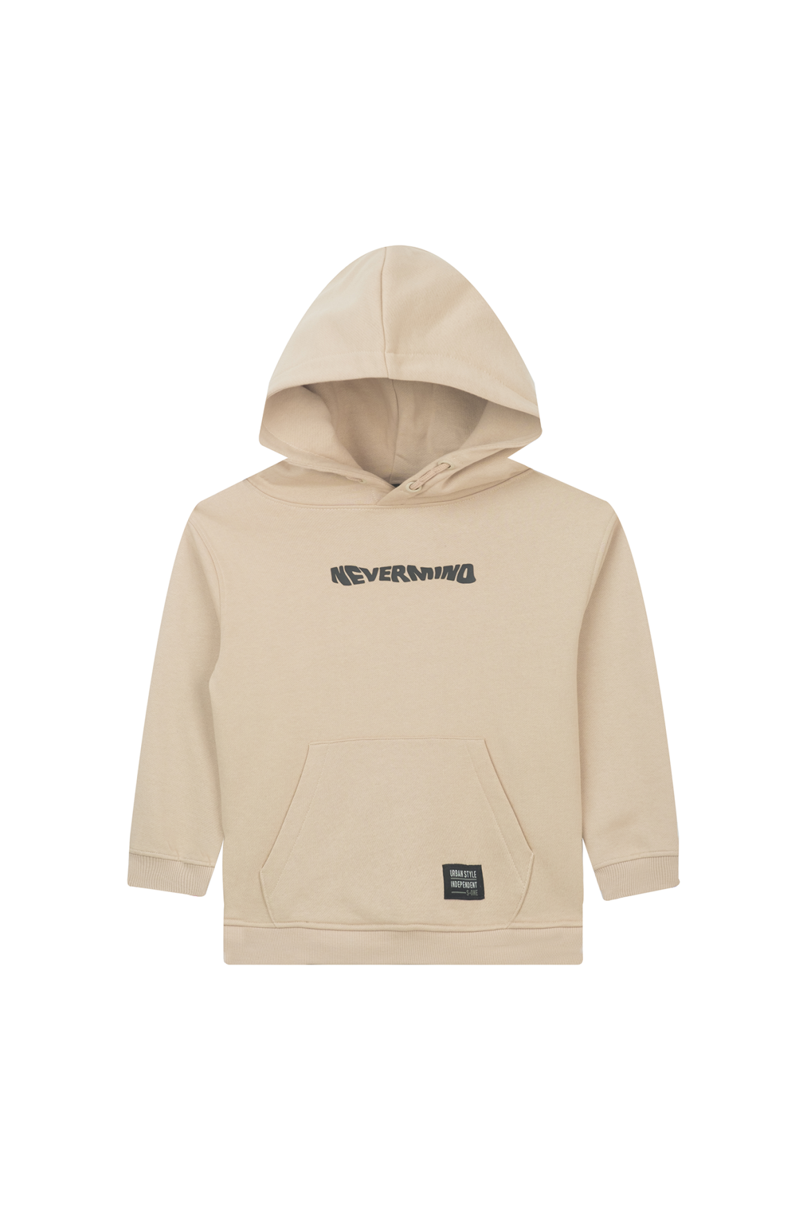 Deze beige hoodie heeft een relaxte en moderne uitstraling, perfect voor elke dag. De grote “NEVERMIND”-print op de borst geeft de trui een stoere en nonchalante vibe. De kangoeroezak zorgt voor extra comfort en maakt de look helemaal af. Dankzij de rustige kleur is hij makkelijk te combineren met elke outfit, terwijl de capuchon zorgt voor een casual en speels accent. Een fijne hoodie voor kinderen die houden van eenvoud met een beetje attitude.