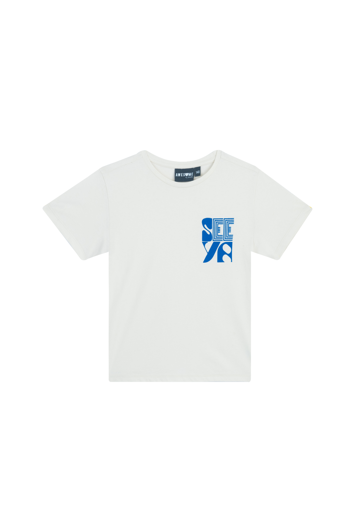 Dit frisse witte T-shirt heeft een opvallende blauwe SEE YA print op de borst, wat zorgt voor een moderne en speelse uitstraling. Het minimalistische ontwerp maakt het een veelzijdig item dat makkelijk te combineren is met elke outfit. Perfect voor dagelijks gebruik, zomerse dagen of casual momenten waarop een subtiele maar coole look gewenst is.