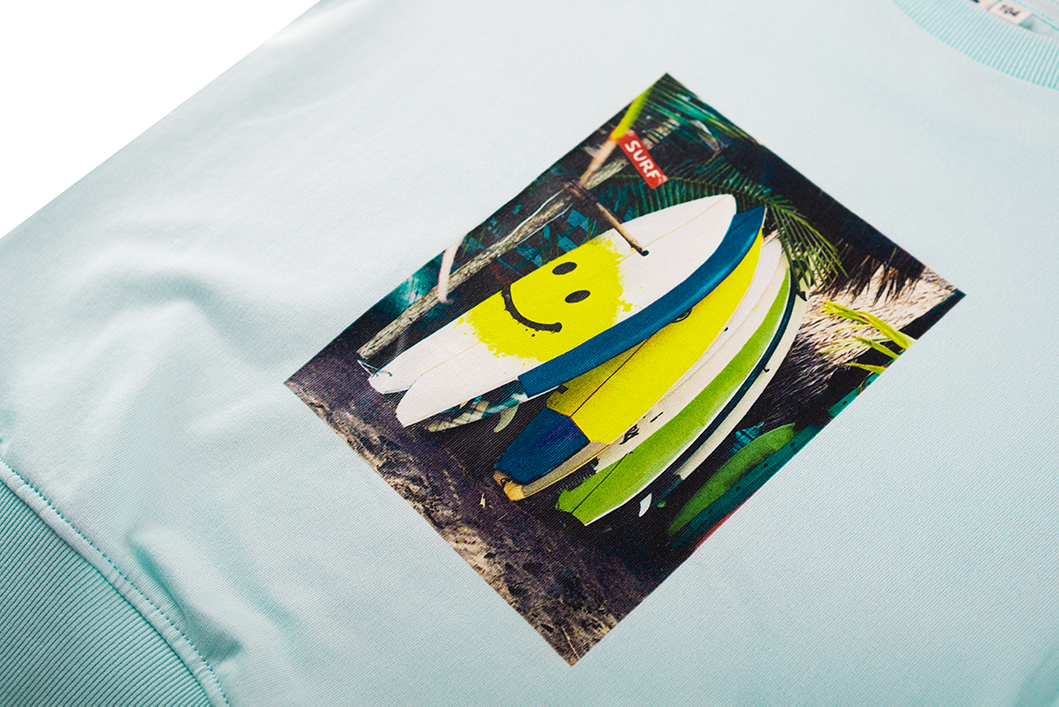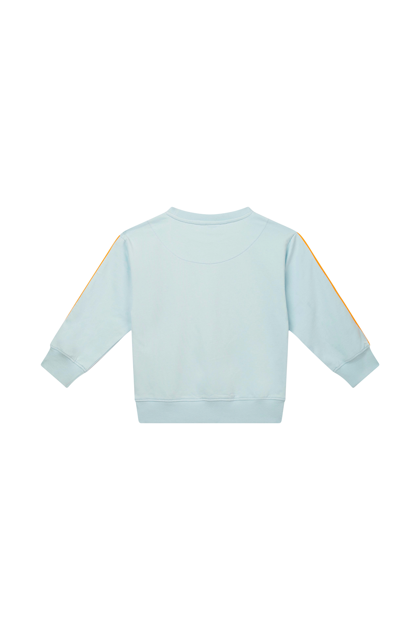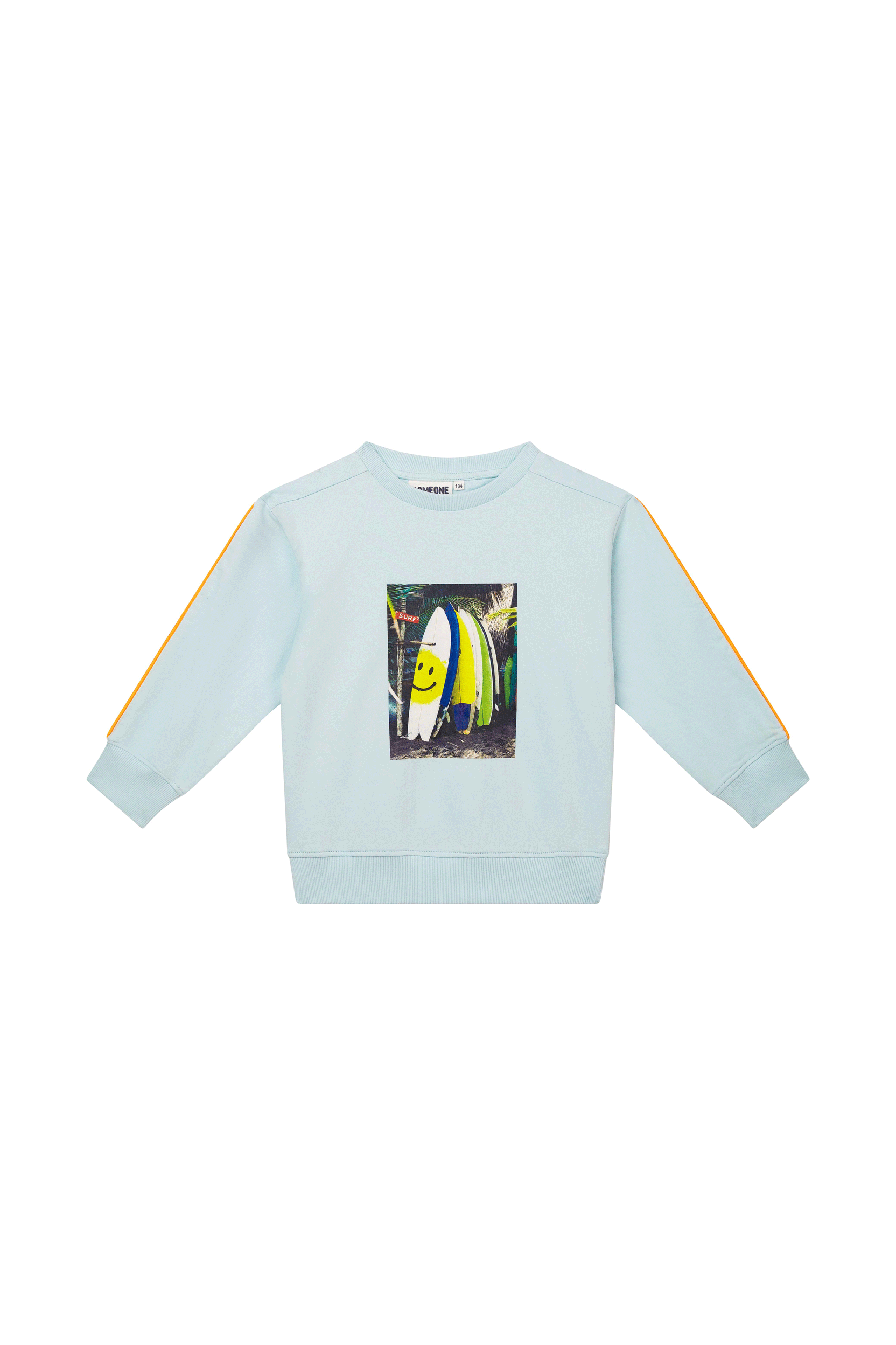 Deze lichtblauwe sweater brengt direct zomerse vibes met zich mee dankzij de kleurrijke surfboards op de voorkant, inclusief een vrolijke smiley voor een speelse touch. De contrasterende oranje strepen op de mouwen geven het geheel een sportieve en frisse uitstraling. De relaxte pasvorm maakt hem ideaal voor zowel schooldagen als avonturen buiten. Een perfecte keuze voor kinderen die houden van strand, fun en opvallende details.