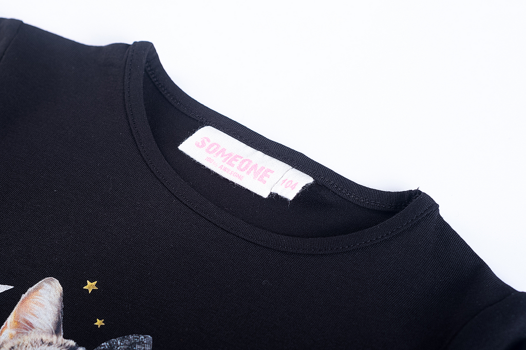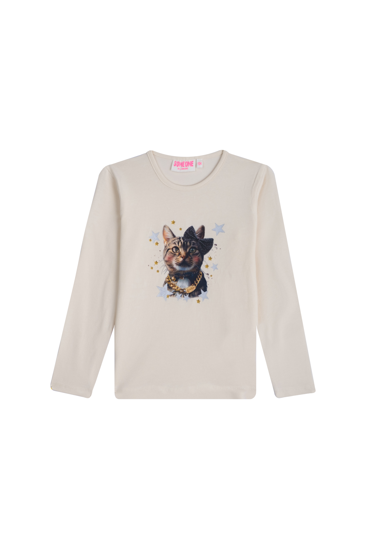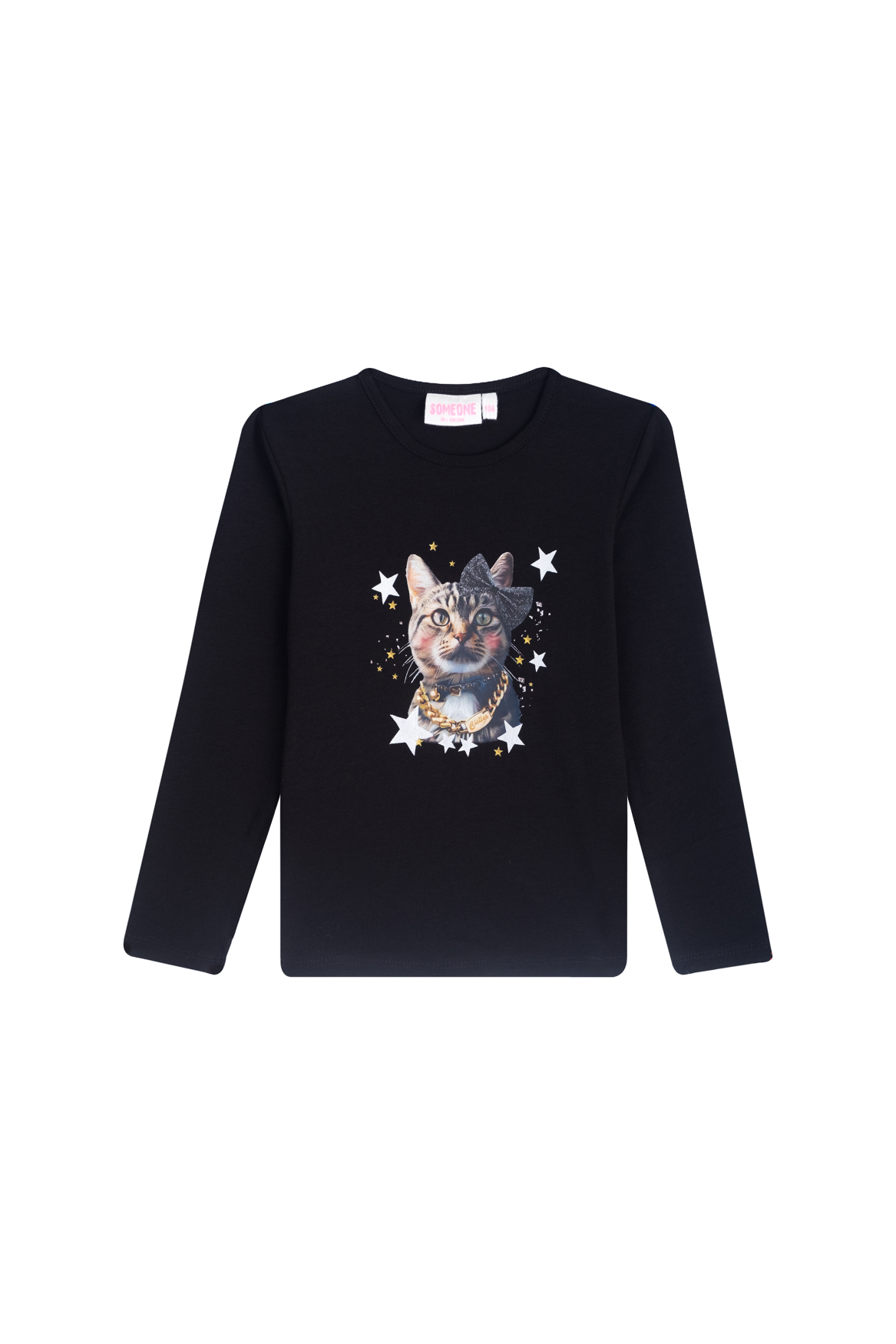 Deze zwarte longsleeve is een echte eyecatcher voor meisjes die houden van katten en stijl. De gedetailleerde print van een kat met blosjes, een glinsterende strik en gouden ketting straalt karakter en speelsheid uit. De omliggende sterretjes geven het geheel een magische toets, perfect voor een outfit met flair. Ideaal om te dragen op school, tijdens een feestje of gewoon om een gewone dag bijzonder te maken. Een uniek shirt dat mode en fantasie op een grappige manier samenbrengt en gegarandeerd een glimlach oproept.