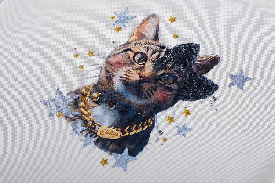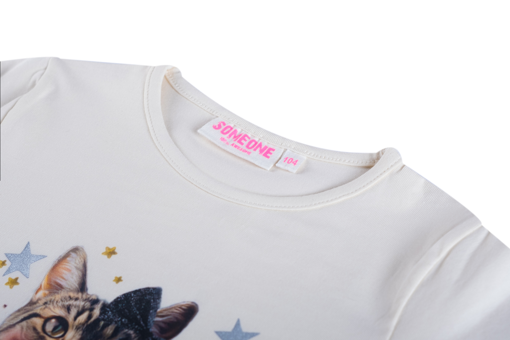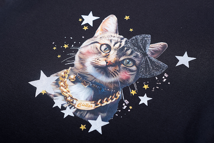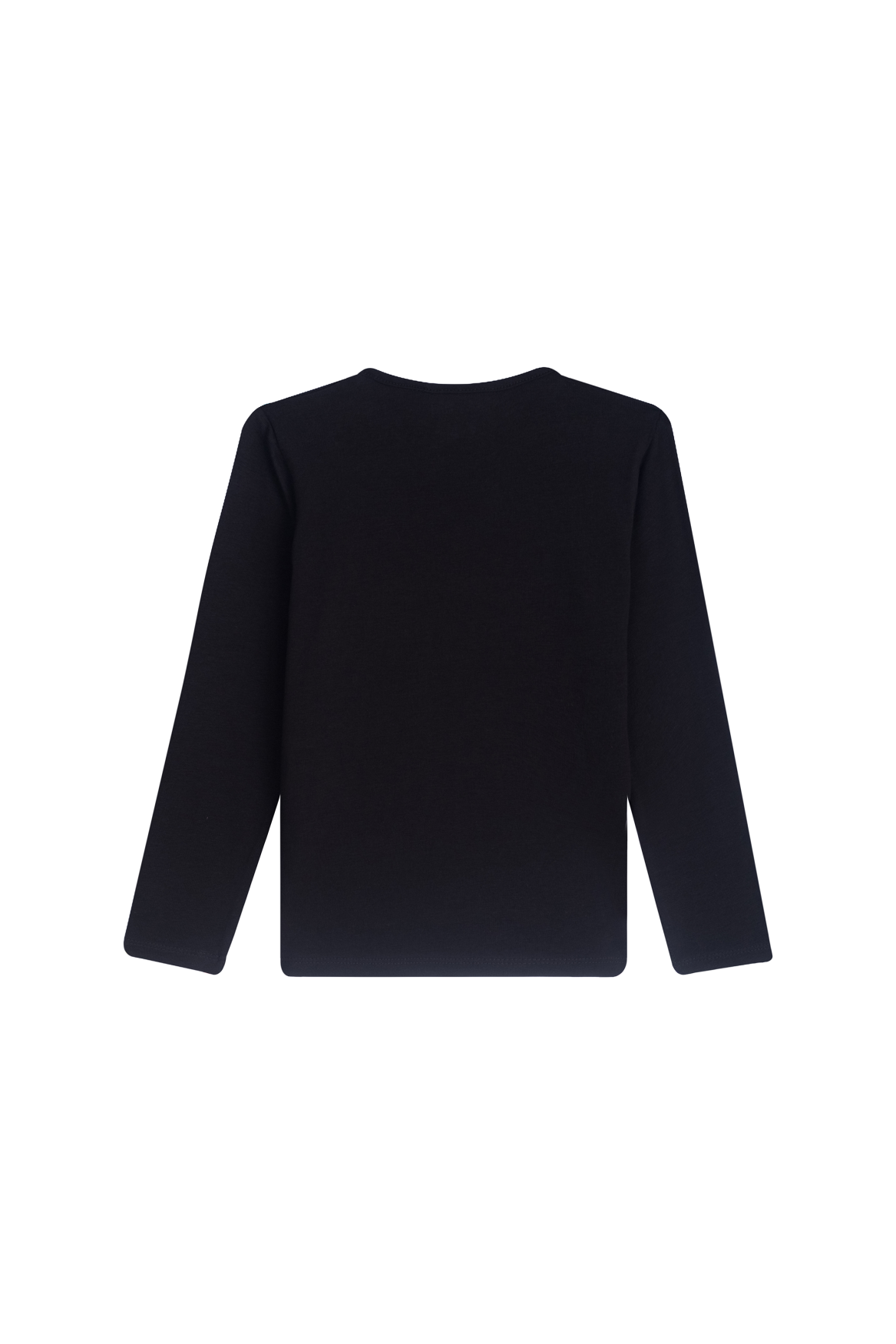 Deze zwarte longsleeve is een echte eyecatcher voor meisjes die houden van katten en stijl. De gedetailleerde print van een kat met blosjes, een glinsterende strik en gouden ketting straalt karakter en speelsheid uit. De omliggende sterretjes geven het geheel een magische toets, perfect voor een outfit met flair. Ideaal om te dragen op school, tijdens een feestje of gewoon om een gewone dag bijzonder te maken. Een uniek shirt dat mode en fantasie op een grappige manier samenbrengt en gegarandeerd een glimlach oproept.