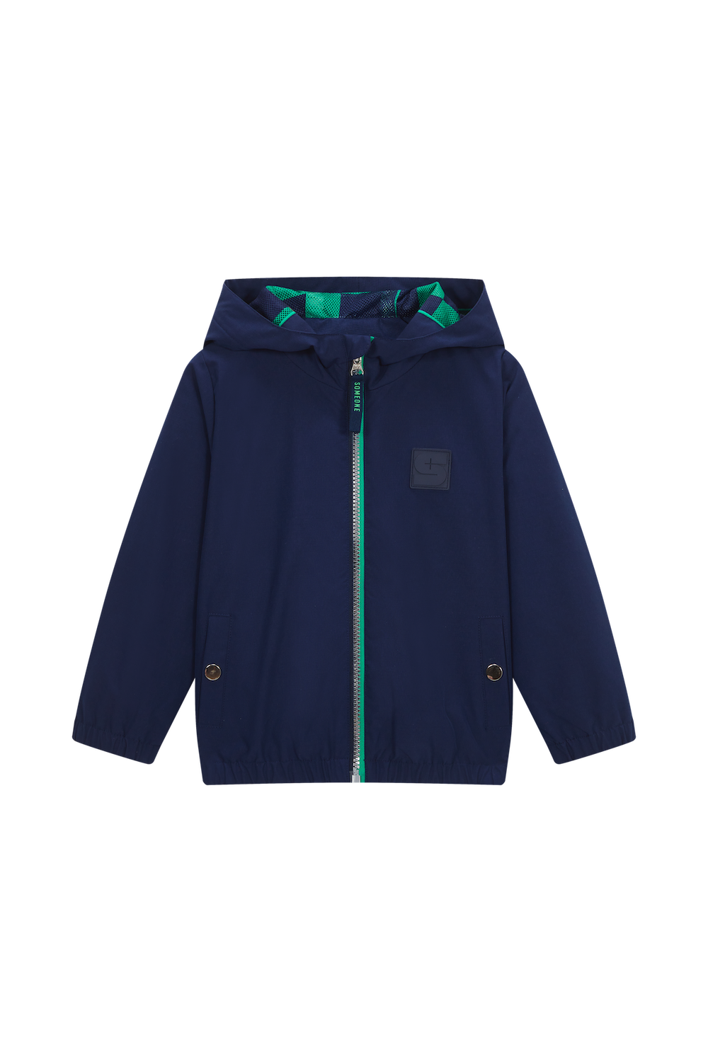 Deze donkerblauwe jas heeft een tijdloze uitstraling en is ideaal voor frisse dagen. De capuchon en de ritssluiting met contrasterende groene details geven het geheel net wat extra karakter. De drukknopen op de zakken zorgen ervoor dat kleine spullen veilig opgeborgen blijven, wat handig is tijdens wandelingen of schooldagen. Het is een praktische jas die makkelijk te combineren is met allerlei outfits en daardoor snel een favoriet wordt.